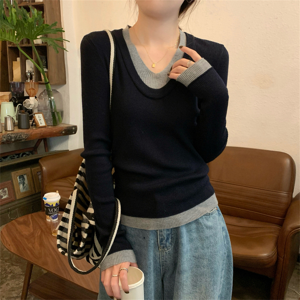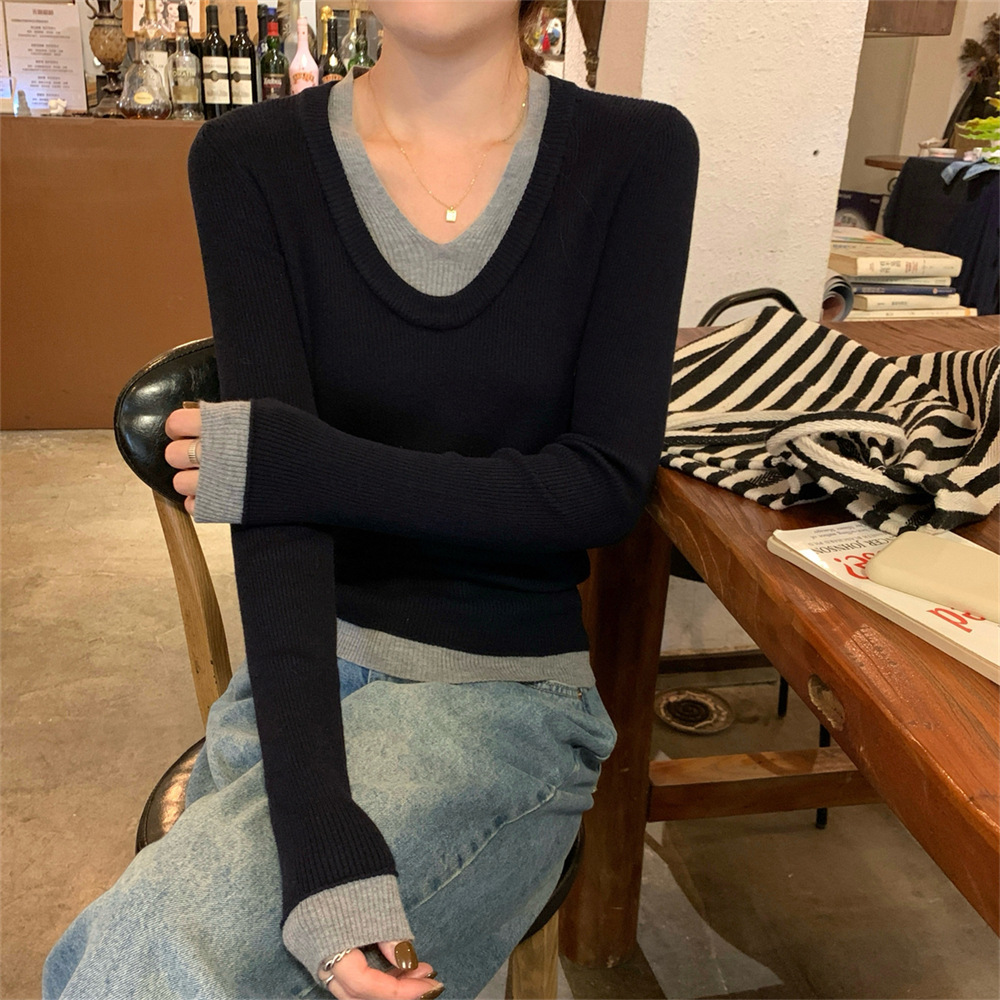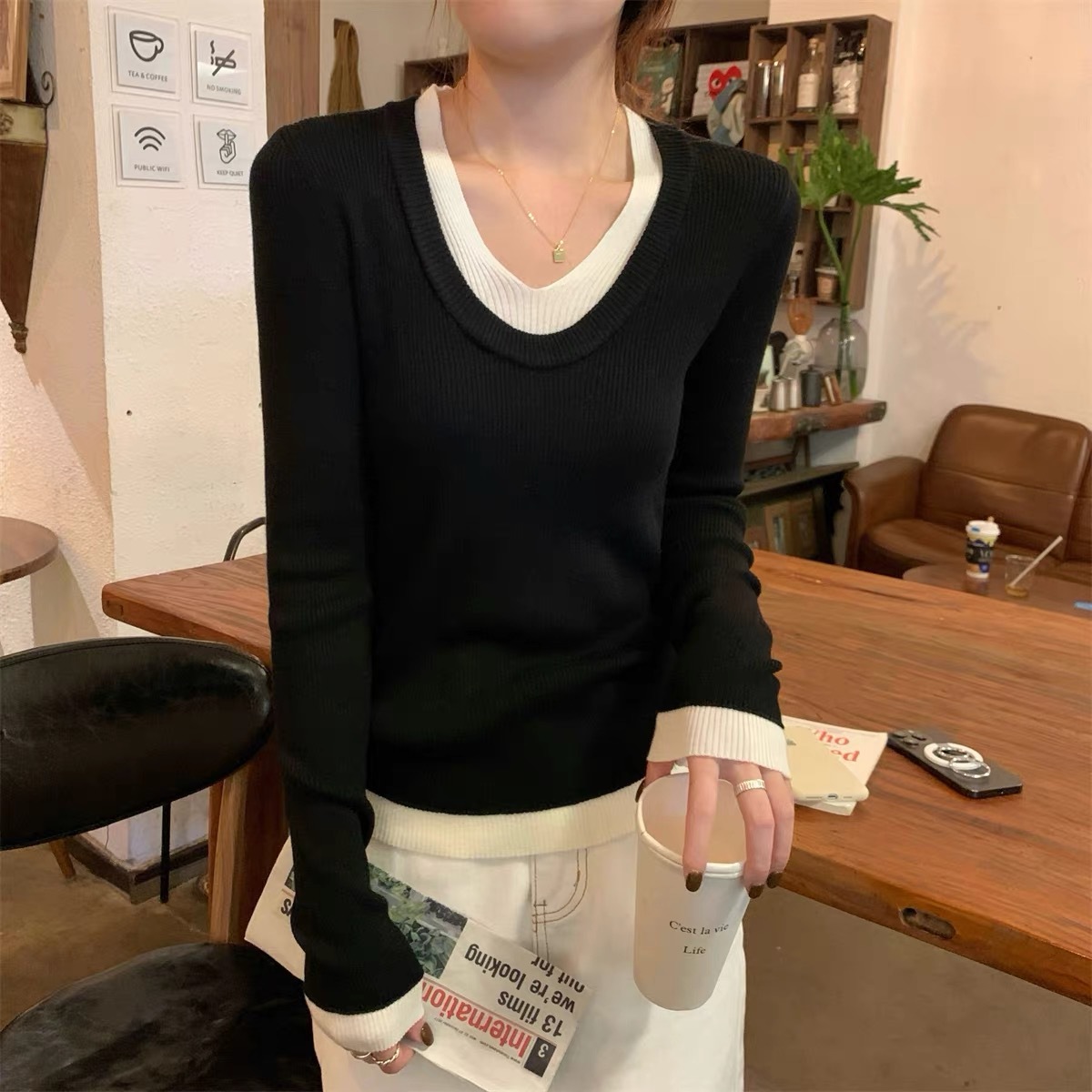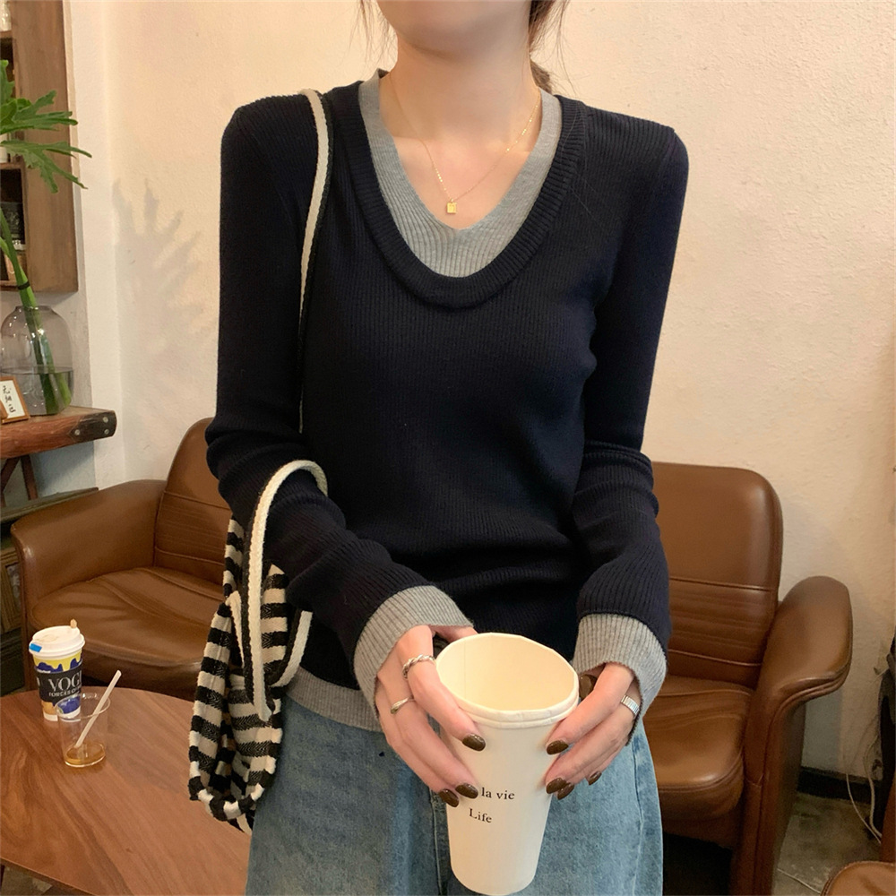 여성을위한 가짜 투피스 대비 색상 U 넥 니트 바닥 셔츠 가을, 겨울 새로운 한국 스타일 내부 슬림 스웨터 하이 엔드 탑스토어 가기