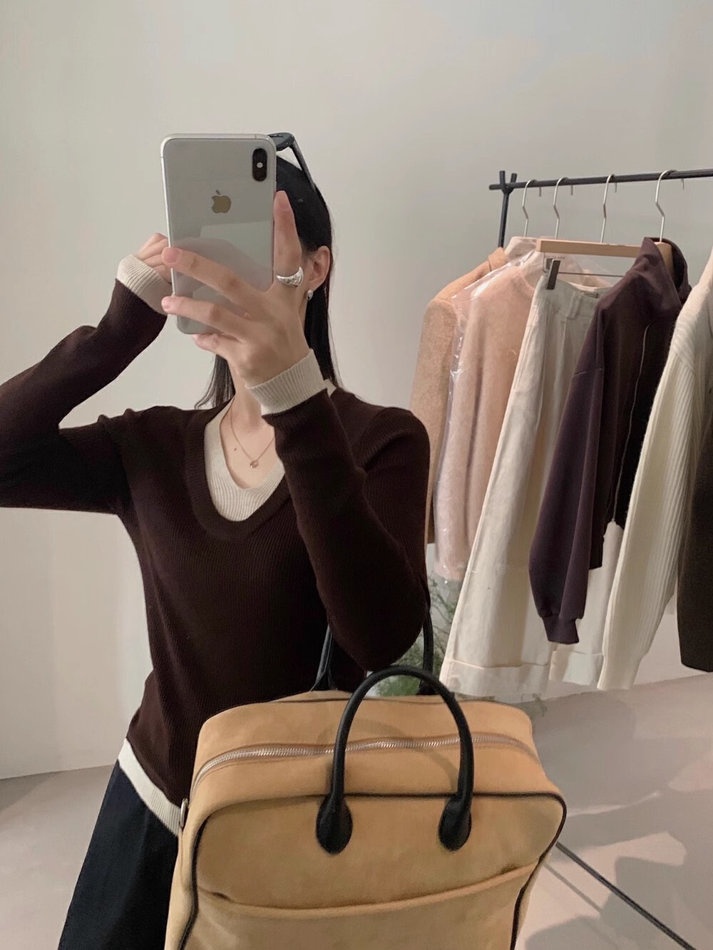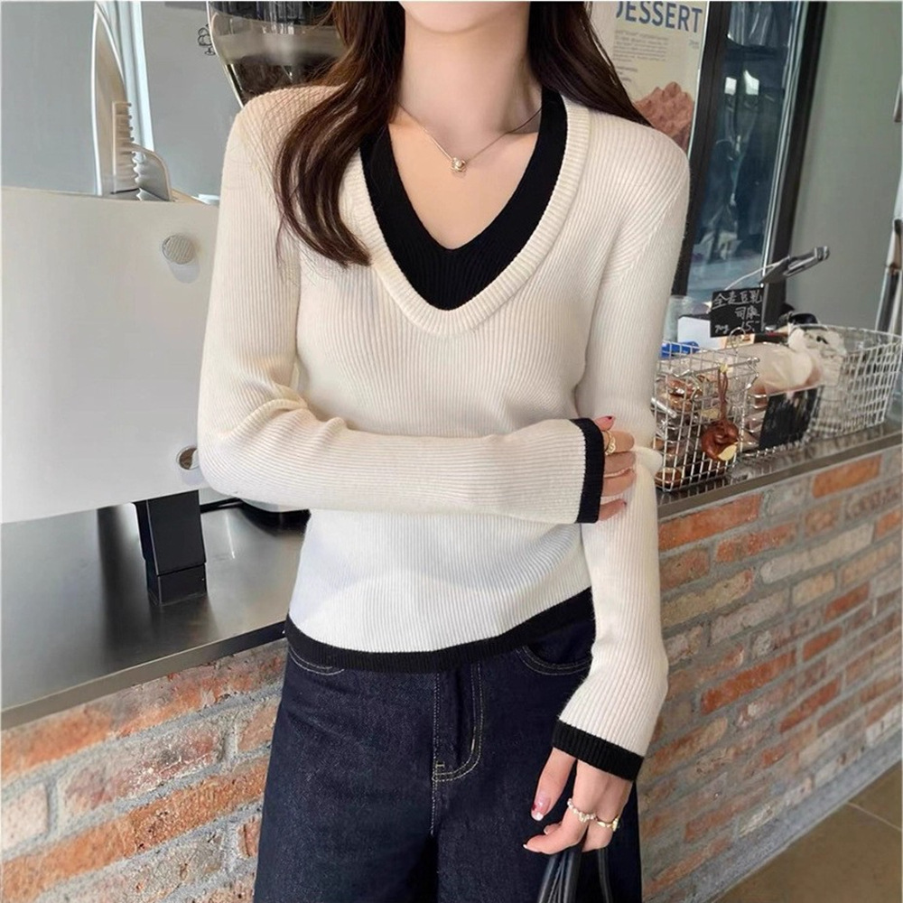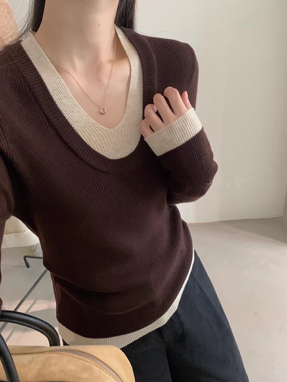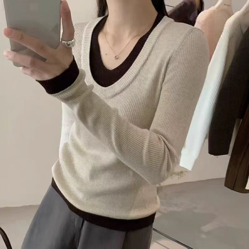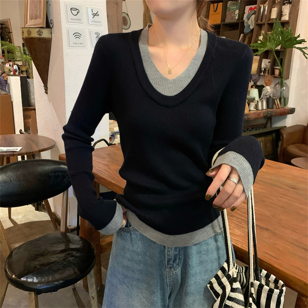 여성을위한 가짜 투피스 대비 색상 U 넥 니트 바닥 셔츠 가을, 겨울 새로운 한국 스타일 내부 슬림 스웨터 하이 엔드 탑스토어 가기