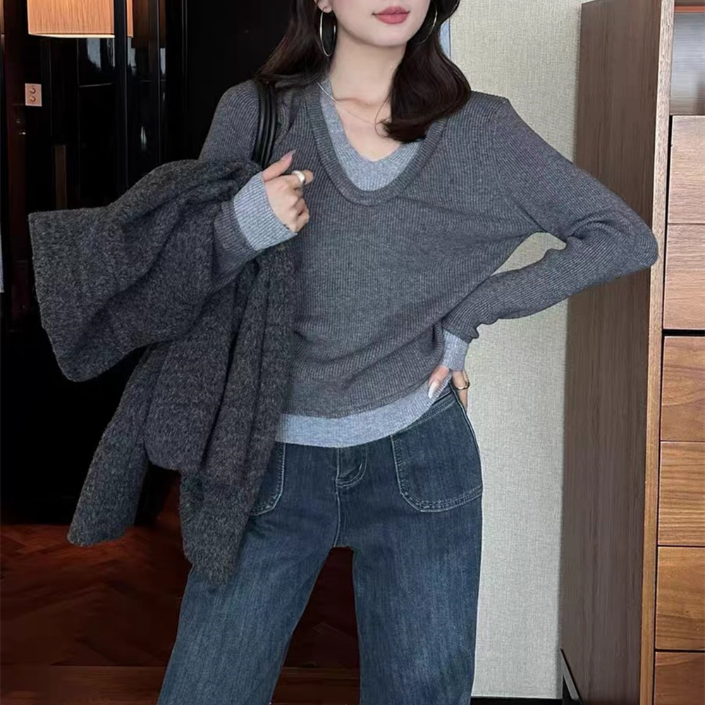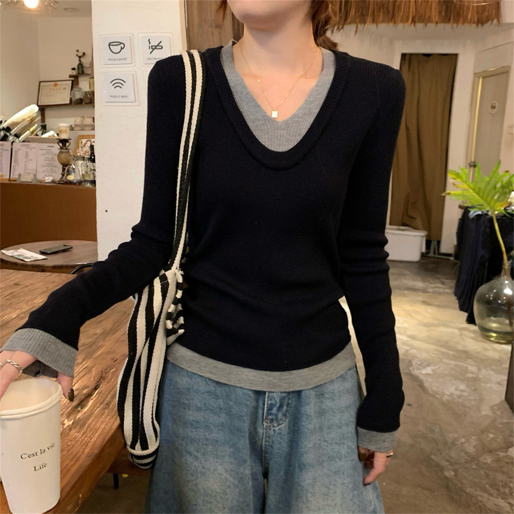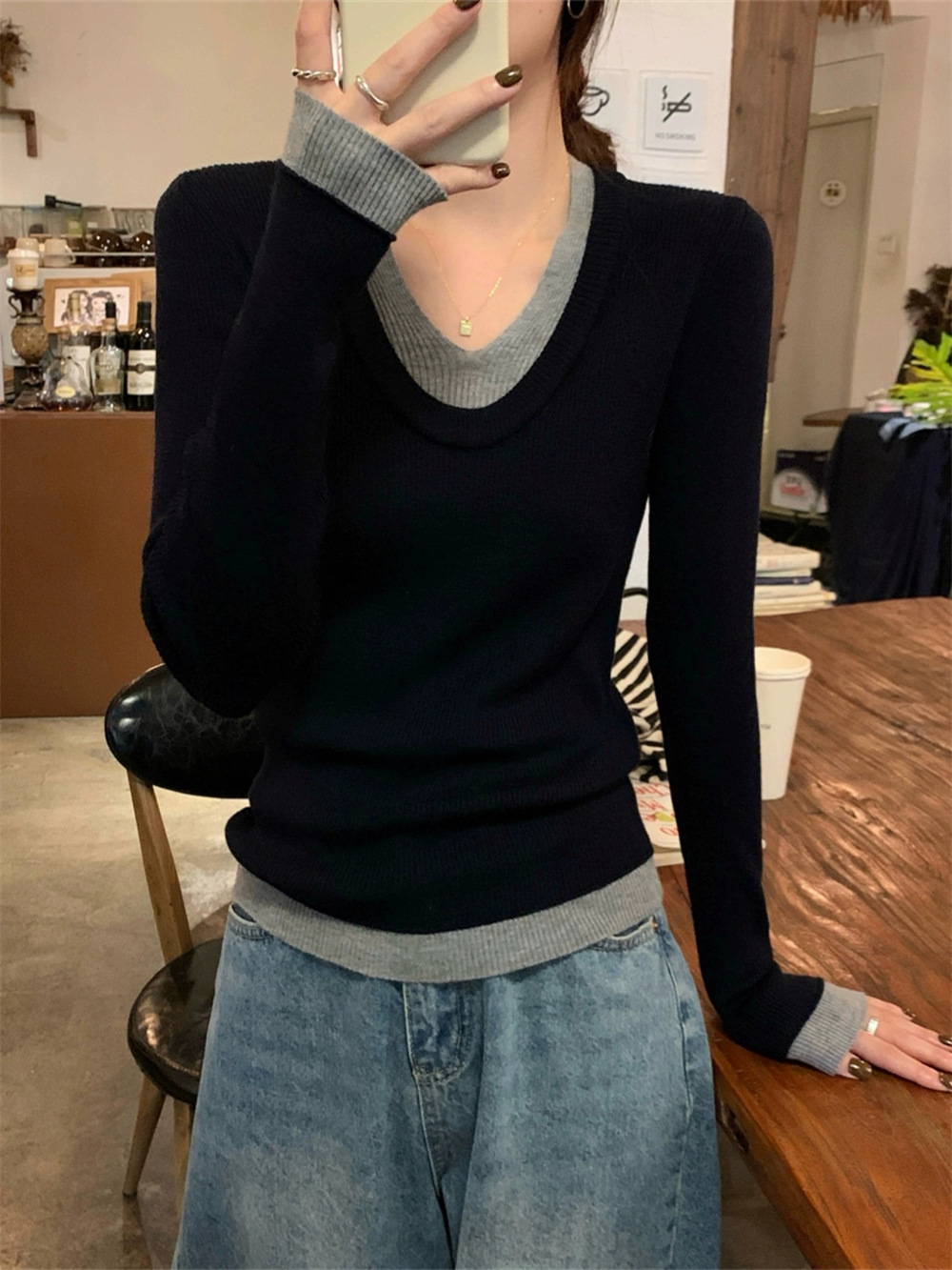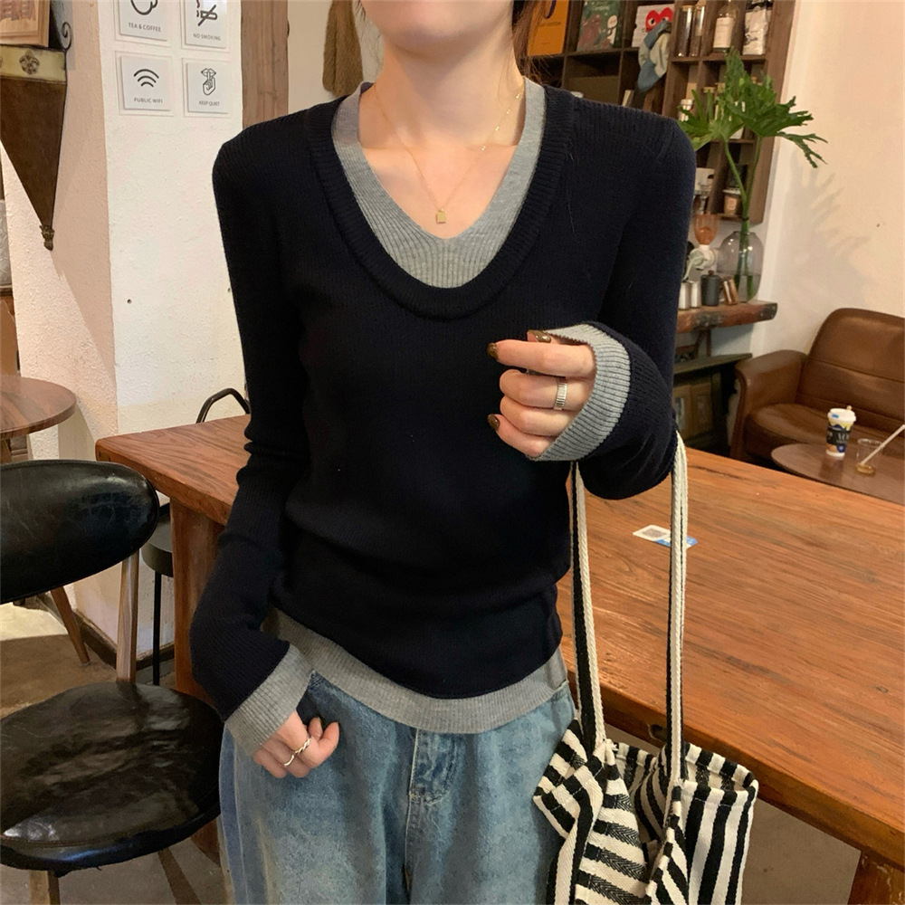 여성을위한 가짜 투피스 대비 색상 U 넥 니트 바닥 셔츠 가을, 겨울 새로운 한국 스타일 내부 슬림 스웨터 하이 엔드 탑