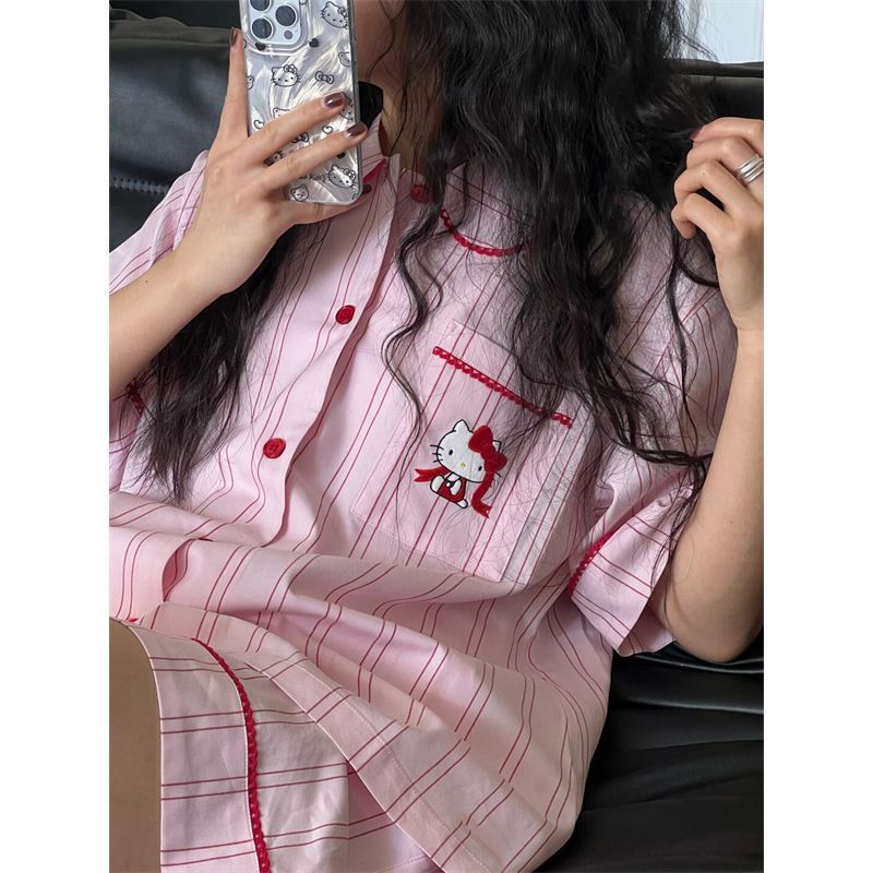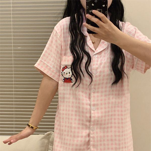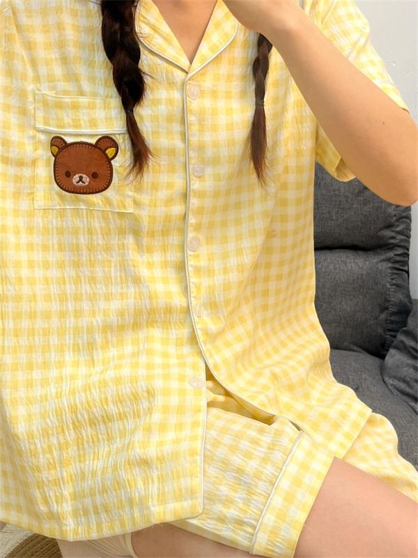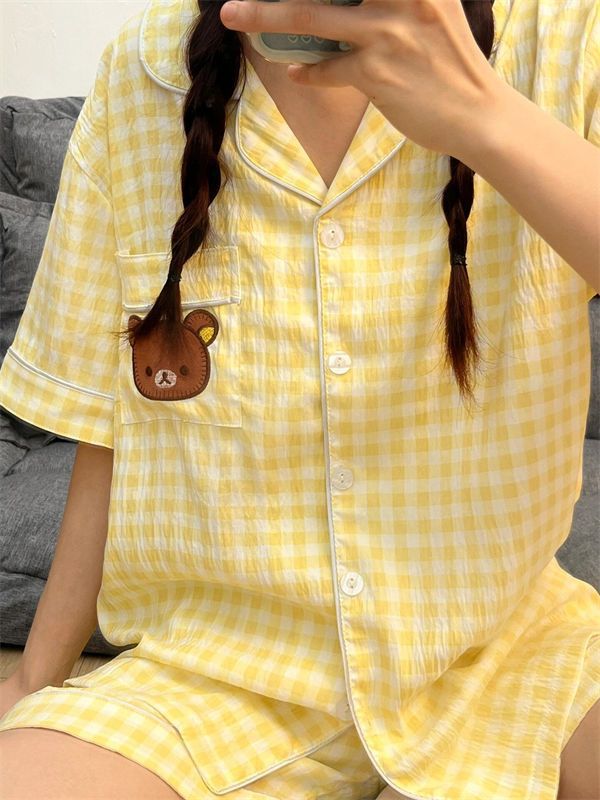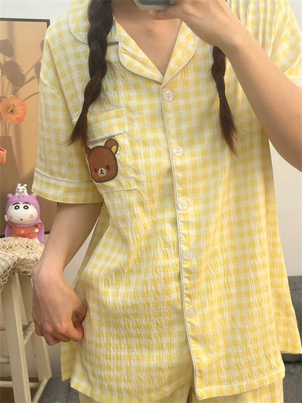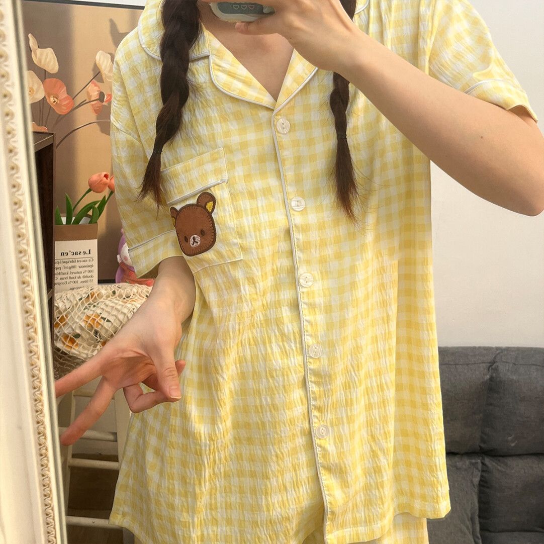 작은 다크 브라운 베어 격자 무늬 잠옷 여름 여성 신인즈 일본식 귀여운 한국식 반소매 홈 의류 세트 의류스토어 가기