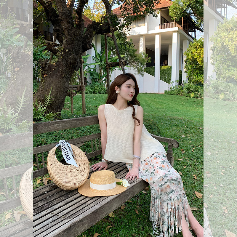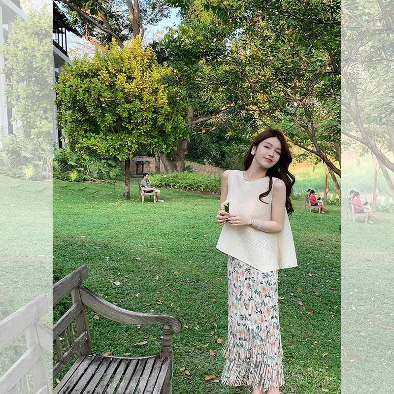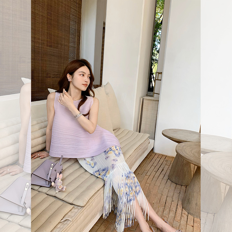 작은 빨간 책 폭발성 뜨거운 판매 라이브 화이트 우아한 게으른 미야케 민소매 최고 주름 술 스커트 여성스토어 가기