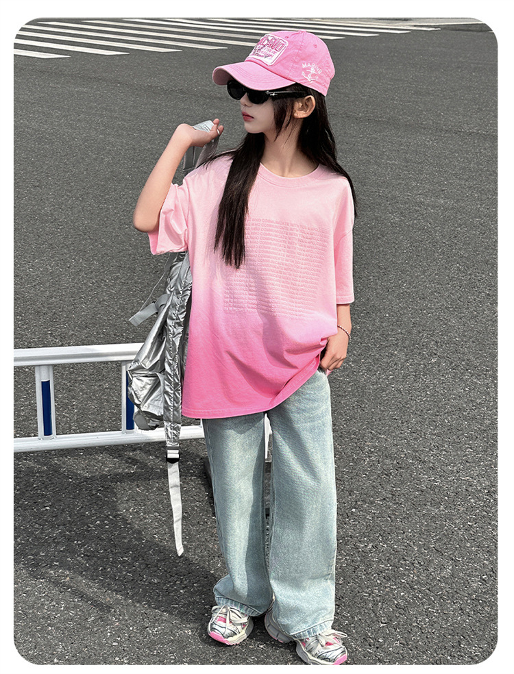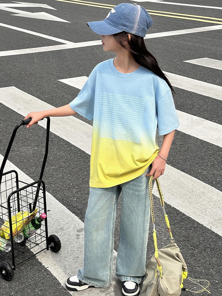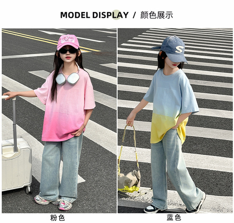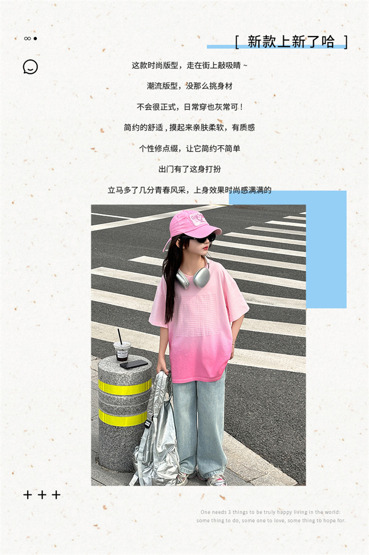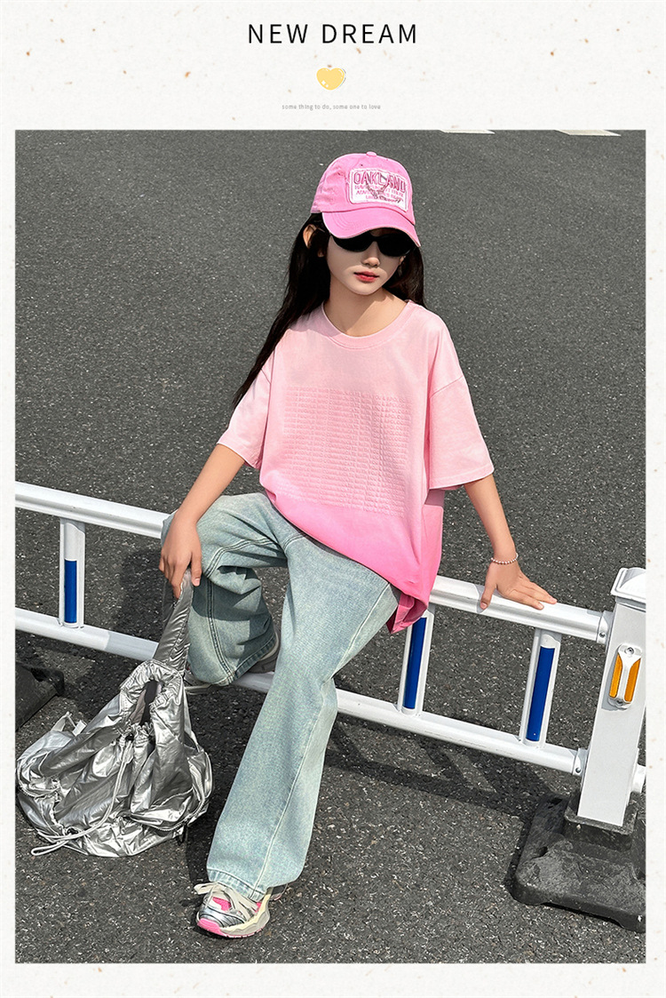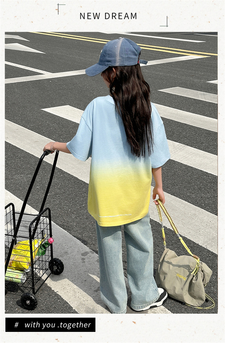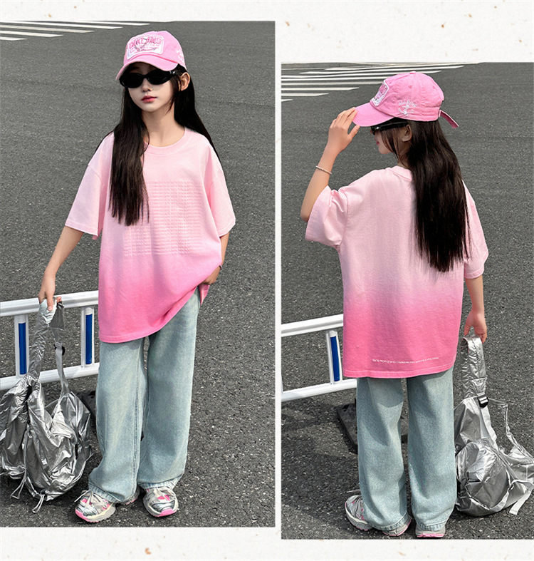 소녀 교수형 염료 그라디언트 티셔츠 2025 여름 새로운 세련된 큰 어린이 패셔너블 반팔 트렌디 탑스토어 가기