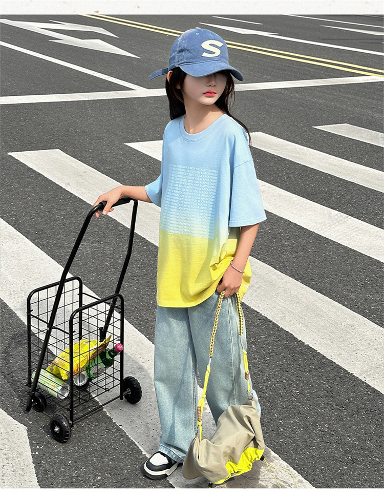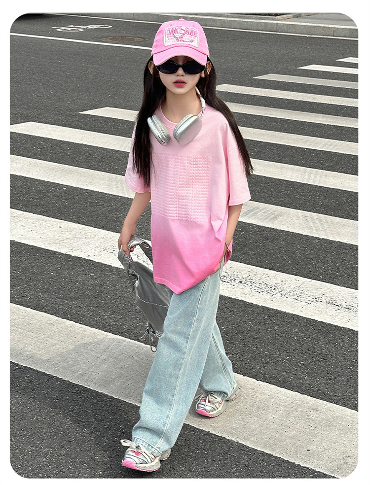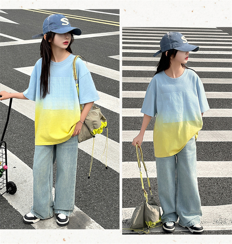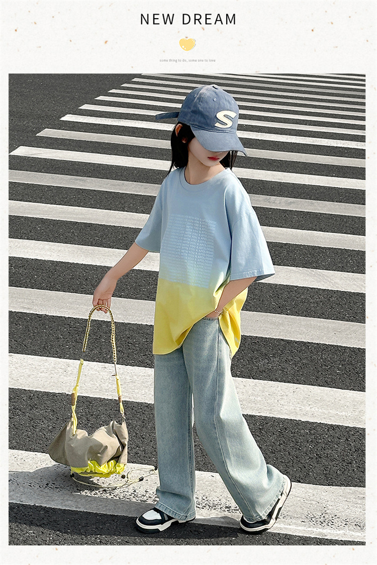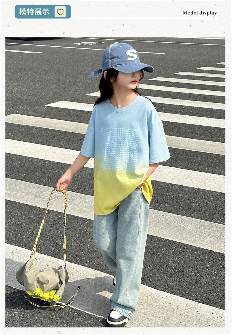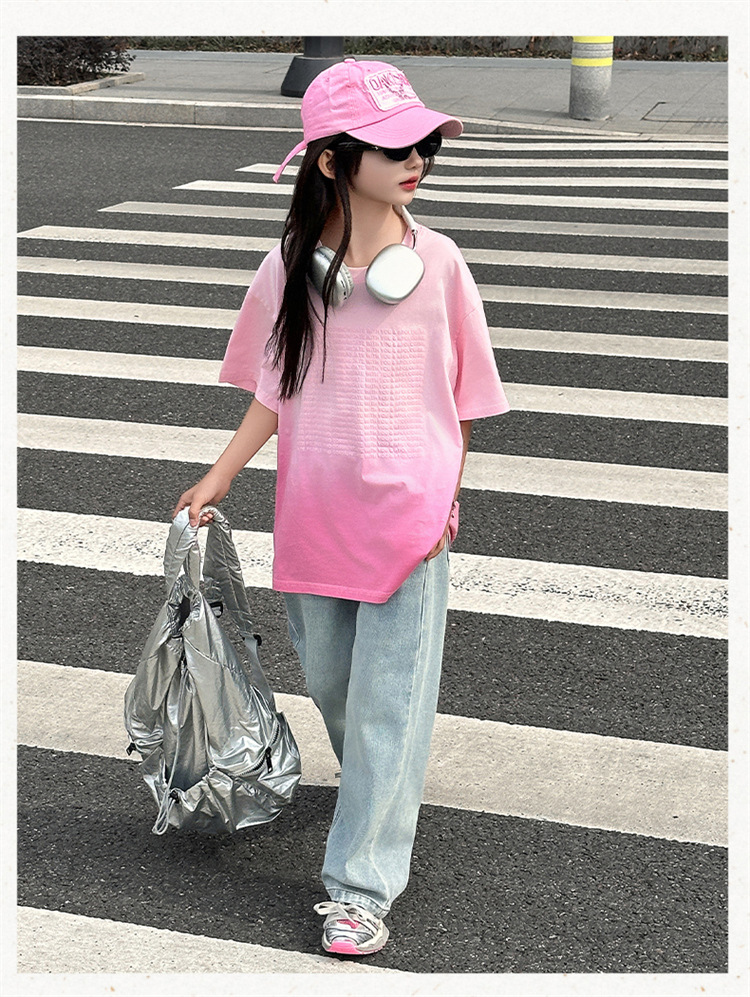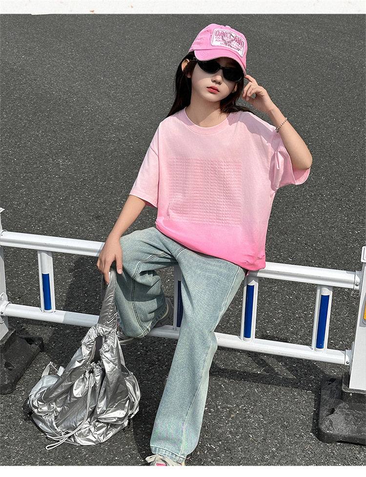 소녀 교수형 염료 그라디언트 티셔츠 2025 여름 새로운 세련된 큰 어린이 패셔너블 반팔 트렌디 탑스토어 가기