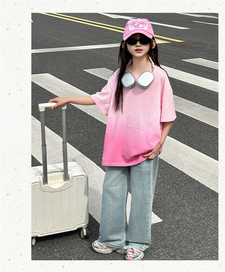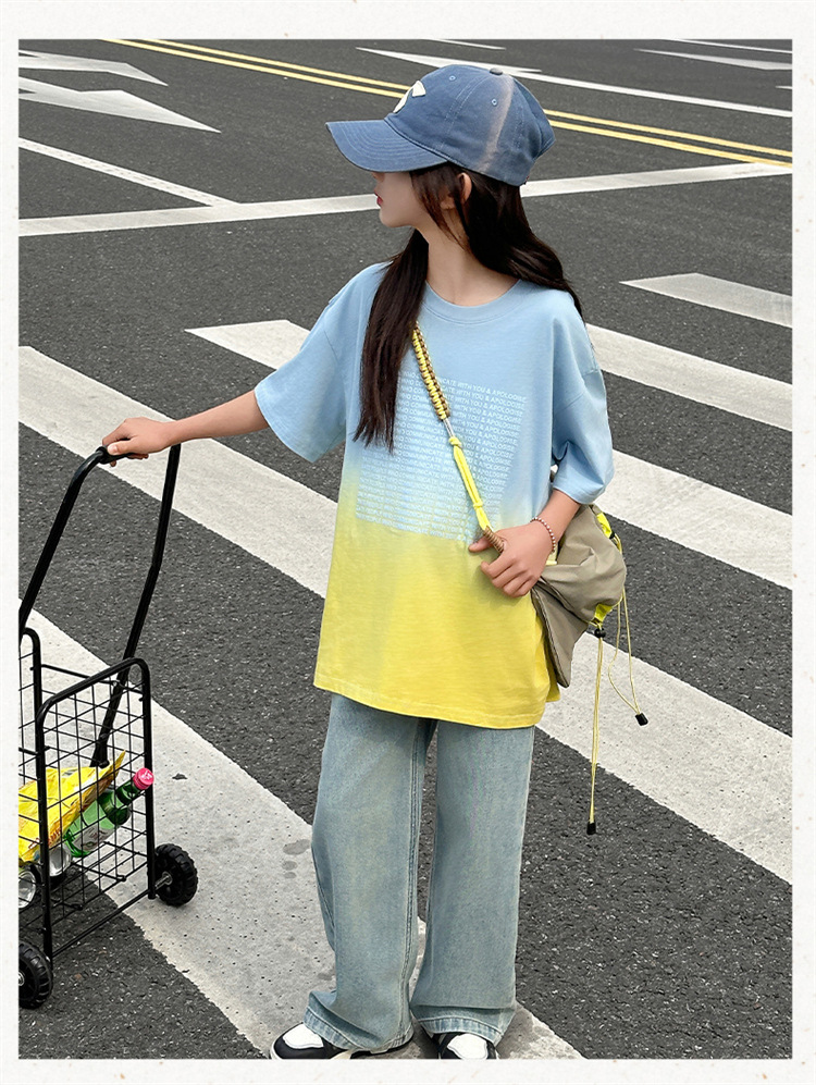 소녀 교수형 염료 그라디언트 티셔츠 2025 여름 새로운 세련된 큰 어린이 패셔너블 반팔 트렌디 탑