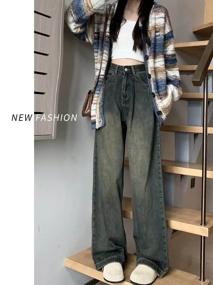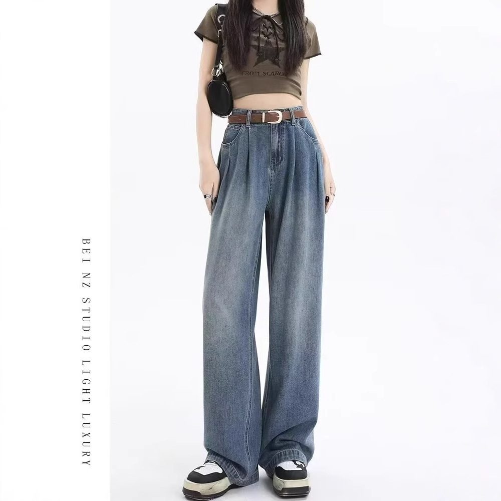 광저우 소스 아메리칸 화이트 와이드 레그 청바지 여성용 하이 웨이스트 슬림 루즈 플리츠 게으른 드레이프 스트레이트 팬츠스토어 가기