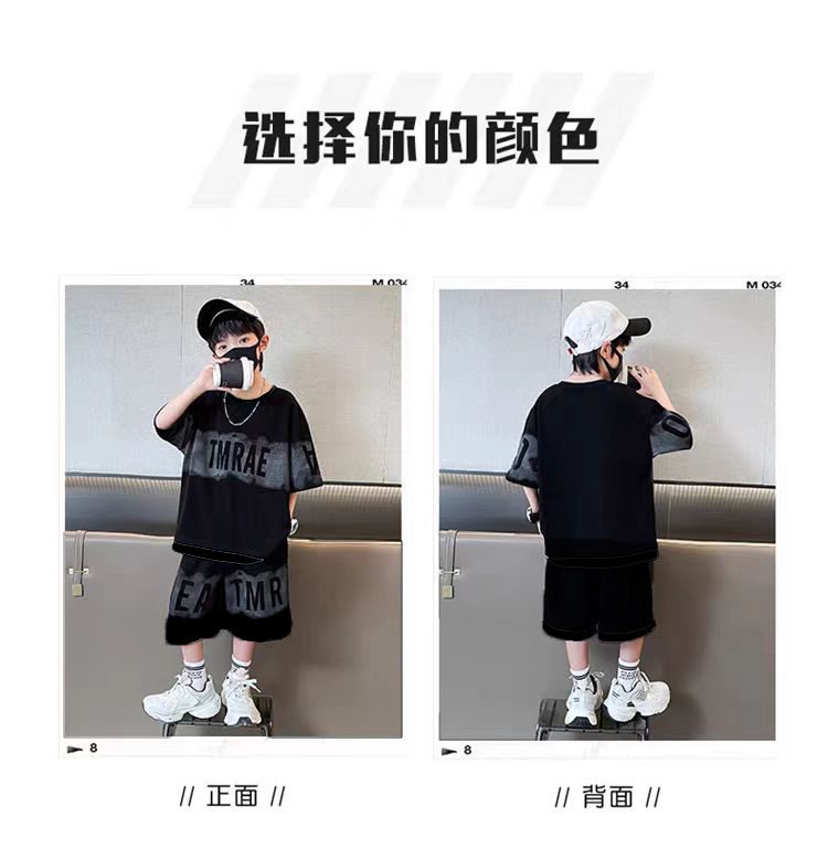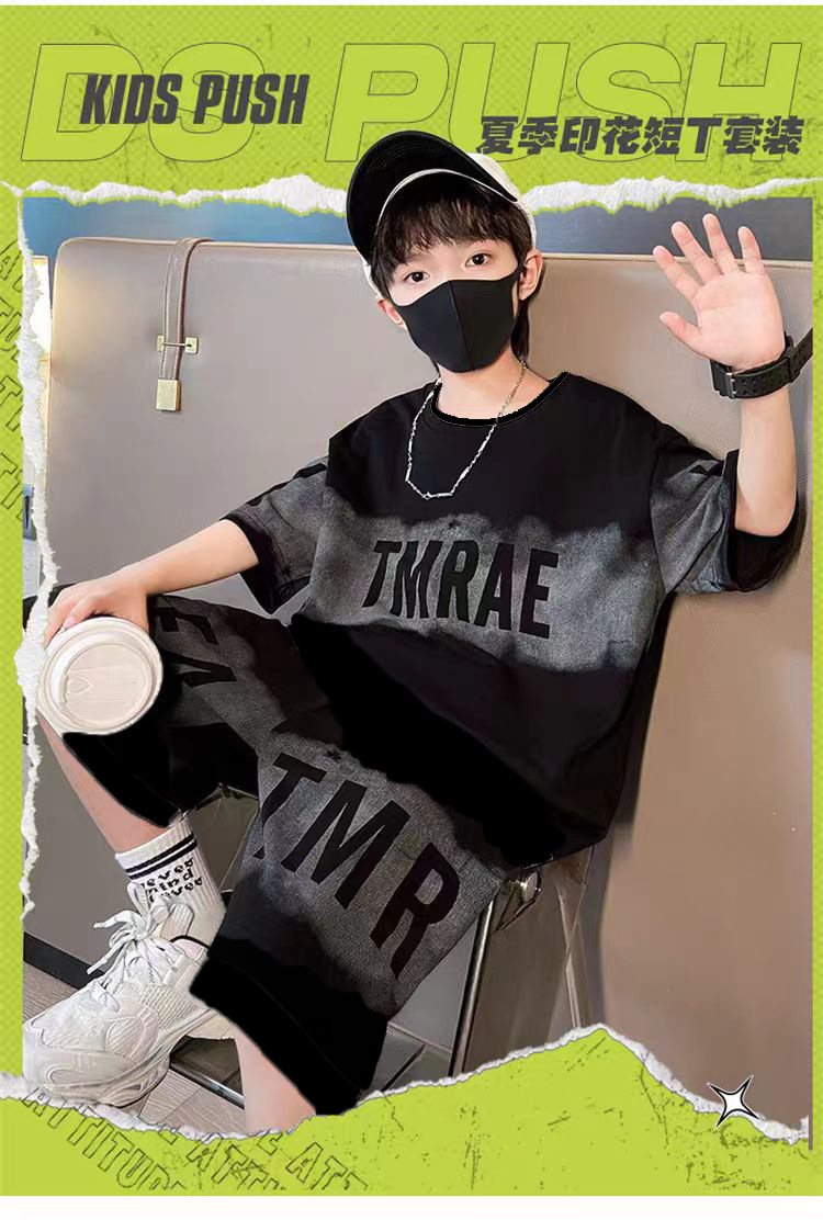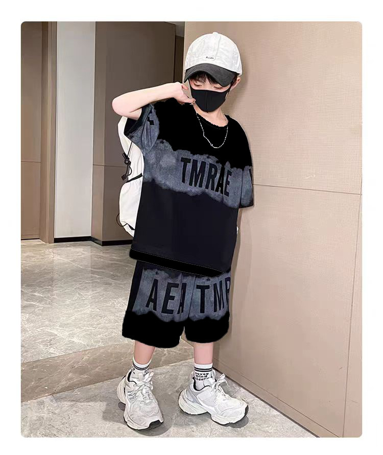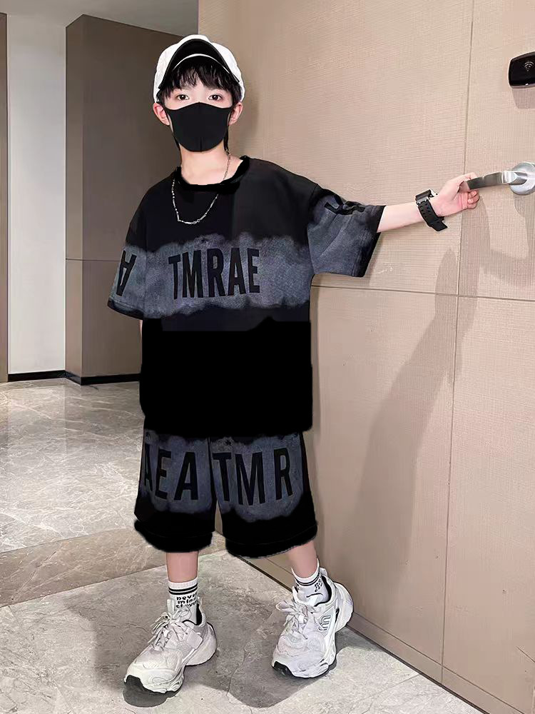 25夏季儿童时尚潮范字母印花宽松休闲套装中大男童短袖短裤两件套