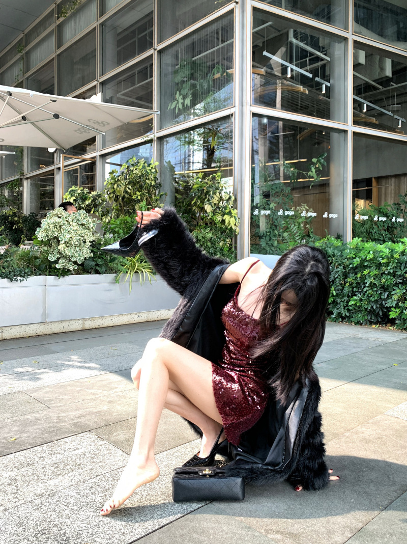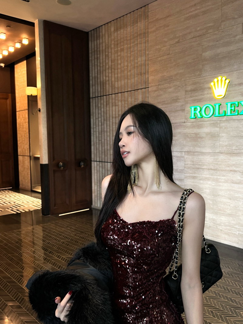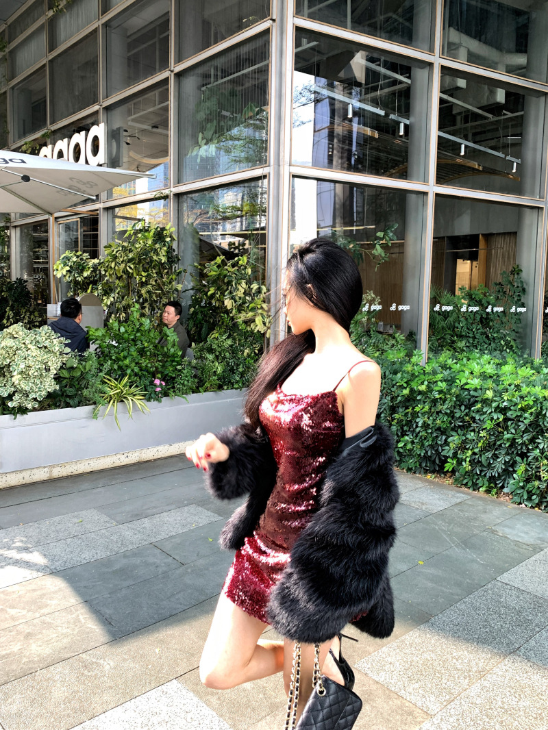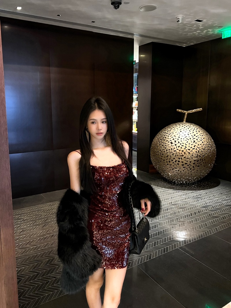 버건디 스퀸 슬링 원피스 여성용 봄 하이 엔드 슬림 핏 원피스 스커트 순수 허리 감싼 힙합 스커트