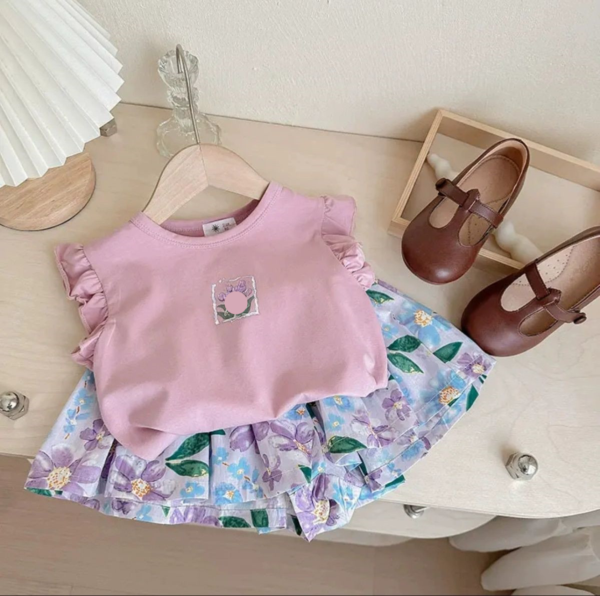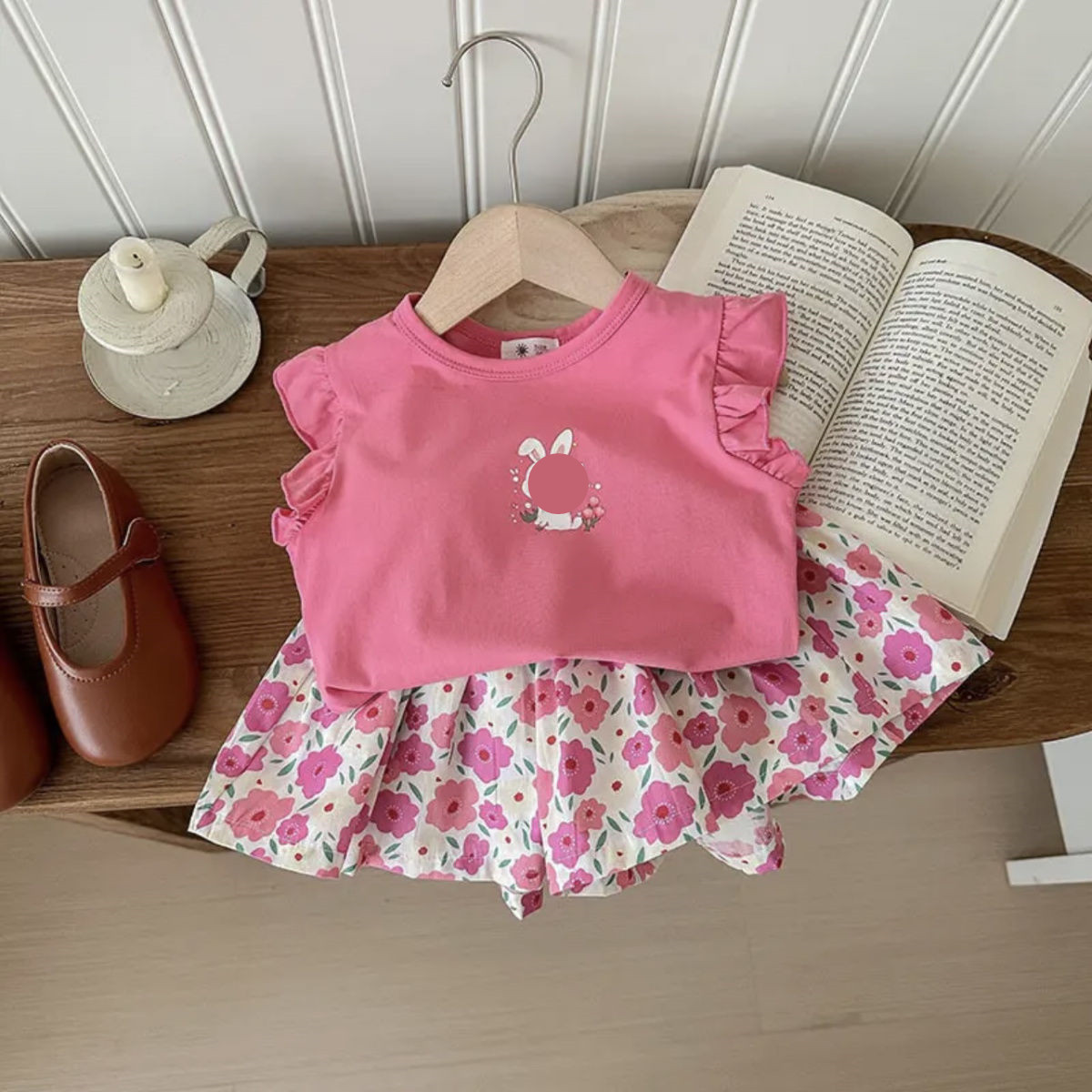 여름 여아 정장, 아기 패션, 어린이 맞춤형 트렌디 브랜드 한국어 버전, 달콤한 플라잉 슬리브 만화 티셔츠, 꽃무늬 반바지스토어 가기