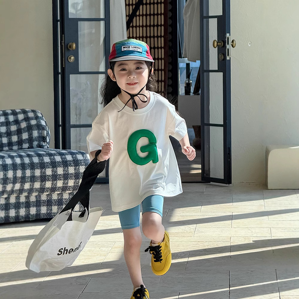 어린이 도파민 컬러 입체 재미 편지 티셔츠 소년 소녀를위한 여름 2022 새로운 한국어 버전 반팔 라운드 넥 티셔츠스토어 가기