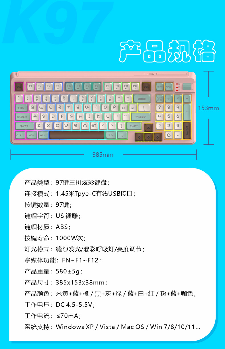 크로스보더 K97 게이밍 유선 키보드, 멋진 디자인, 남녀공용 사무실 및 게임용 기계식 느낌의 데스크탑 컴퓨터 키보드