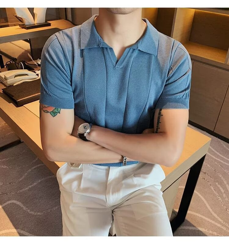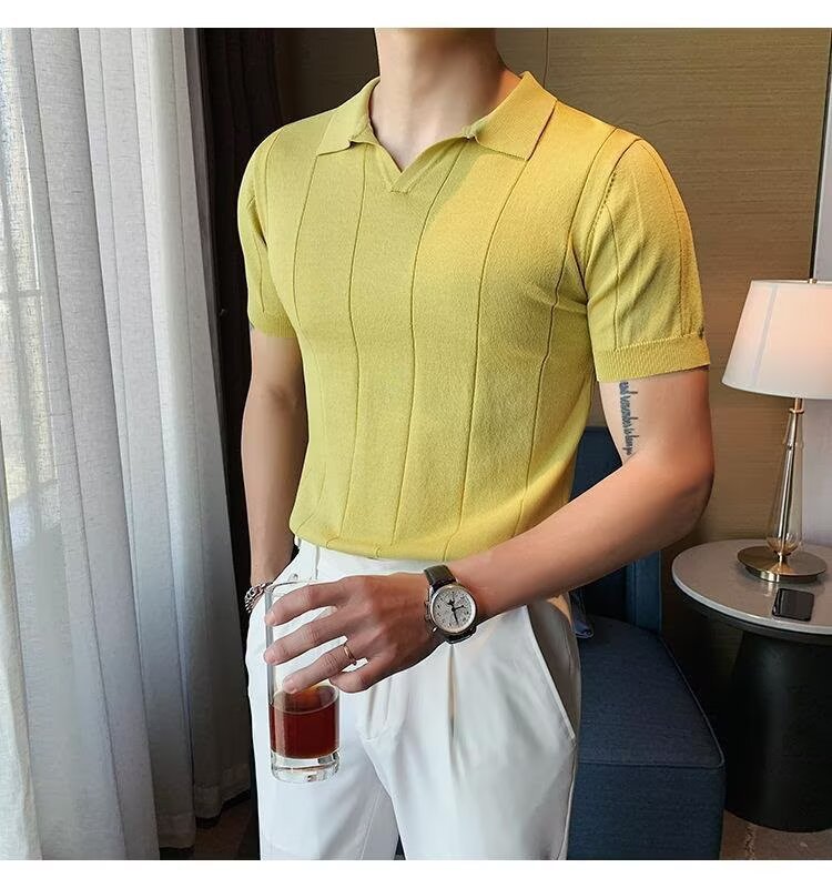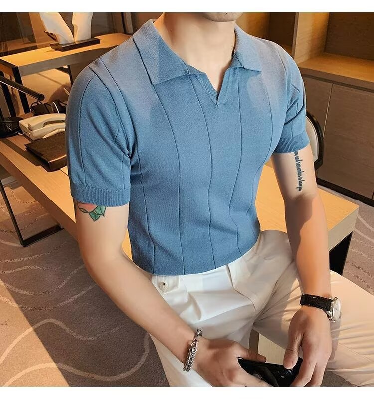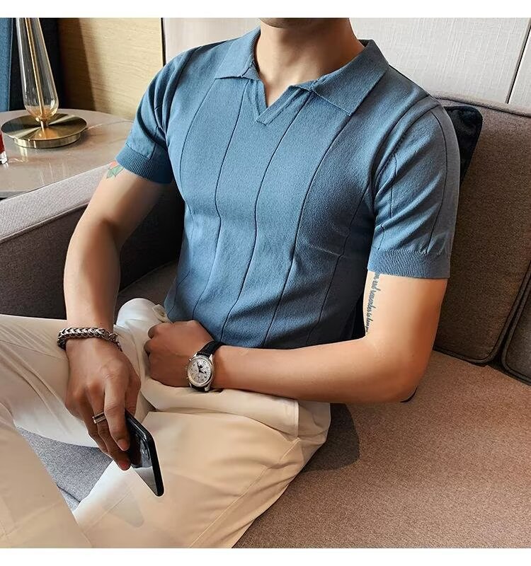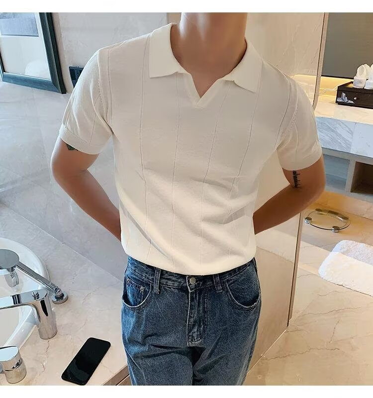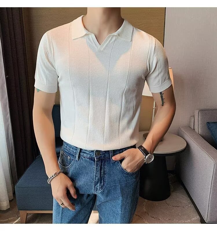 2025년 여름 남성용 하이엔드 아이스 실크 반팔 티셔츠 새로운 비즈니스 남성용 탑 잘 생긴 V 넥 니트 폴로 셔츠스토어 가기