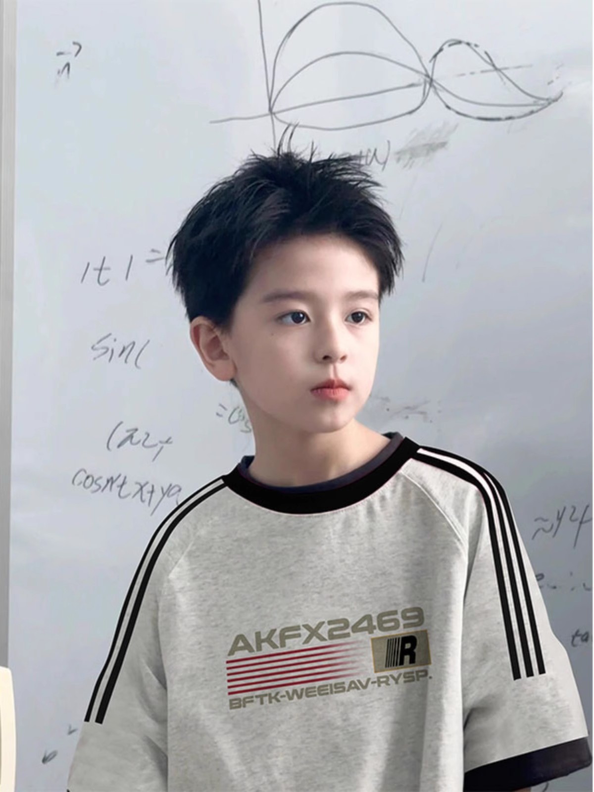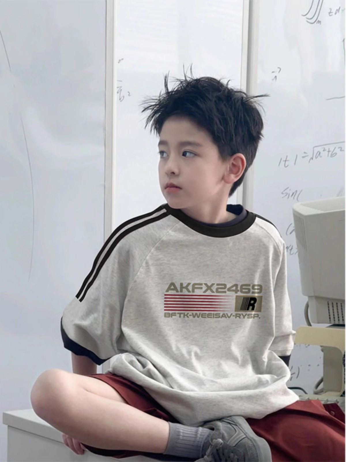 소년 여름 회색 티셔츠 순면 새로운 유행 잘 생긴 소년 스타일 반팔 아동복 라운드 넥 캐주얼 티셔츠스토어 가기