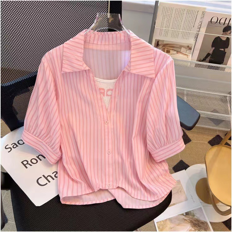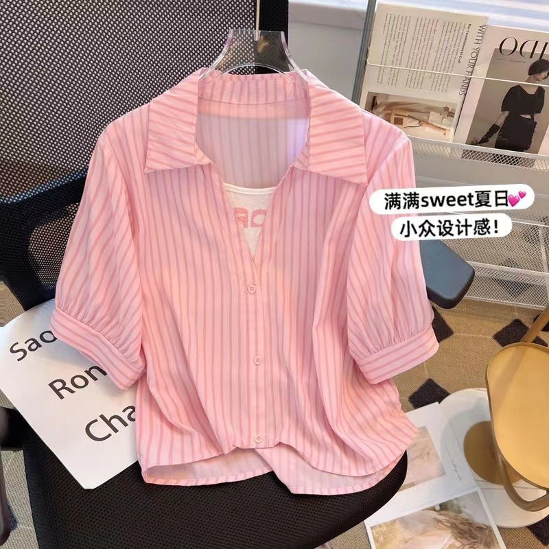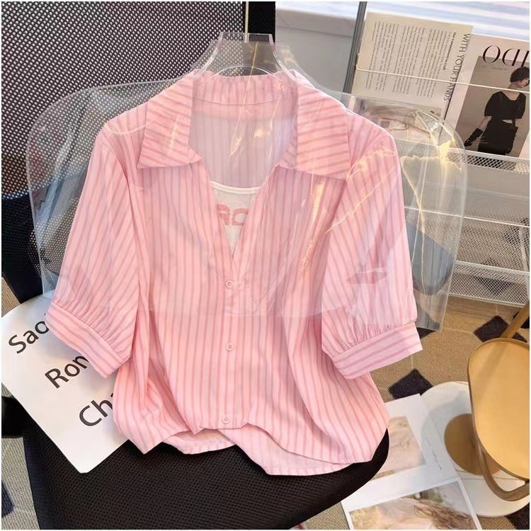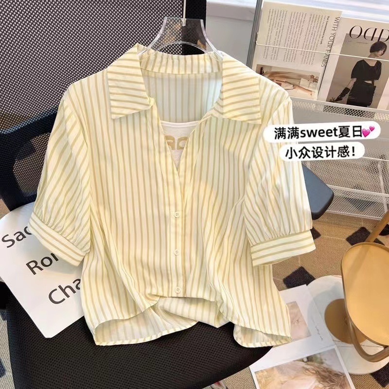 2025 새로운 여름 반팔 쉬폰 탑 여성 패션 투피스 스트라이프 셔츠 세련된 여름 작은 셔츠