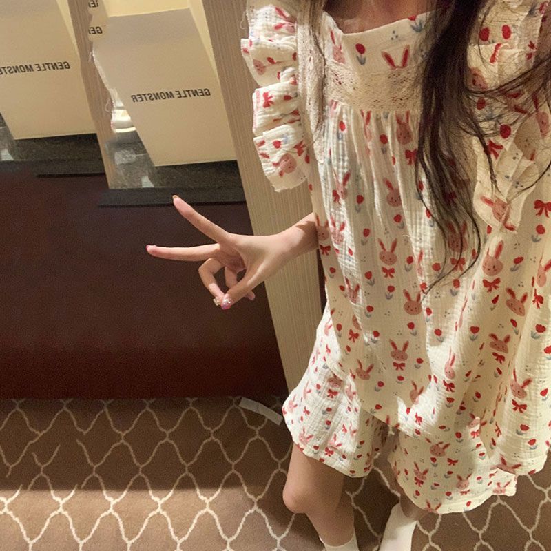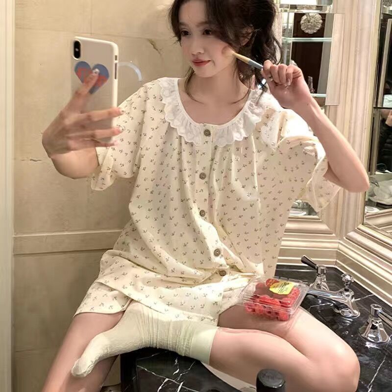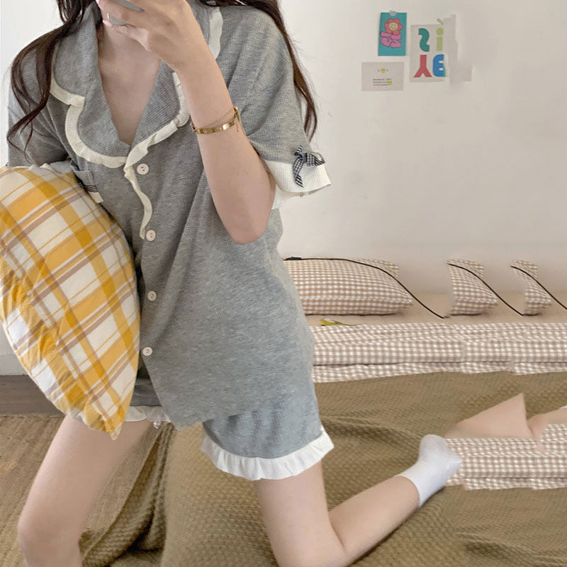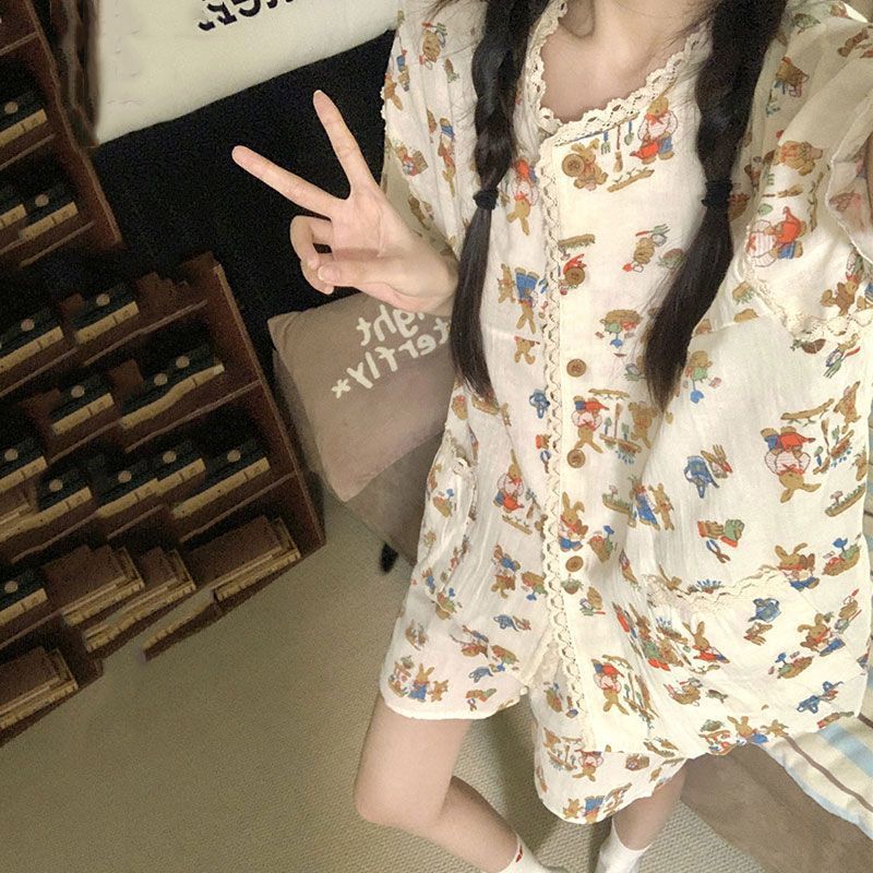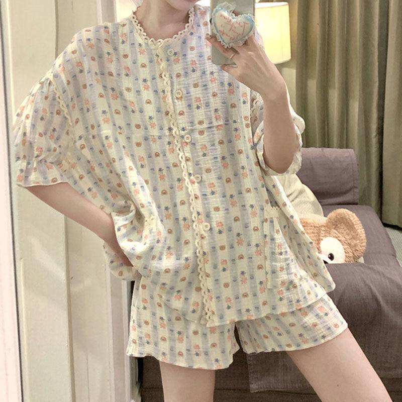 여름 새 스타일 ins 레이스 잠옷 여성 일본 곰 인터넷 연예인 반팔 반바지 귀여운 홈웨어 세트스토어 가기