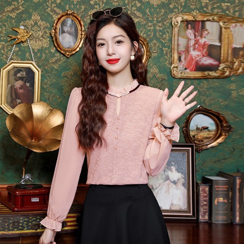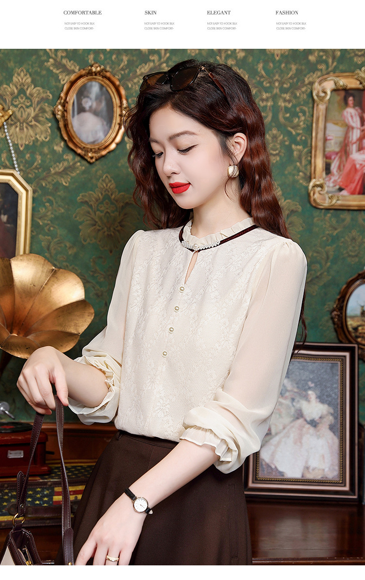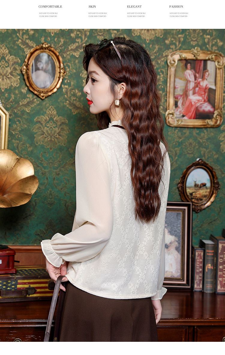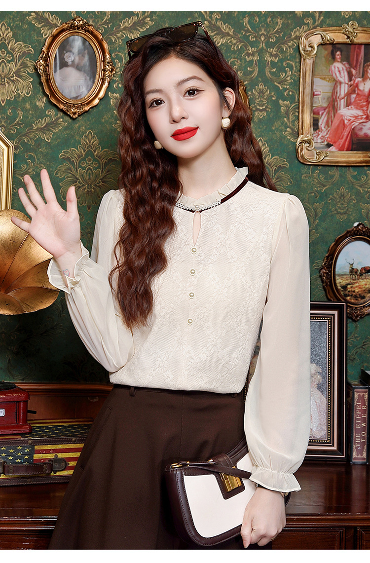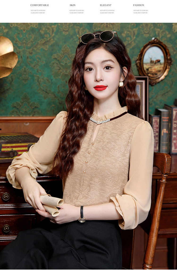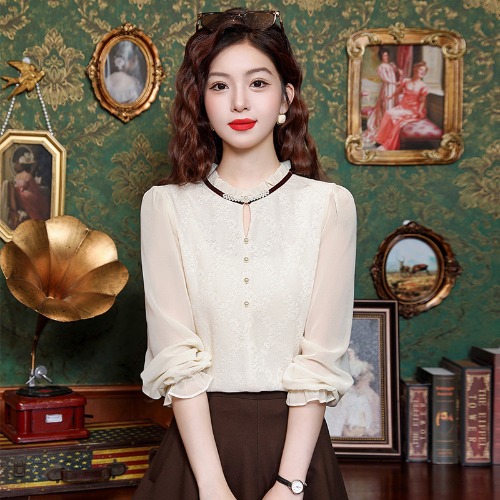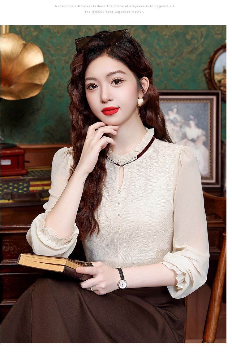 여성용 2025 레이스베이스 셔츠, 귀 테두리 칼라와 레이스 새로운 가을 및 겨울 스타일 긴 소매 쉬폰 슬림 핏 탑스토어 가기