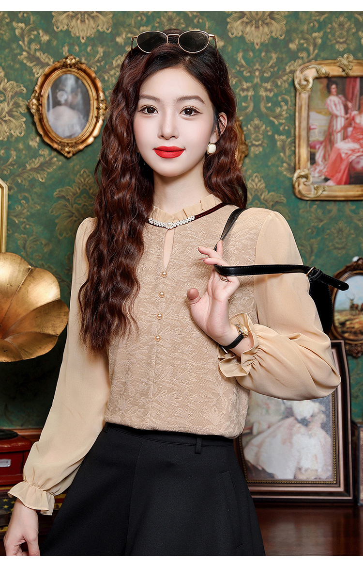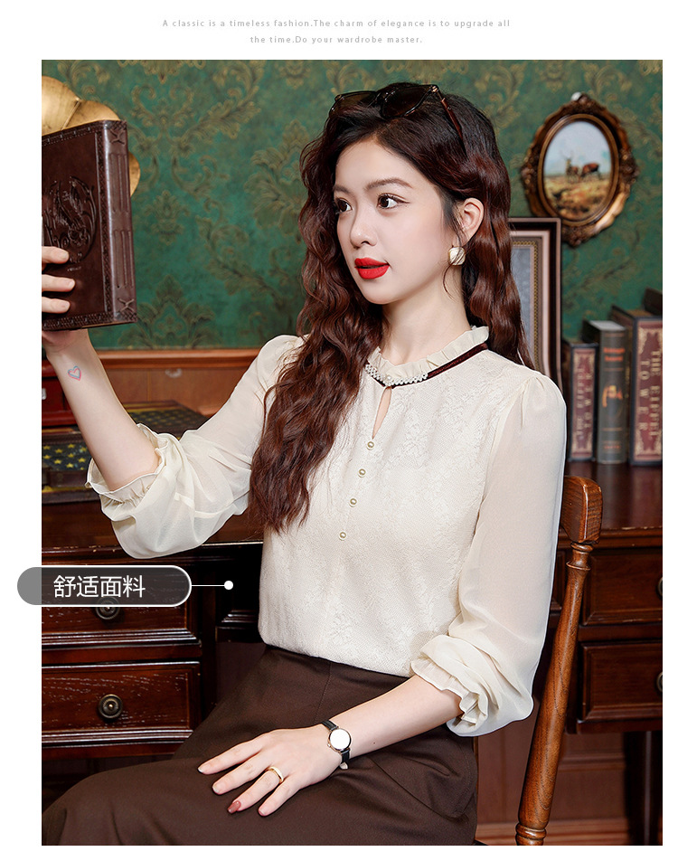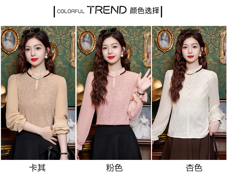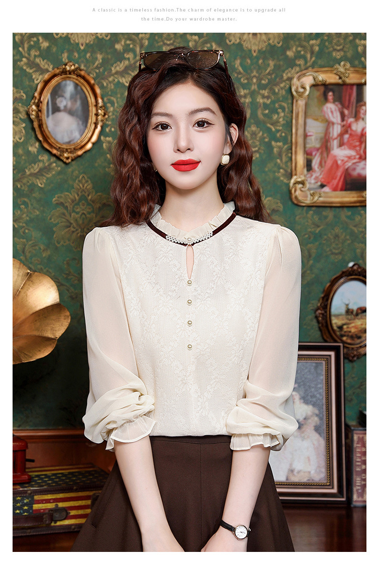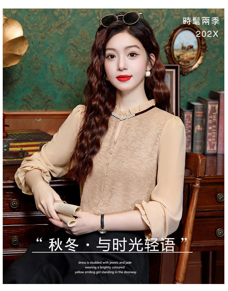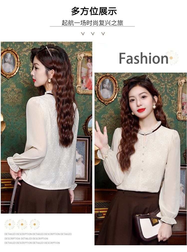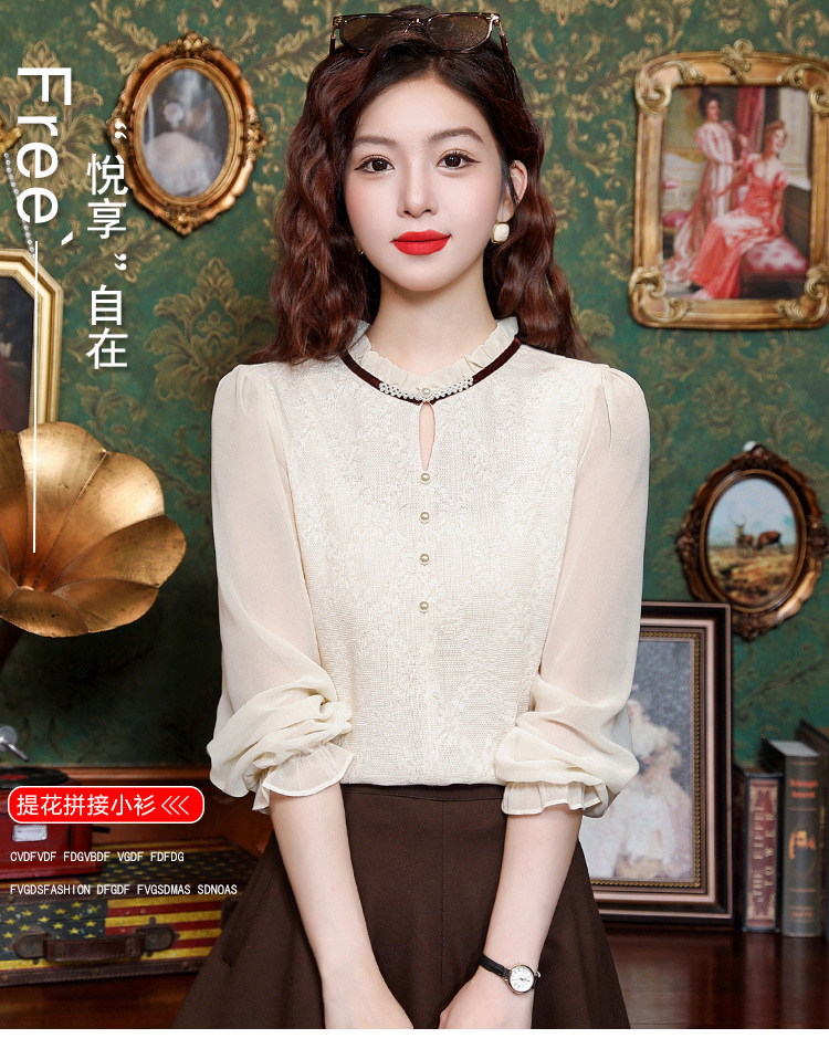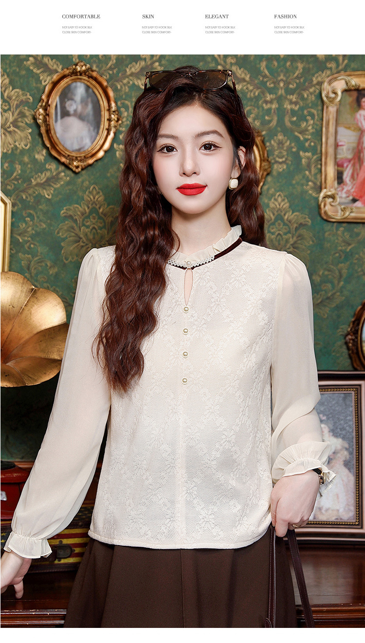 여성용 2025 레이스베이스 셔츠, 귀 테두리 칼라와 레이스 새로운 가을 및 겨울 스타일 긴 소매 쉬폰 슬림 핏 탑스토어 가기
