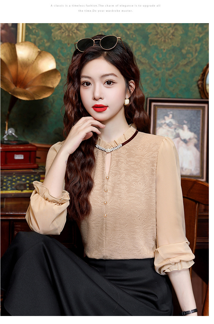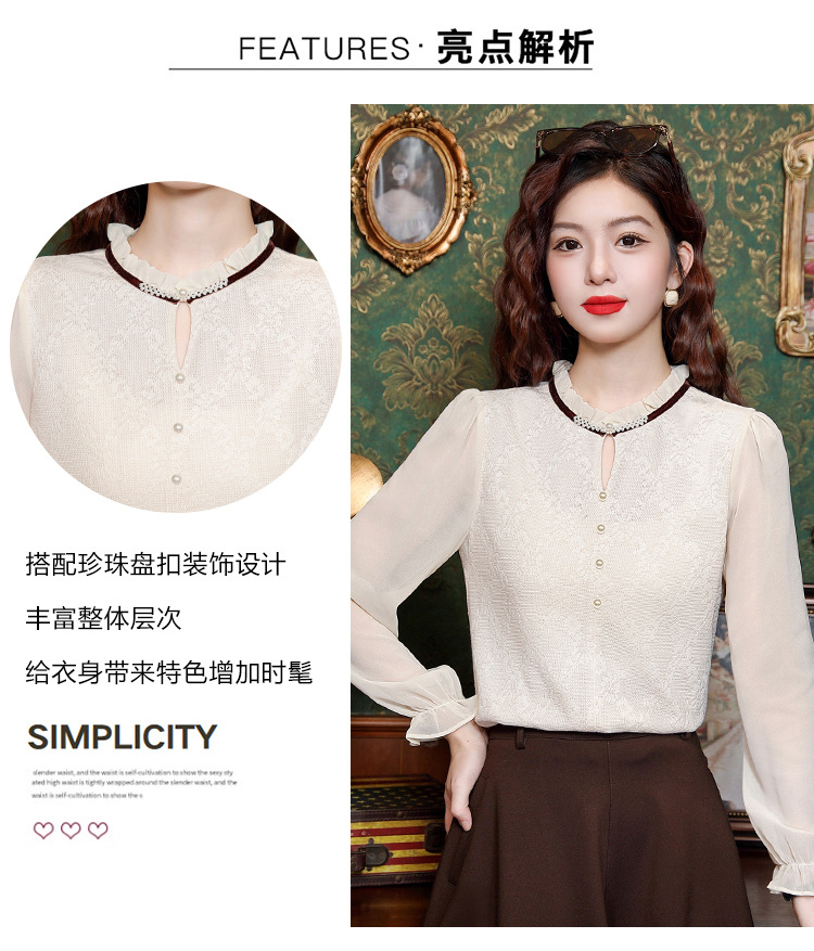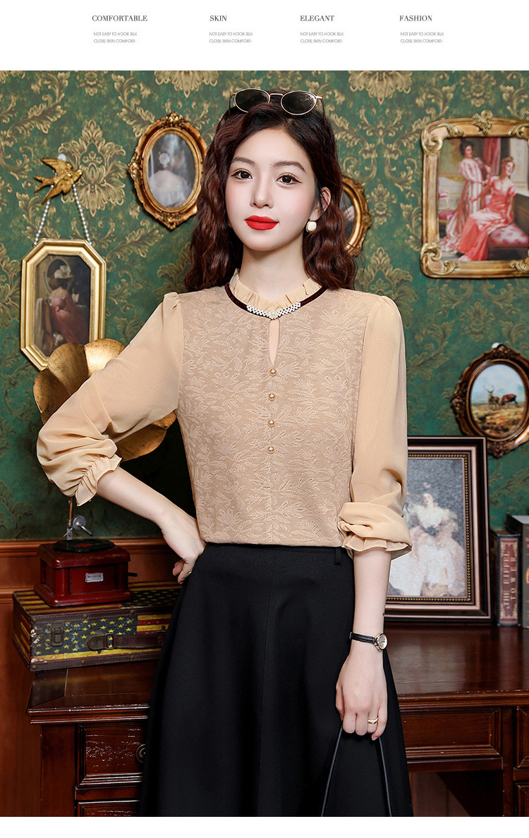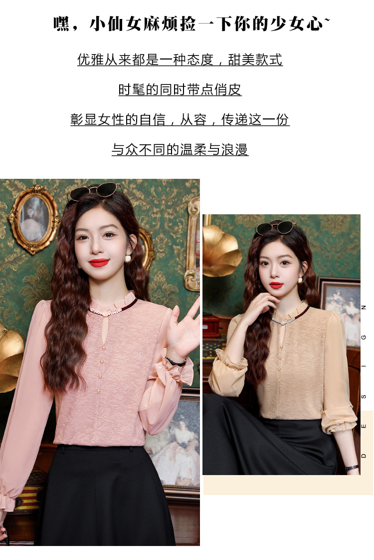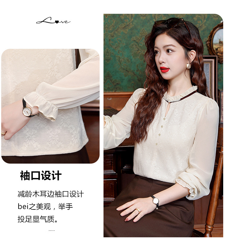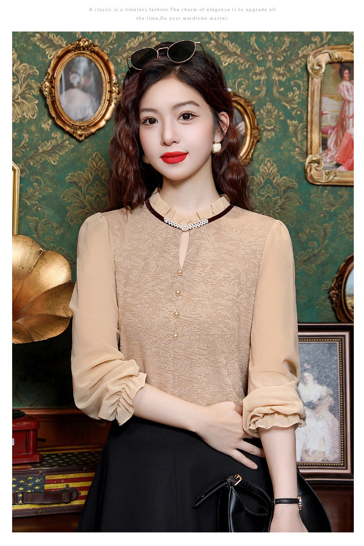 여성용 2025 레이스베이스 셔츠, 귀 테두리 칼라와 레이스 새로운 가을 및 겨울 스타일 긴 소매 쉬폰 슬림 핏 탑스토어 가기