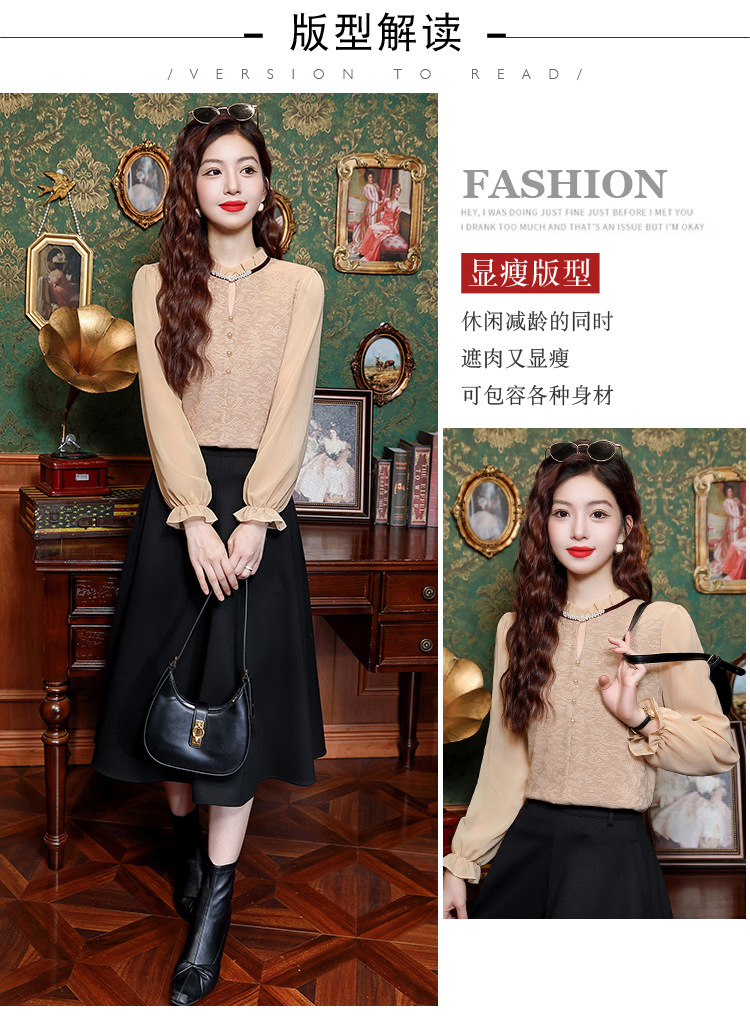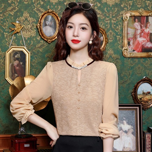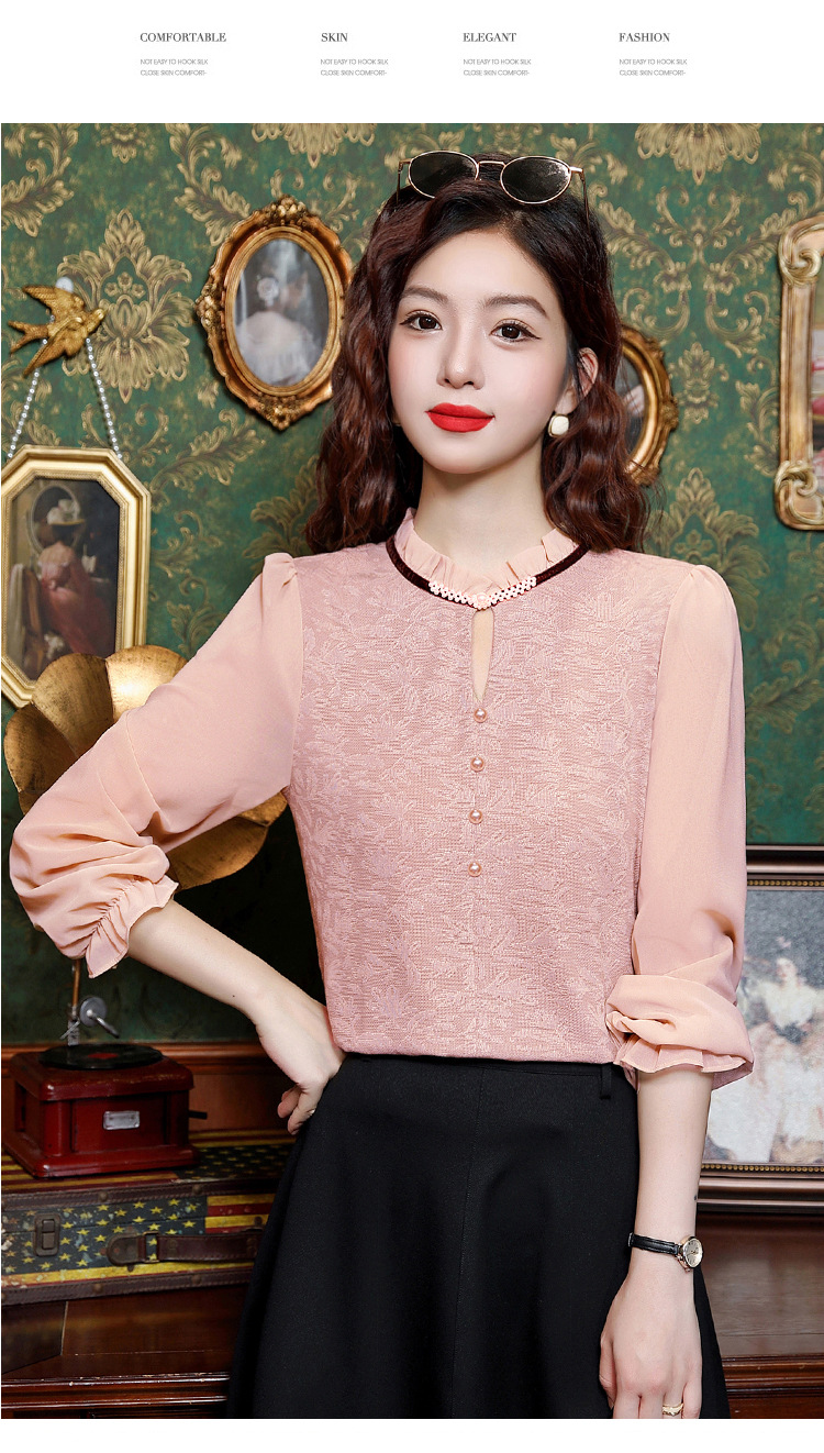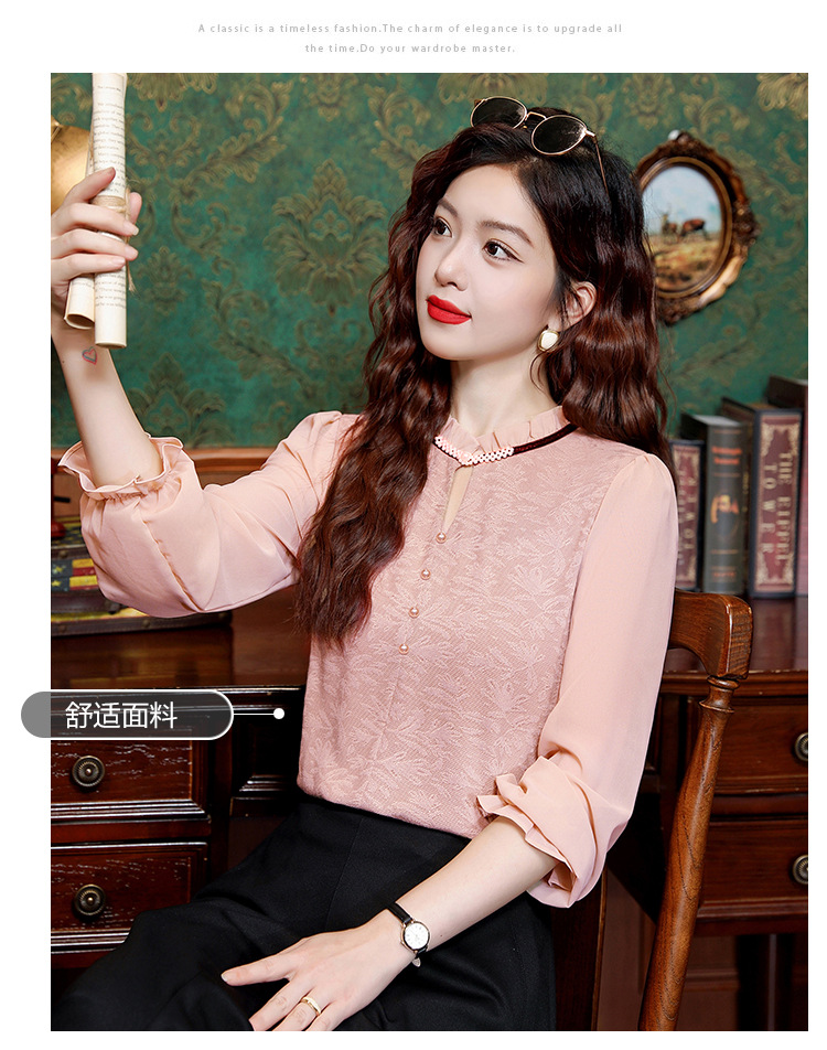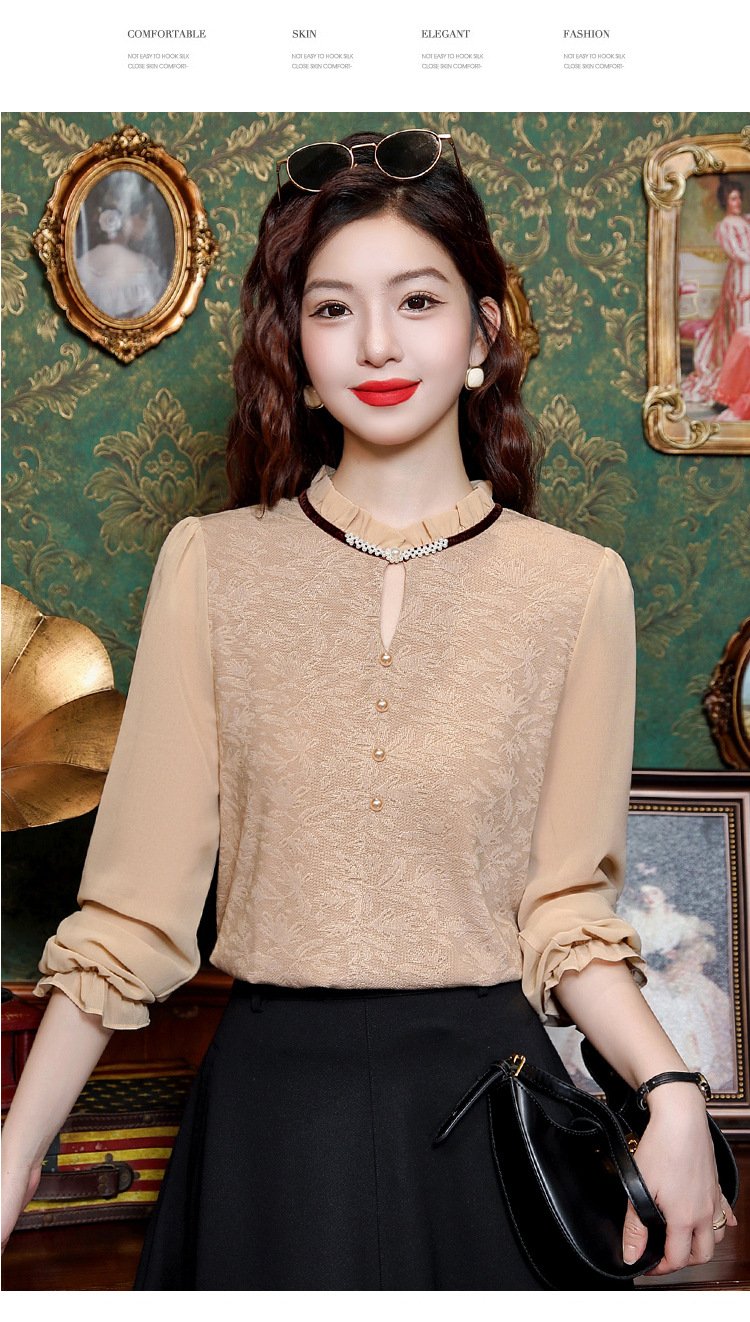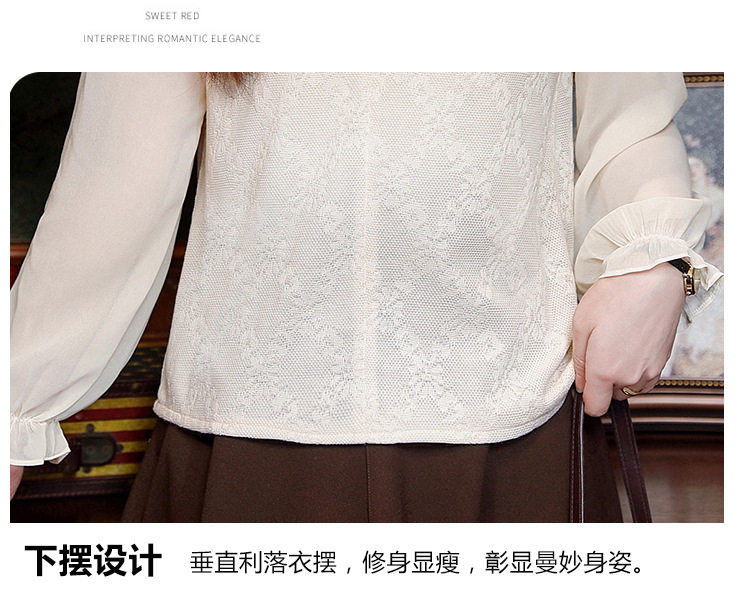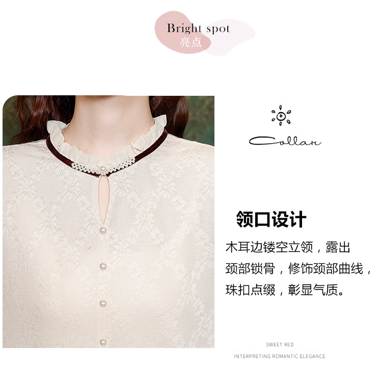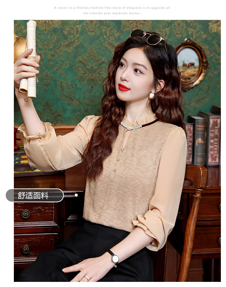 여성용 2025 레이스베이스 셔츠, 귀 테두리 칼라와 레이스 새로운 가을 및 겨울 스타일 긴 소매 쉬폰 슬림 핏 탑스토어 가기