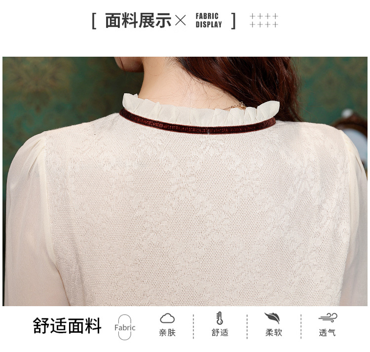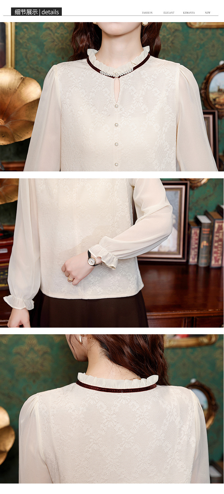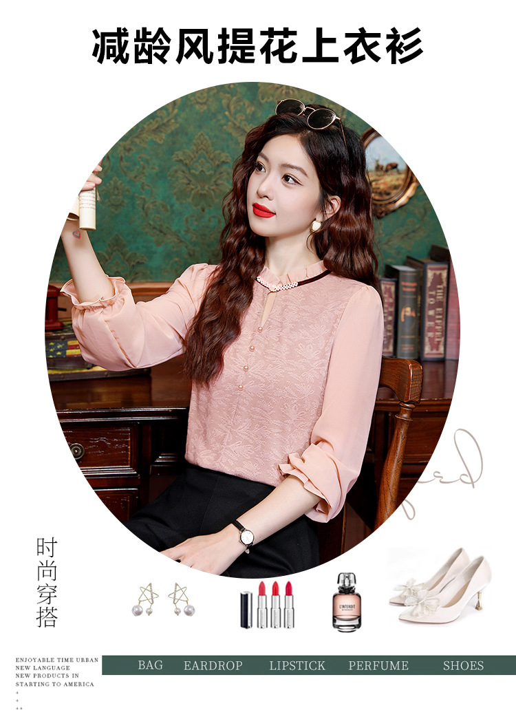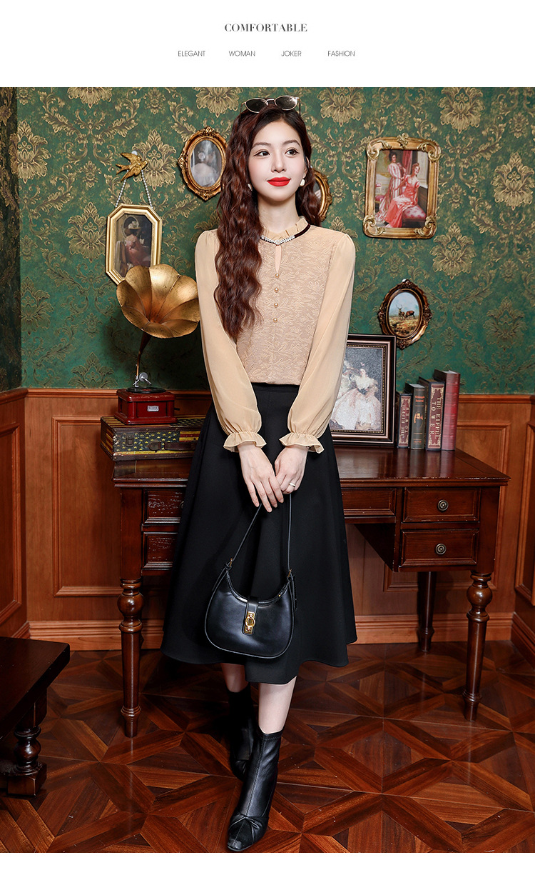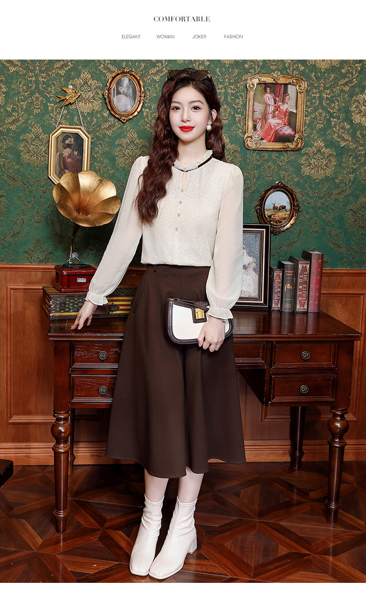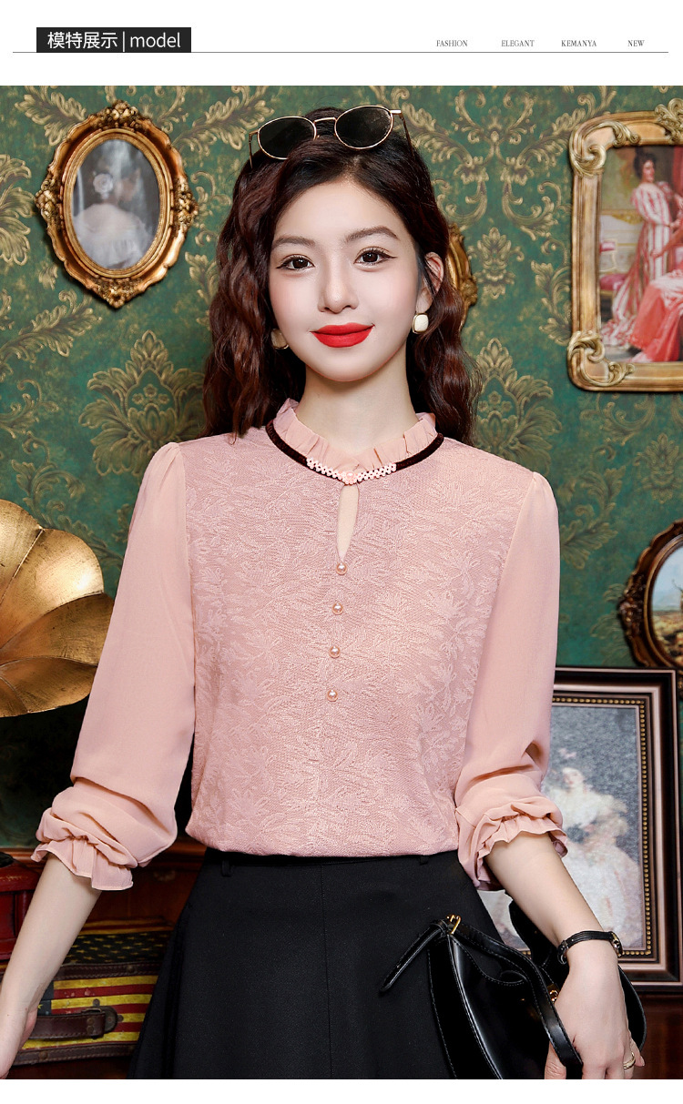 여성용 2025 레이스베이스 셔츠, 귀 테두리 칼라와 레이스 새로운 가을 및 겨울 스타일 긴 소매 쉬폰 슬림 핏 탑스토어 가기