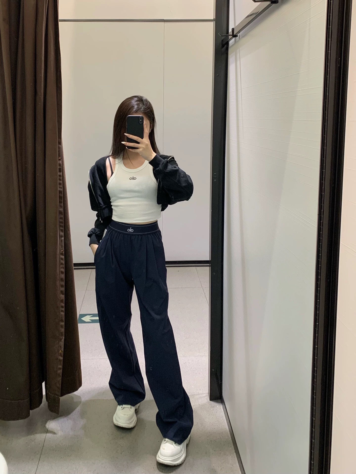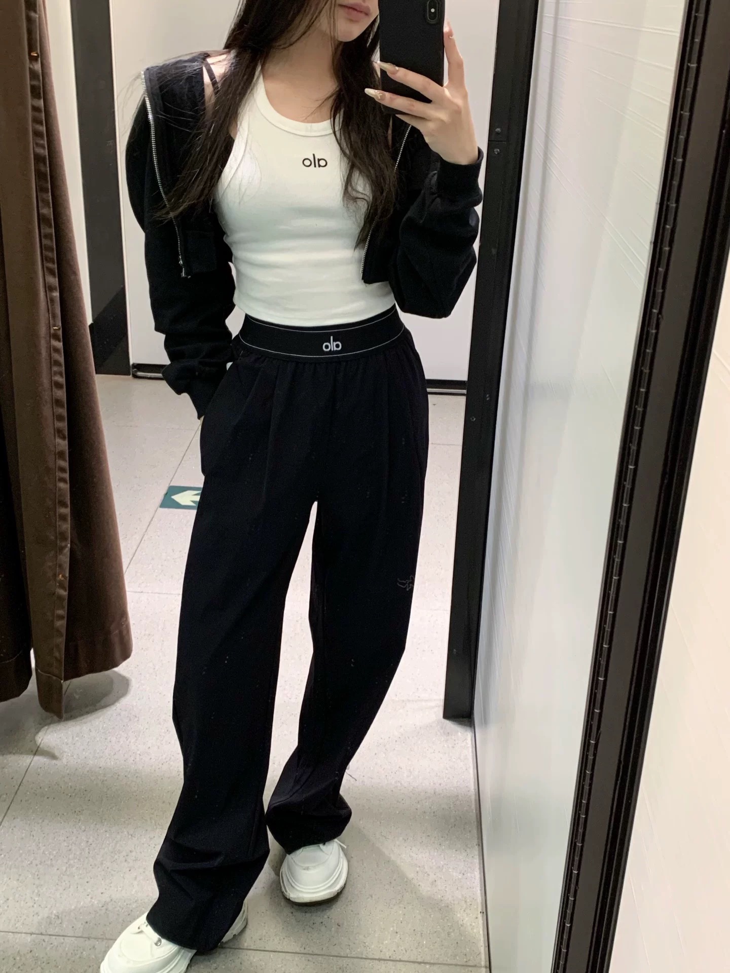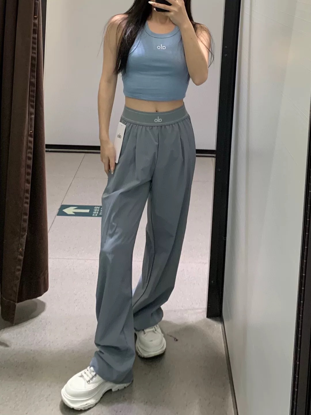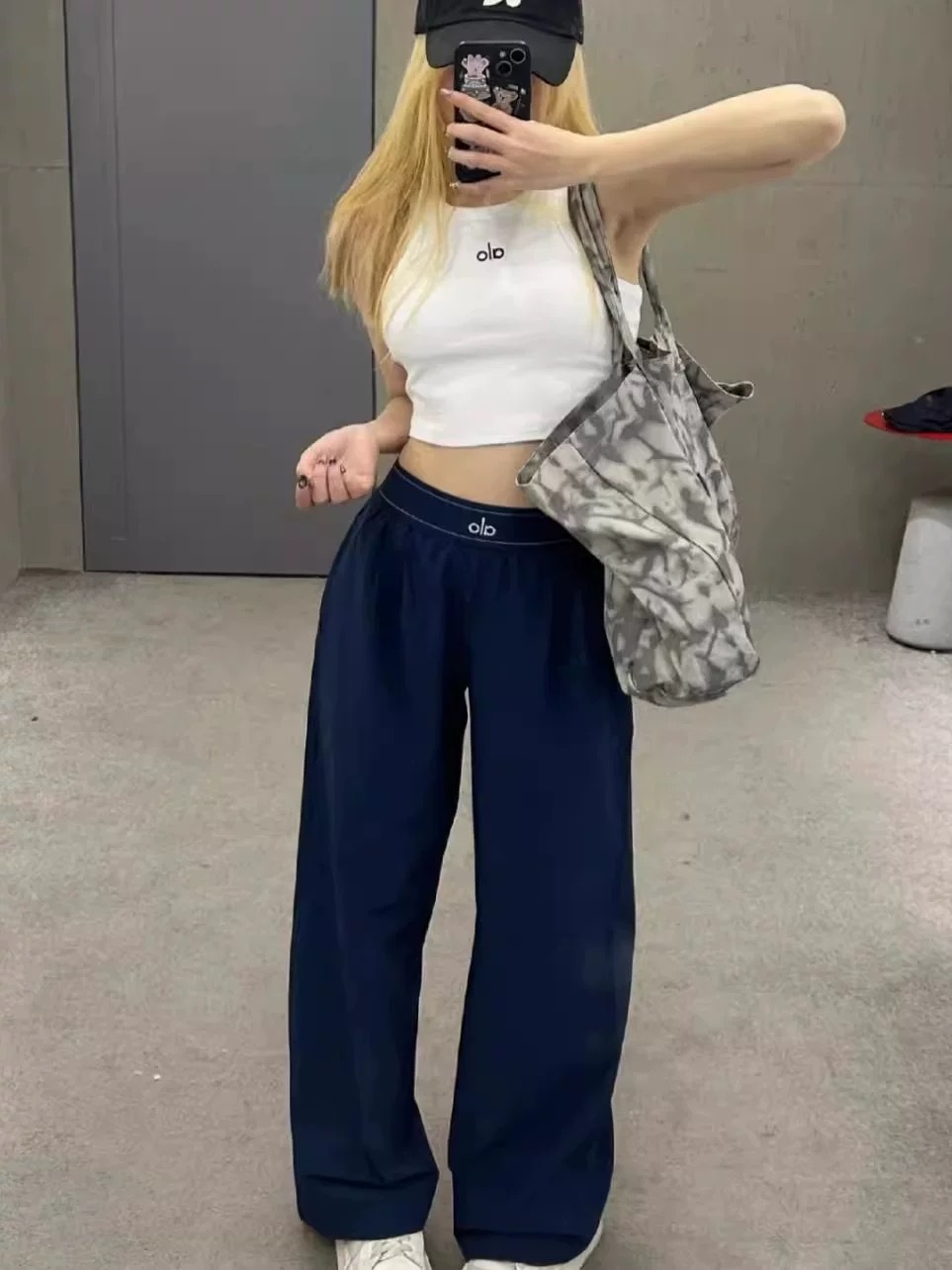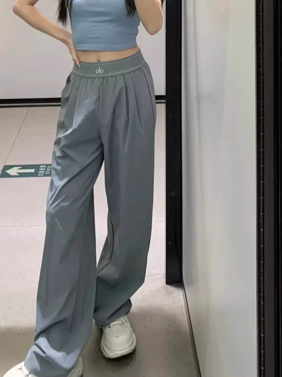 Alo 새로운 캐주얼 스포츠 바지 여성 리본 높은 허리 넓은 다리 바지 느슨한 슬리밍 경량 용량 캐주얼 바지스토어 가기