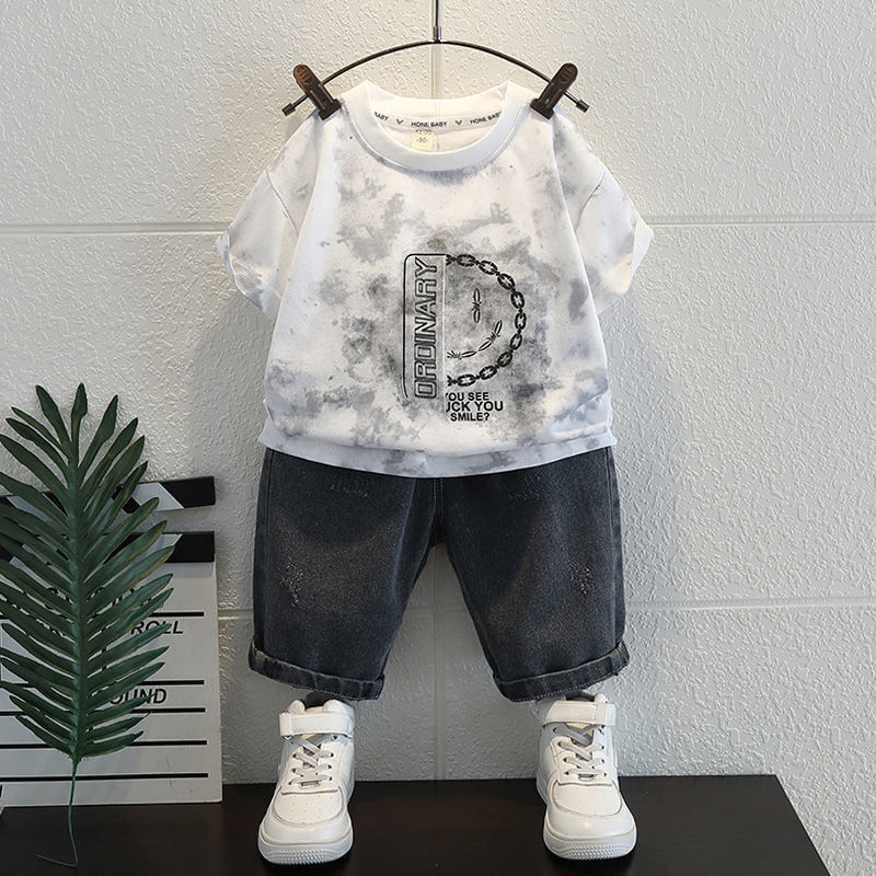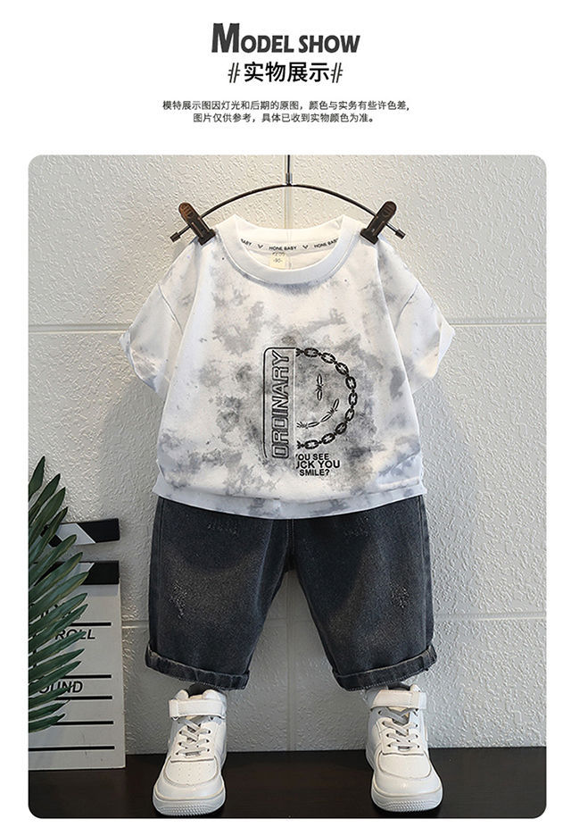 소년 여름 세트 어린이 유행 반팔 투피스 세트 2024 새로운 도착 더피 잘 생긴 소년 아기의 여름 티셔츠 트렌디스토어 가기
