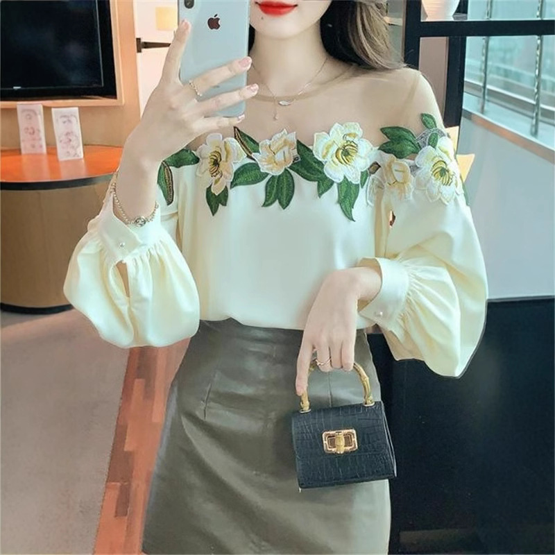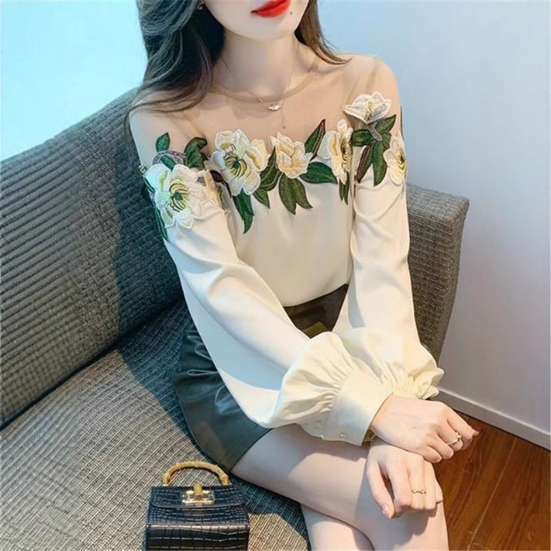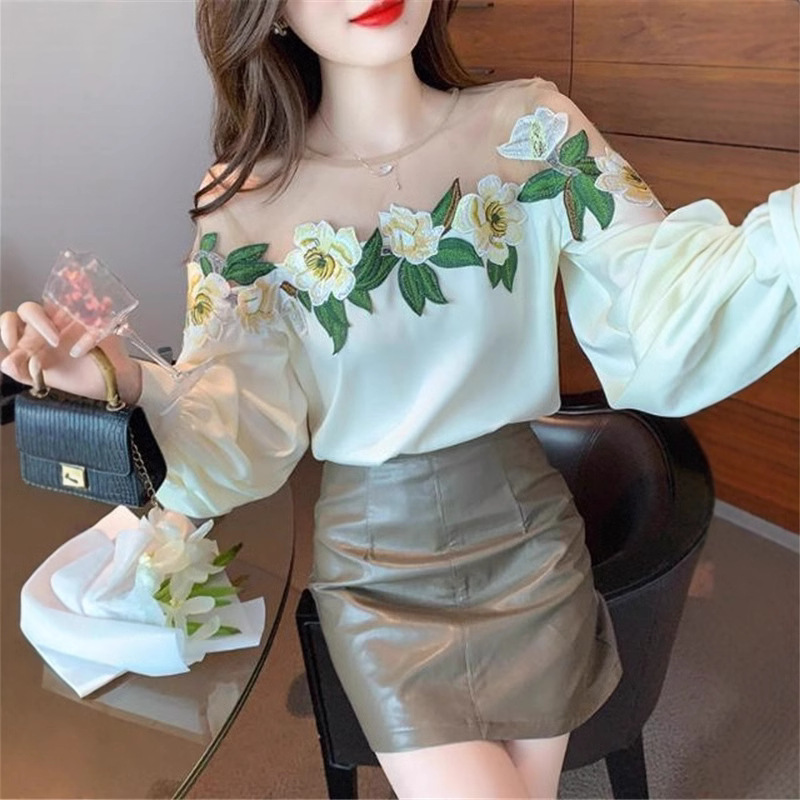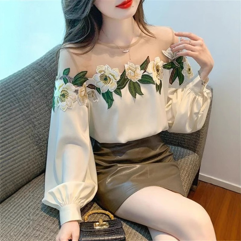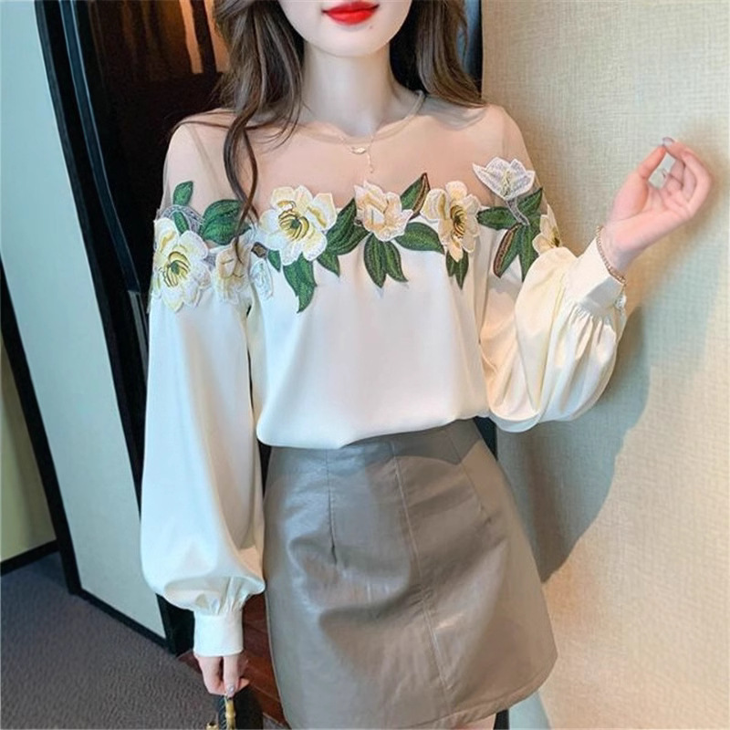 디자인 메쉬 스플 라이스 셔츠 여성용 봄 2025 새로운 중공업 자수 꽃 셔츠 세련되고 아름다운 셔츠스토어 가기