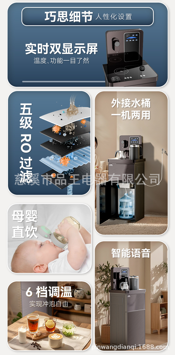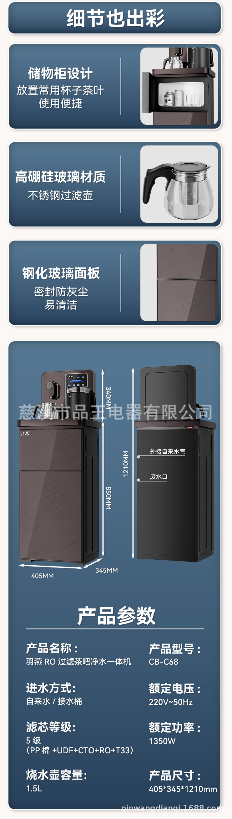 慈溪市品王电器有限公司是一家专注于家用饮水设备、净水技术研发与加工制造OEM,集研发、生产、销售为一体的专业性企业,旗下拥有羽燕、英格码等优质品牌,专业生产茶吧机、饮水机、取暖器、净水器等系列小家电! 公司在新品开发,新技术应用等方面投入了大量的人力,财力。产品远销欧美、中东、非洲、东亚等国家和地区,产品受到广大客户的一致好评,我们将不断的努力,用科技铸造精品,实现让中国人喝上健康好水的目标,为此我们将不断的努力奋斗.服务每一位客户.