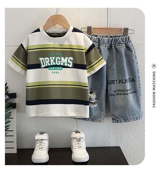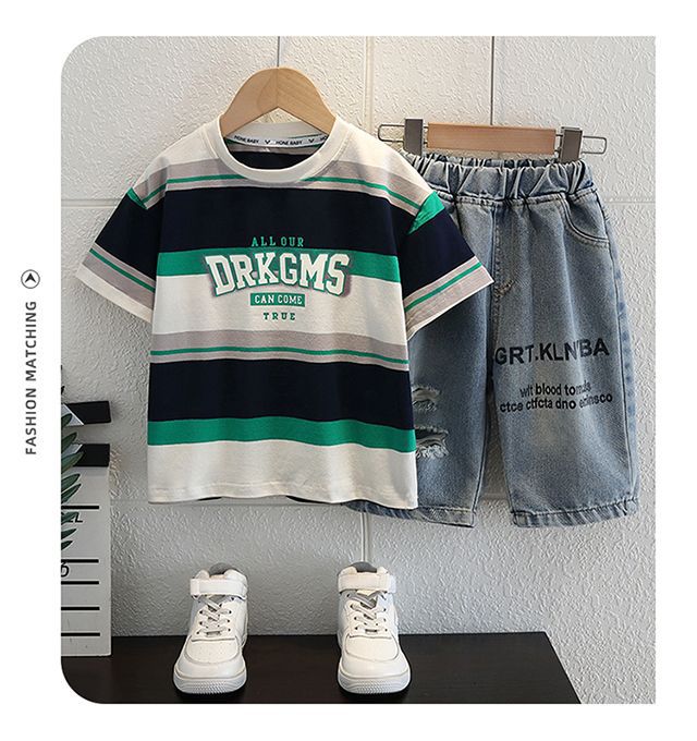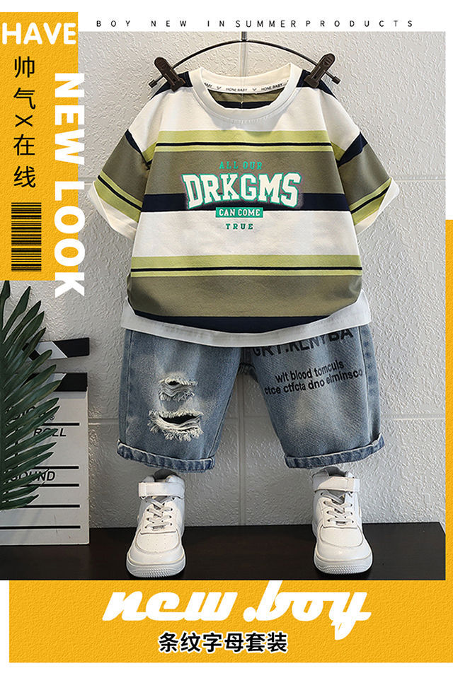 소년의 반팔 세트 인터넷-유명한 아기의 여름 유행 옷 2024 새로운 유행 어린이 여름 원피스 줄무늬 투피스 세트스토어 가기