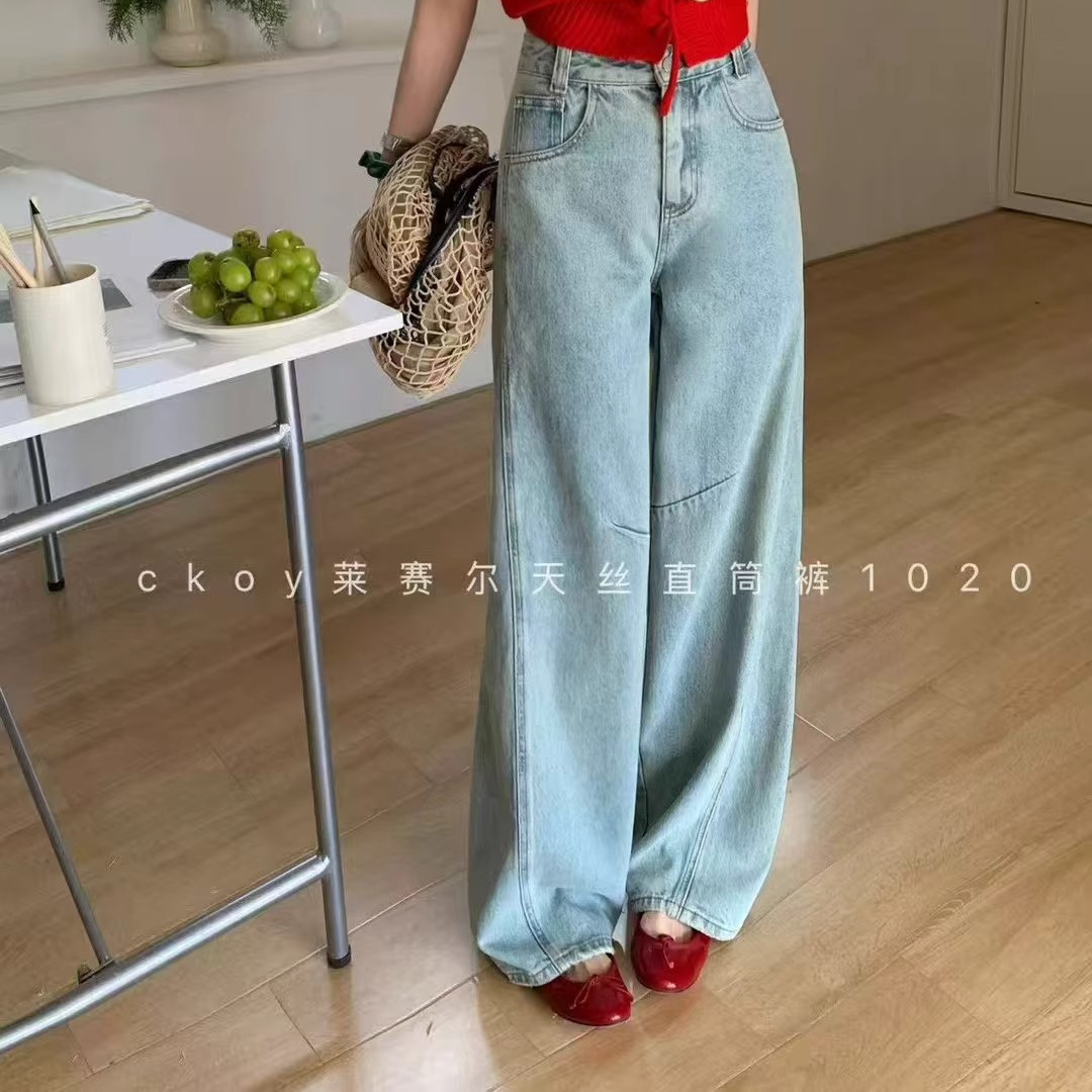 라이트 블루 하이 웨이스트 카고 와이드 레그 청바지 여성 봄 루즈 슬리밍 다목적 스트레이트 레그 바지 D1020