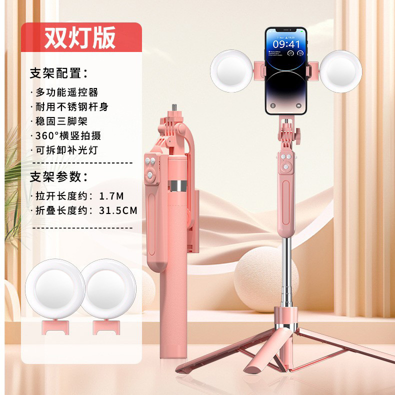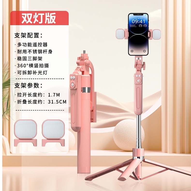 • 핑크 1.7m 손떨림 방지 셀카봉 충전 블루투스 리모컨 + 작은 사각형 조명 2개