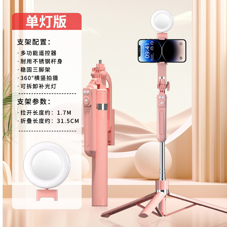 • 핑크 1.7m 손떨림 방지 셀카봉 충전 블루투스 리모컨 + 작은 사각형 조명