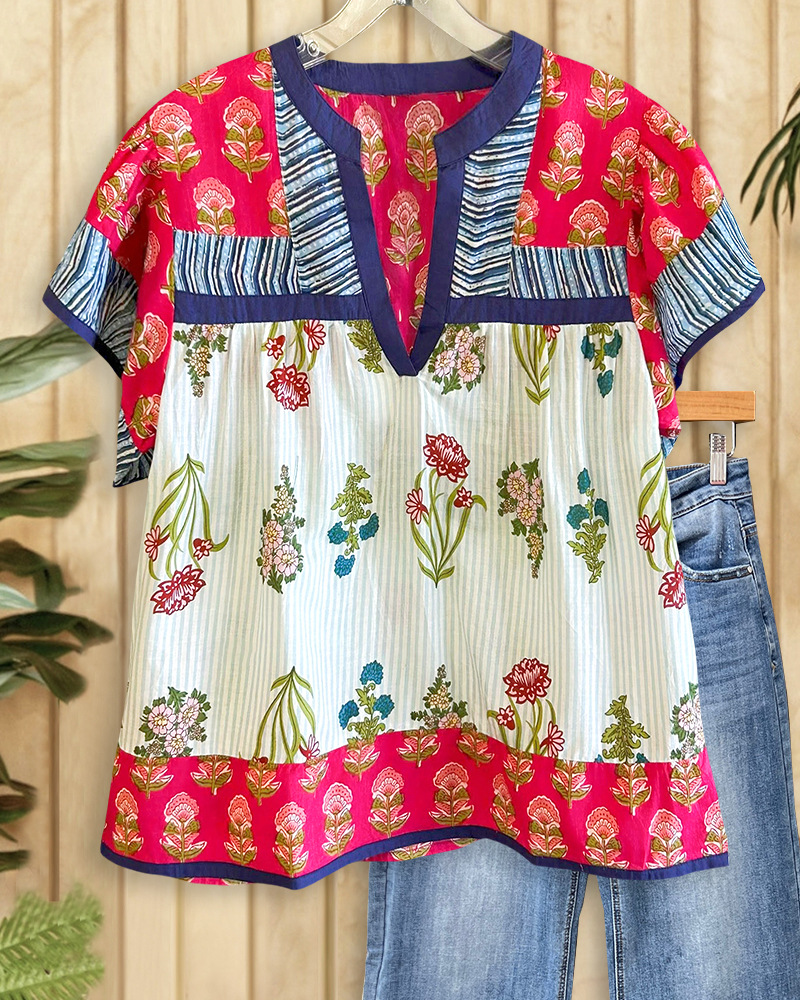 국경 2025 여름 새로운 독립 역 TEMU 국경 유럽과 미국 여성의 느슨한 캐주얼 인쇄 둥근 목 셔츠
