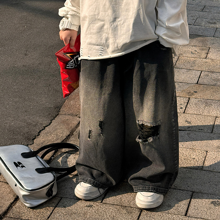2026년 가을 신상 남아용 블랙 데미지 진, 한국 스타일 아동용 루즈핏 스트레이트 레그, 남자아이들을 위한 트렌디한 롱 팬츠스토어 가기
