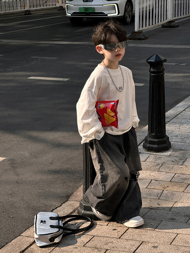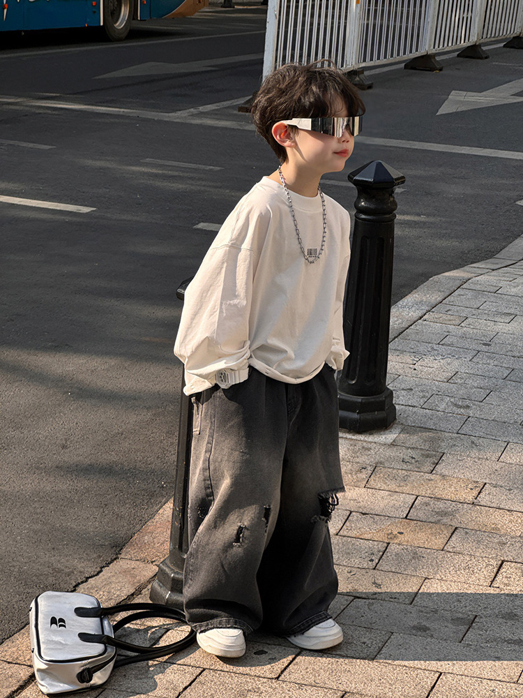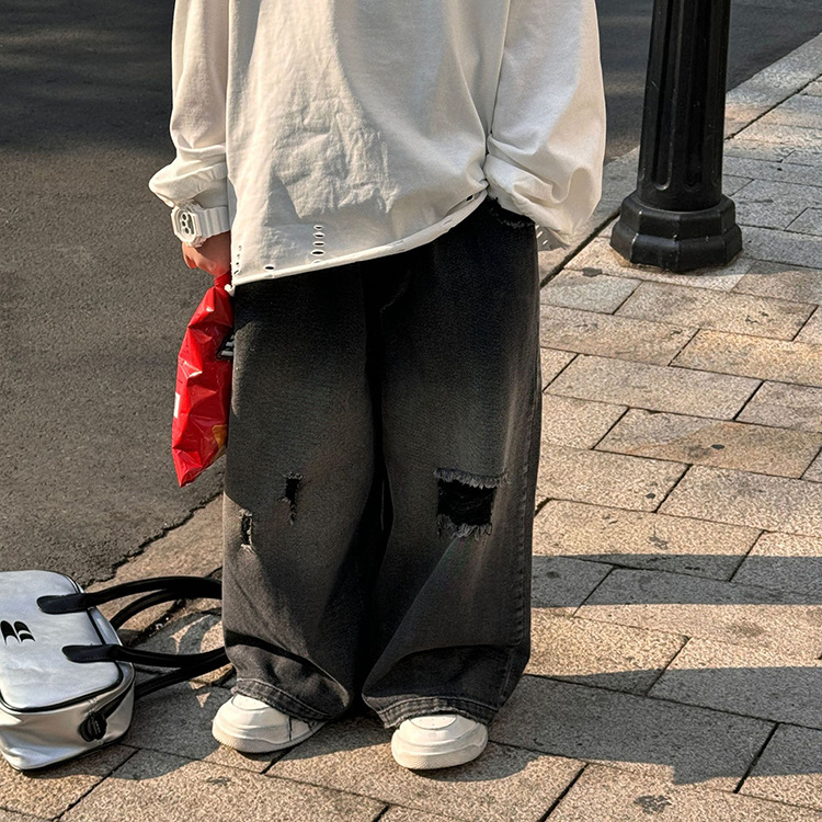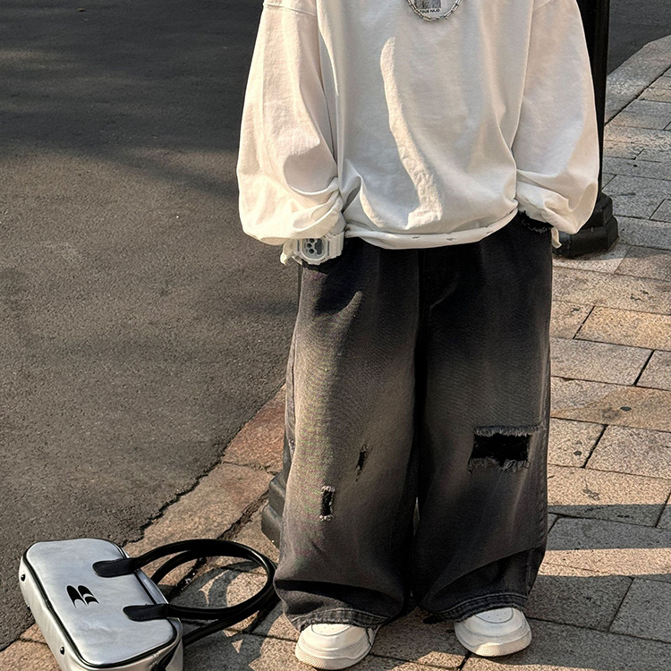 2026년 가을 신상 남아용 블랙 데미지 진, 한국 스타일 아동용 루즈핏 스트레이트 레그, 남자아이들을 위한 트렌디한 롱 팬츠