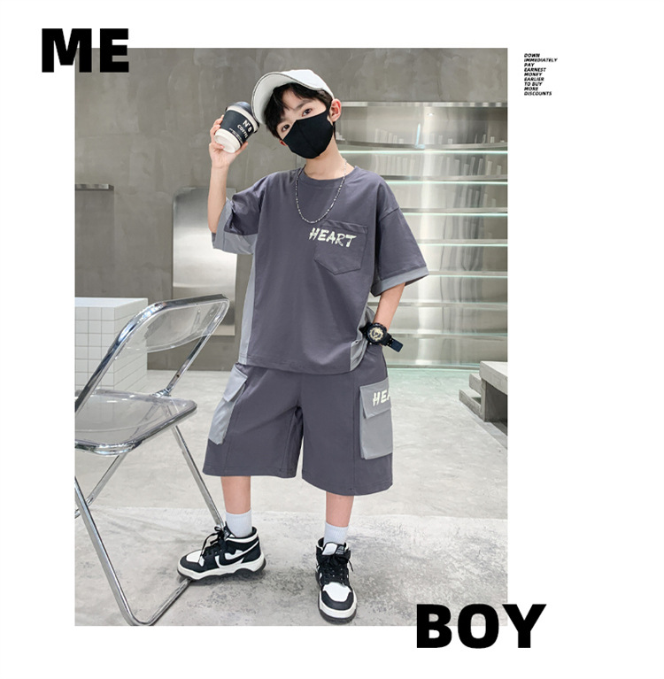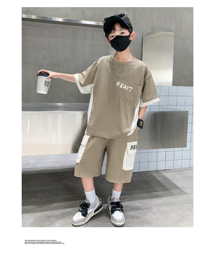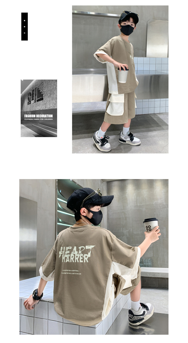 소년 세트 2025 여름 새로운 도착 CUHK 어린이 유행 서양식 반팔 티셔츠 및 5 피스 바지 2 피스 세트