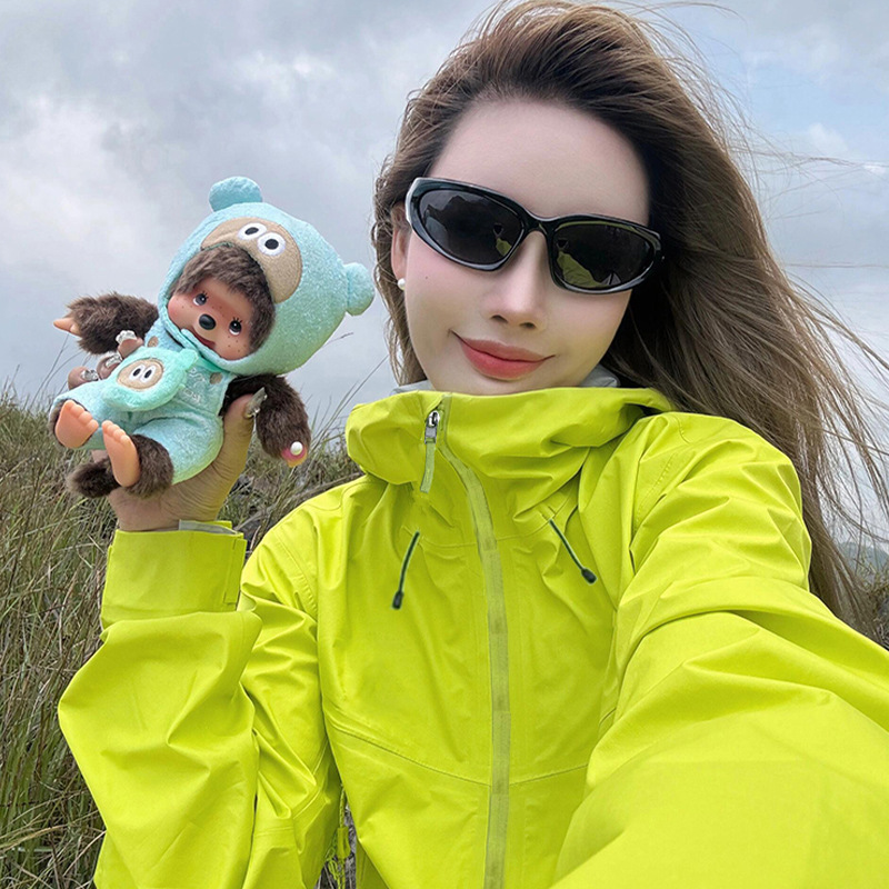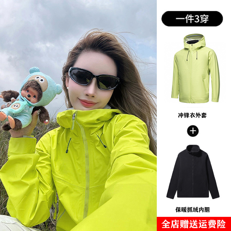 여성을위한 미국 도파민 야외 재킷 2025 봄, 가을 새로운 형광 녹색 방풍 및 방수 후드 재킷