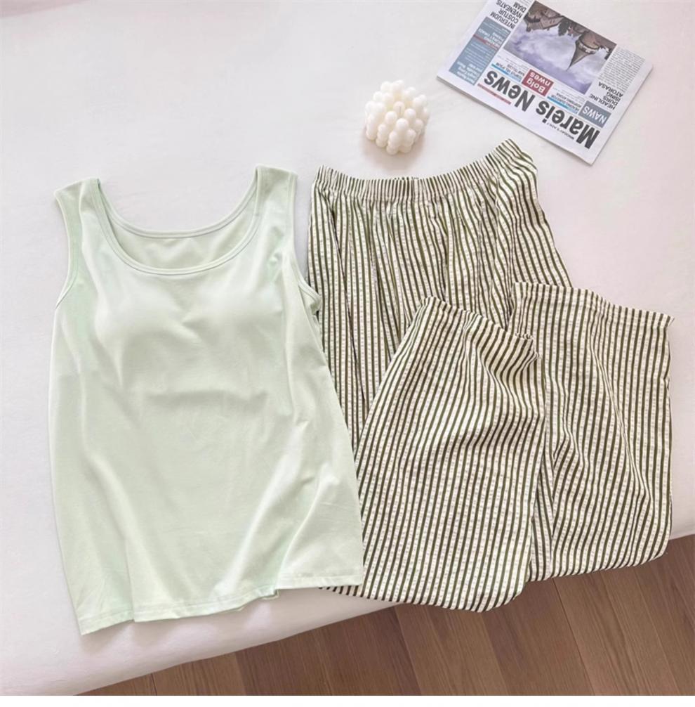 가슴 패드와 카미 솔 세트 파자마 여성 여름 느슨한 여성 최고 모방 면 바지 구름 면화