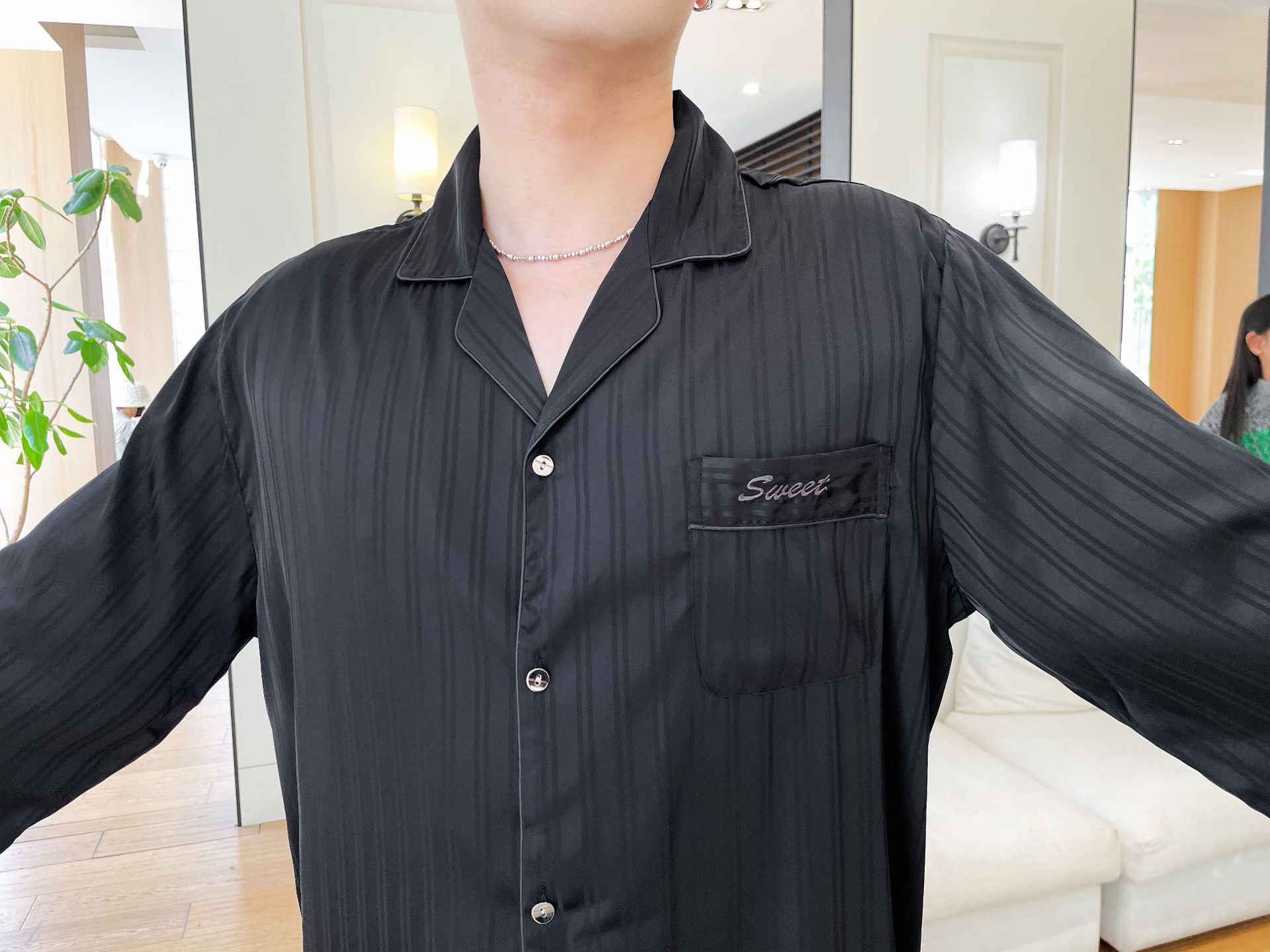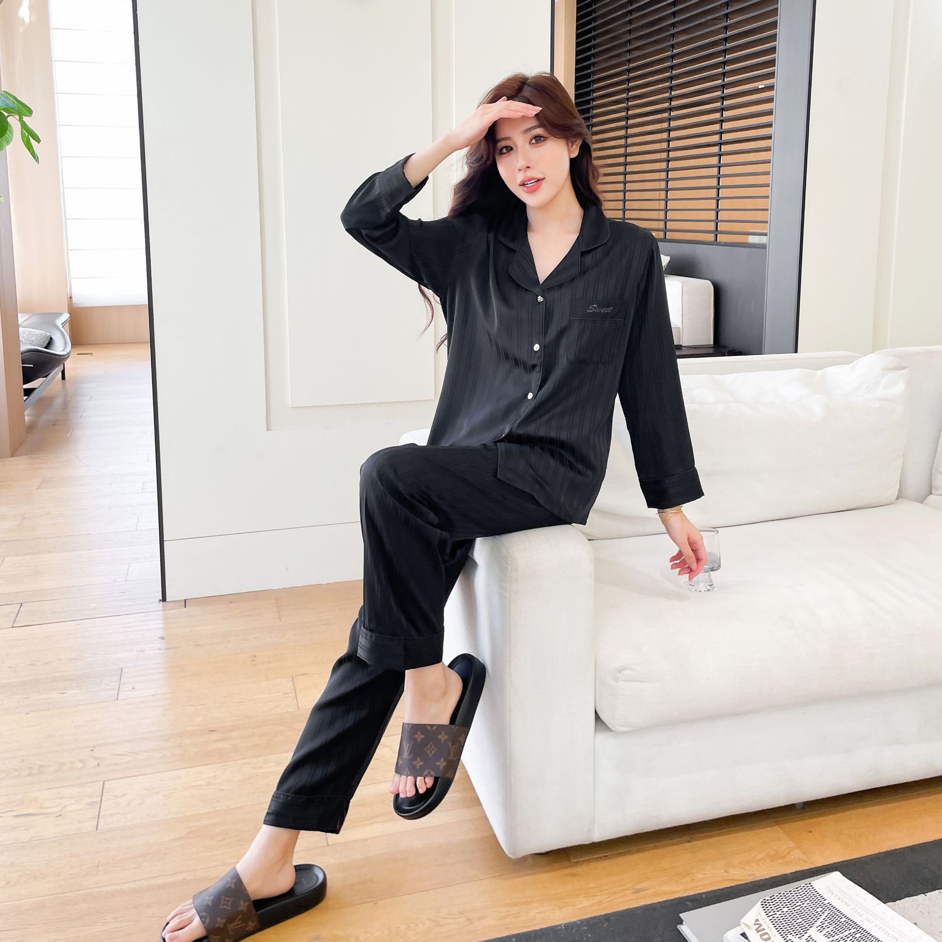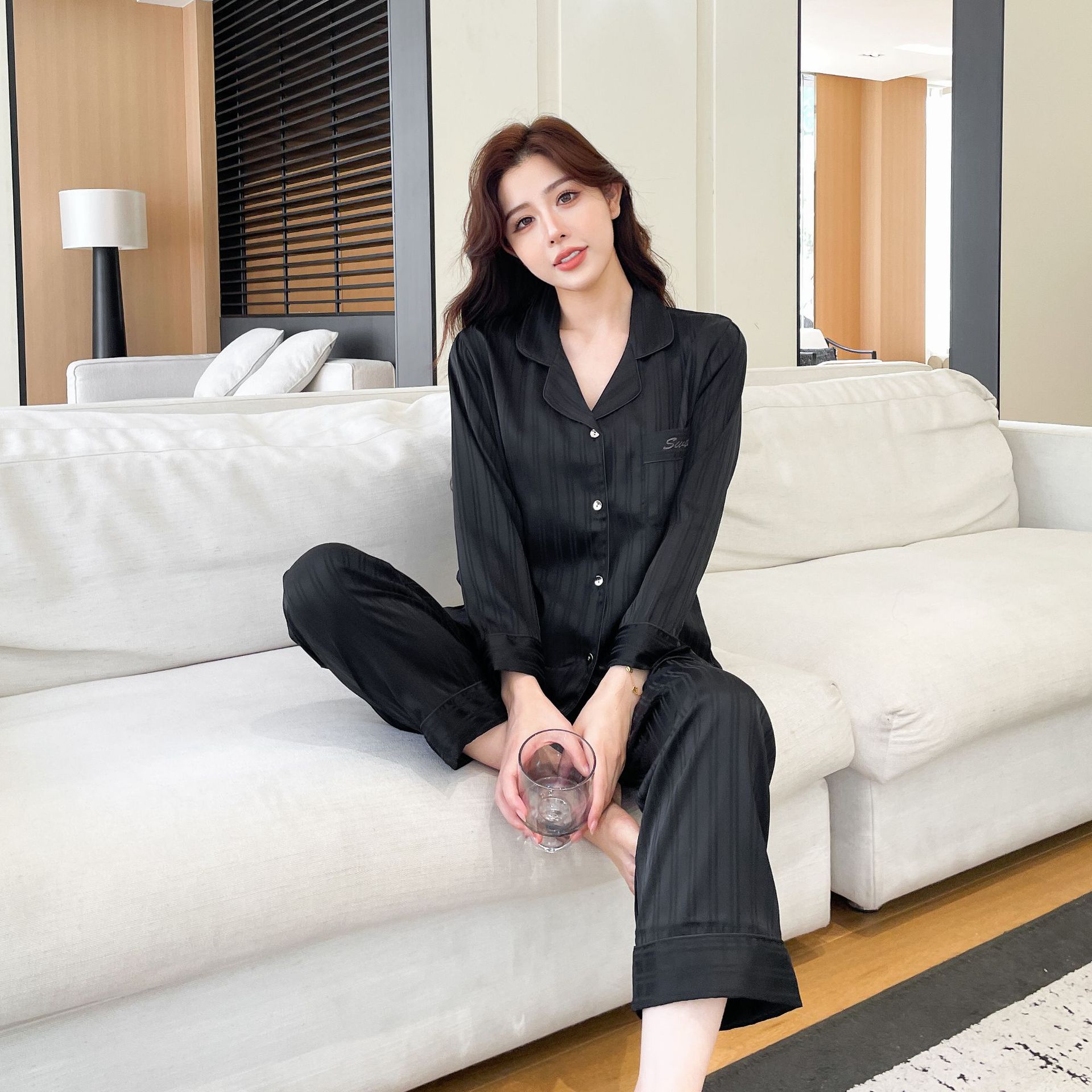 2025 새로운 남성 잠옷 여성 아이스 실크 봄과 여름 얇은 하이 엔드 감각 작은 수직 긴 소매 커플 홈 의류 세트스토어 가기