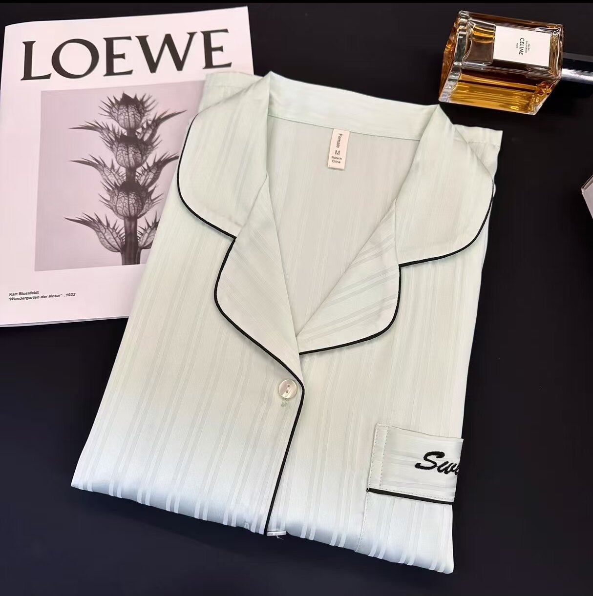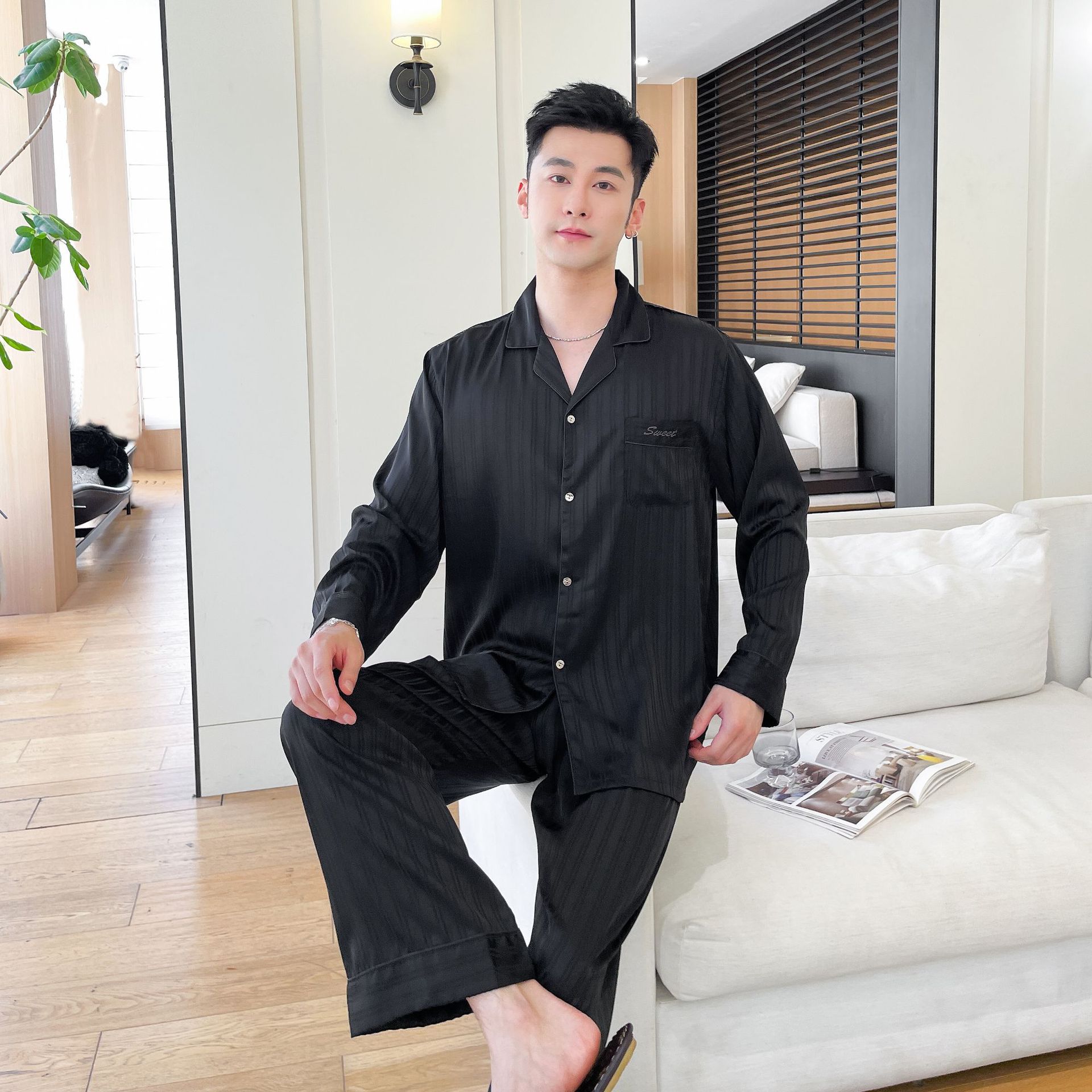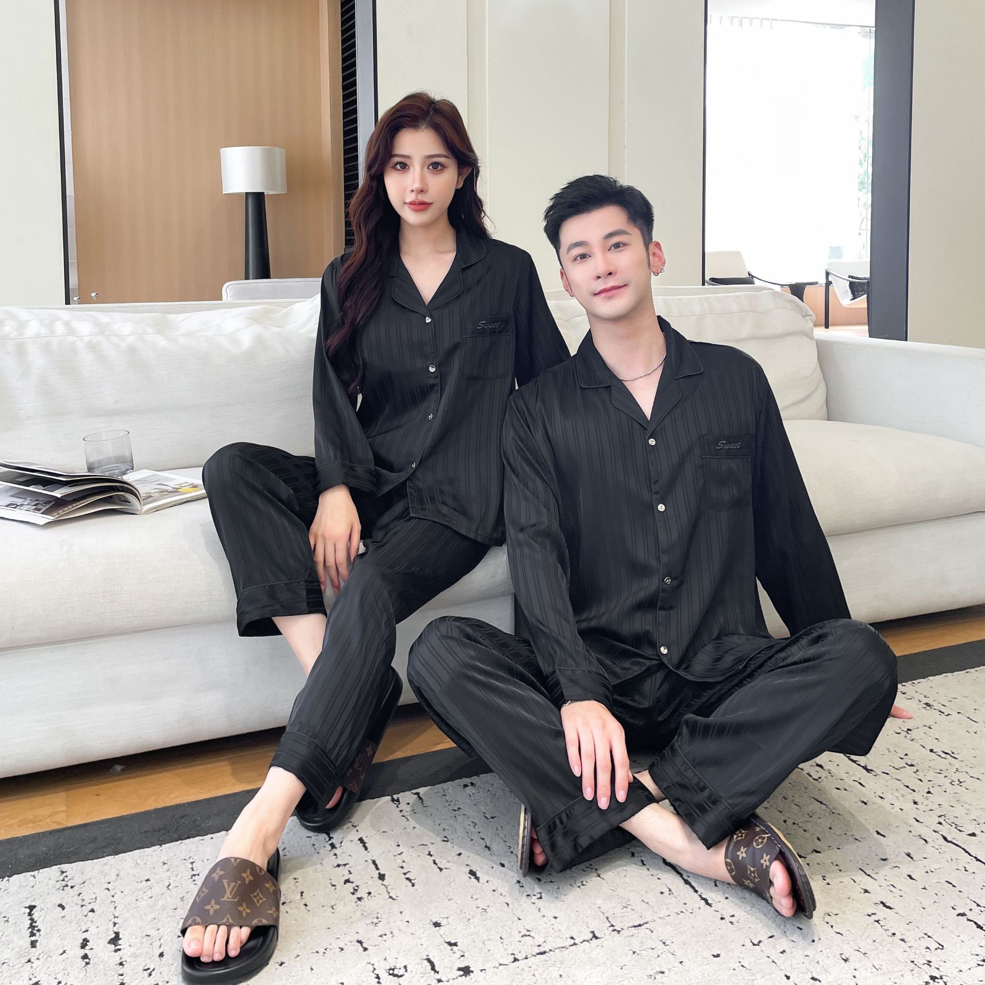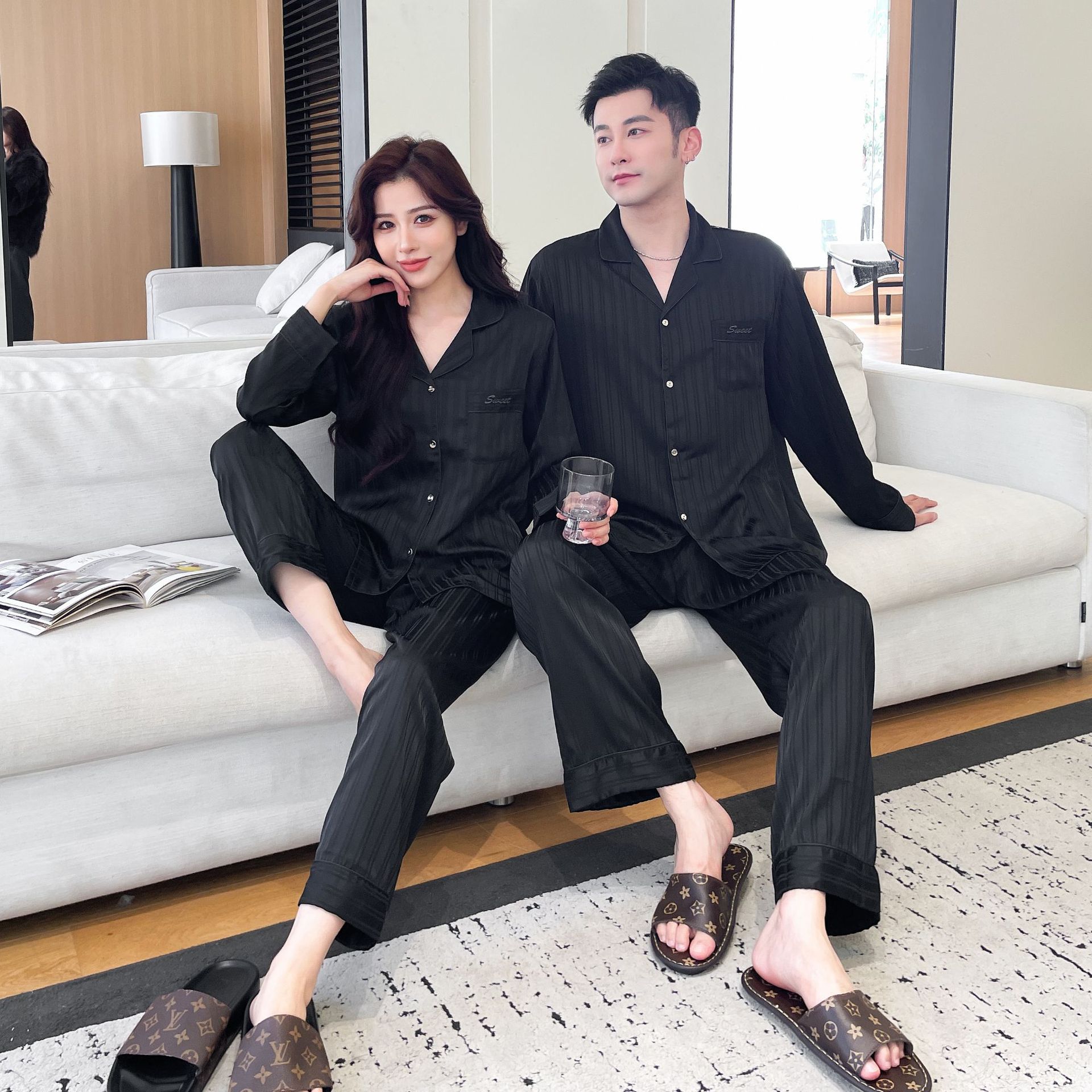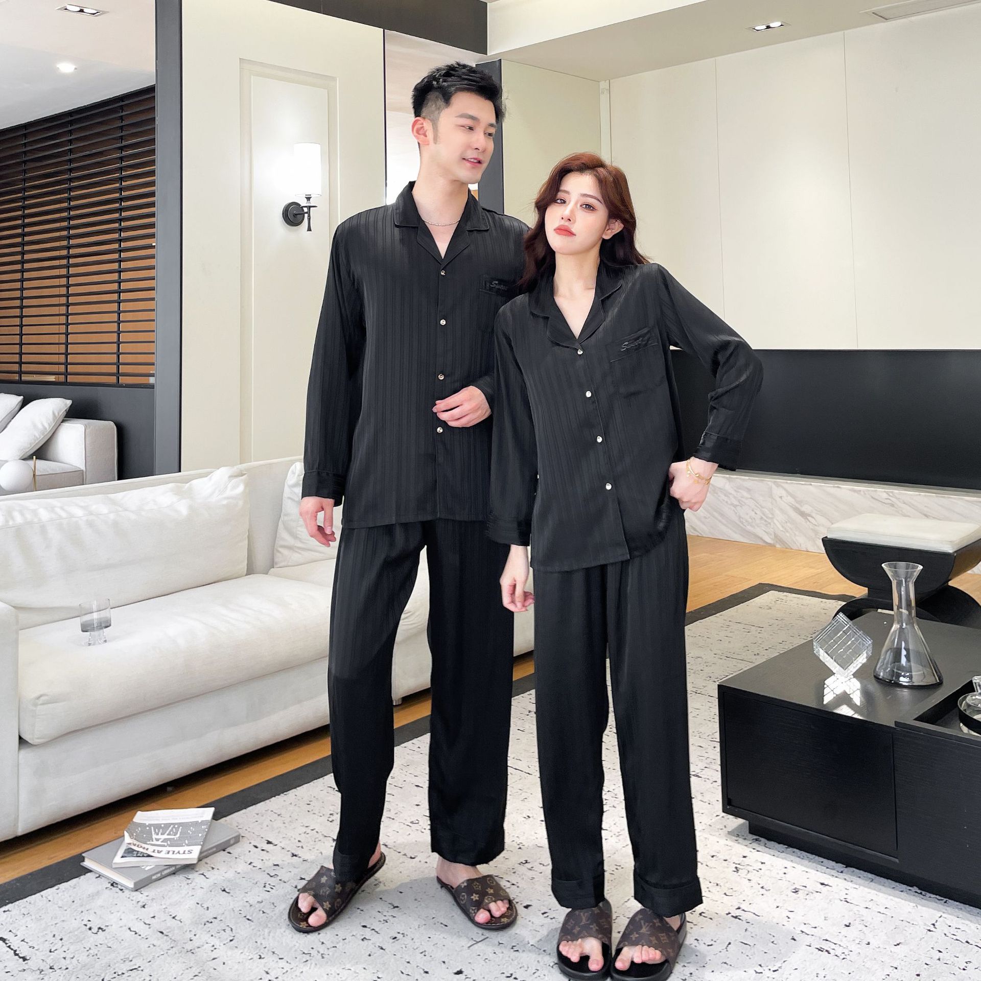 2025 새로운 남성 잠옷 여성 아이스 실크 봄과 여름 얇은 하이 엔드 감각 작은 수직 긴 소매 커플 홈 의류 세트