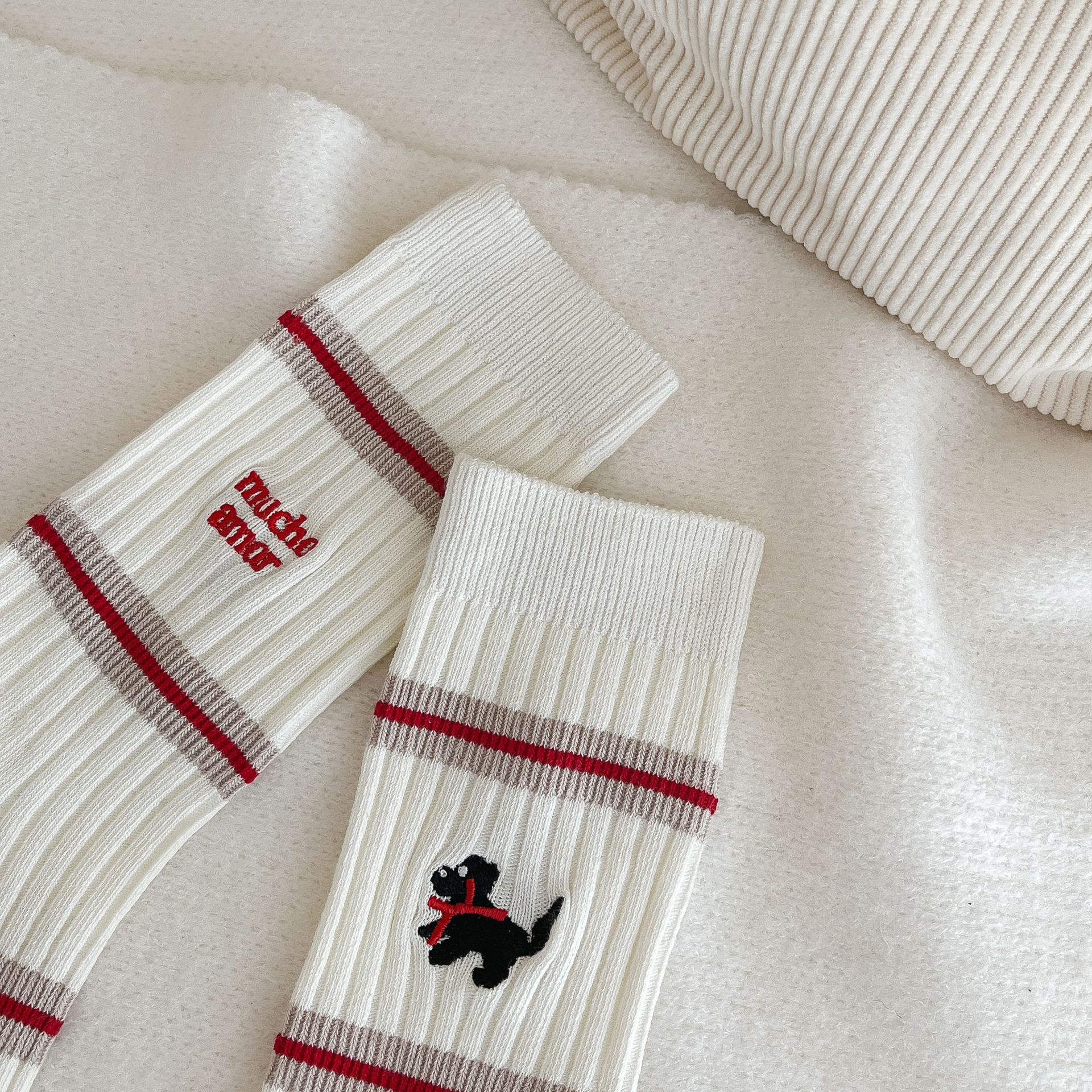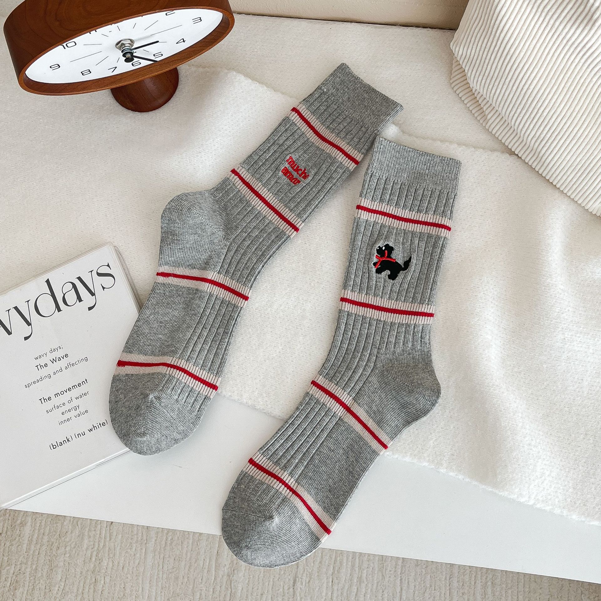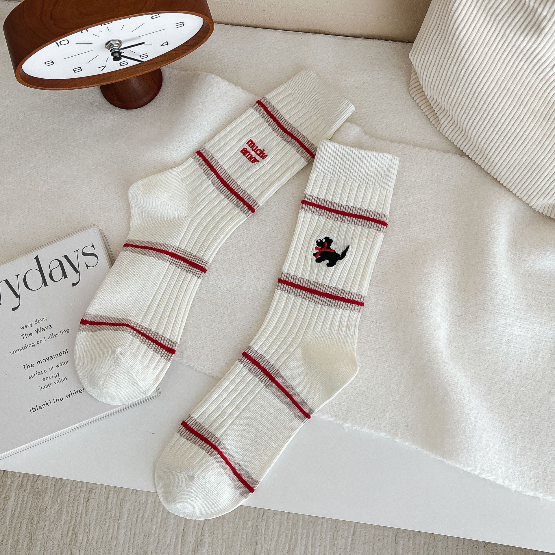 AB면 비대칭 스트라이프 양말 여성용 트렌디 종아리 양말 귀여운 자수 강아지 대학 스타일 인터넷 연예인 종아리 양말스토어 가기