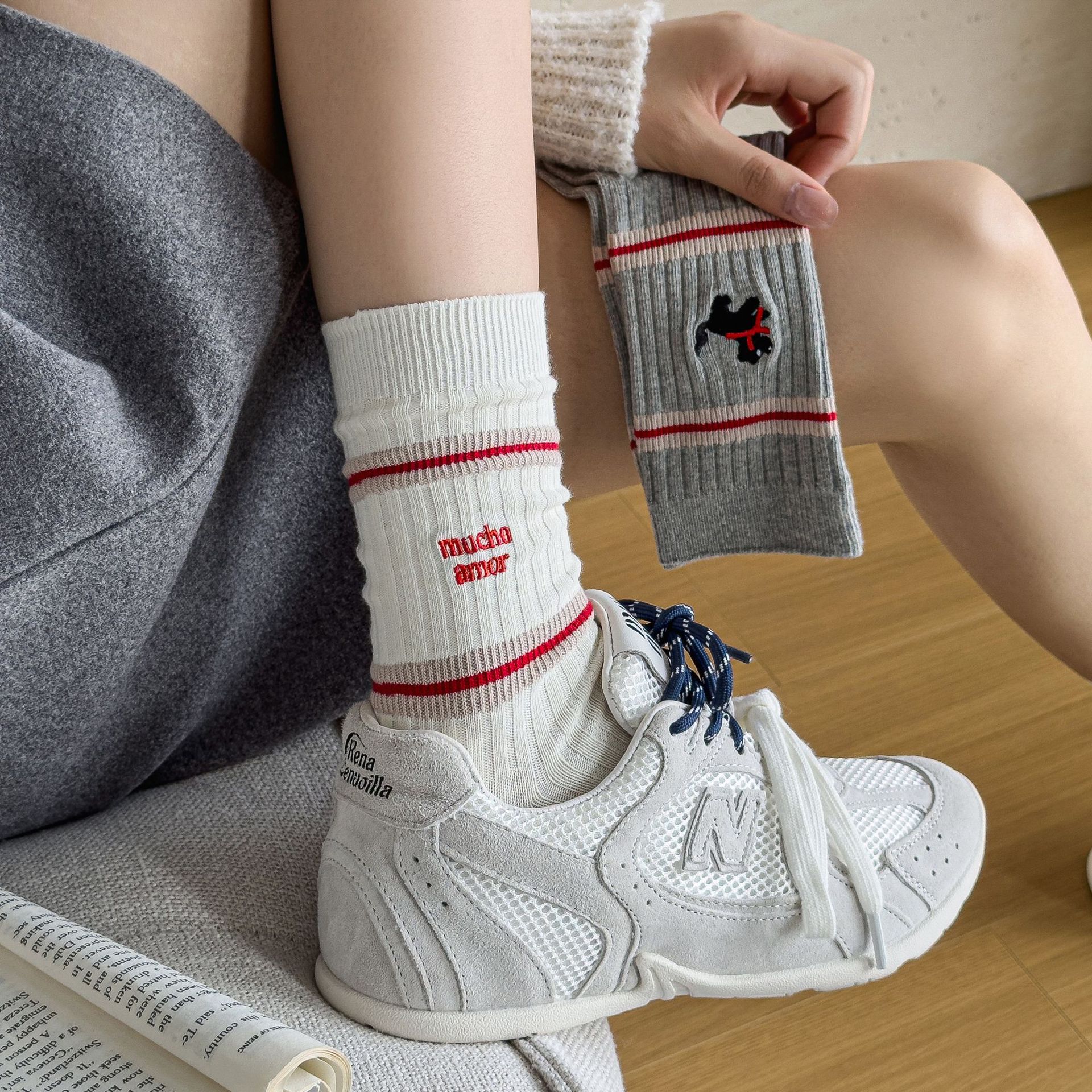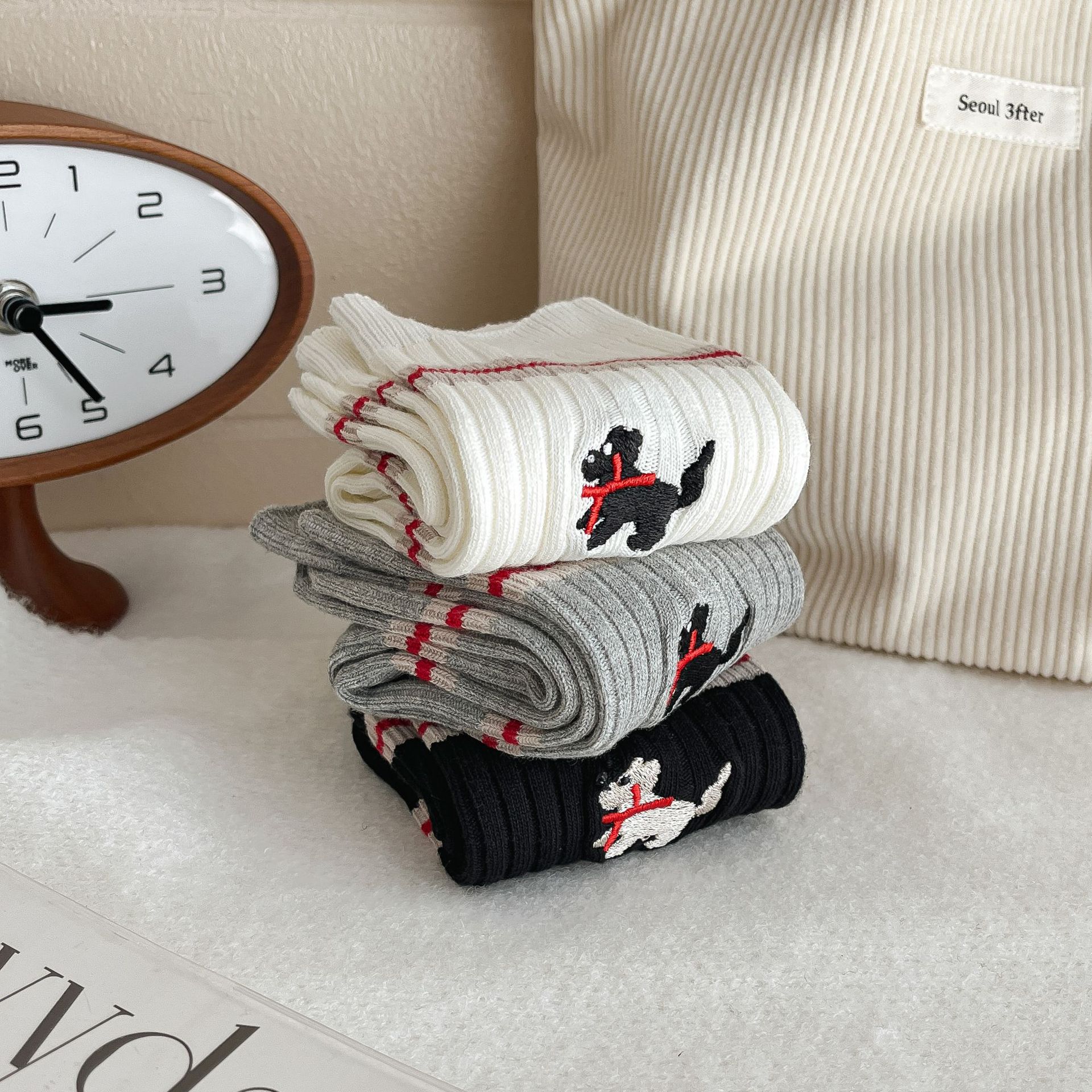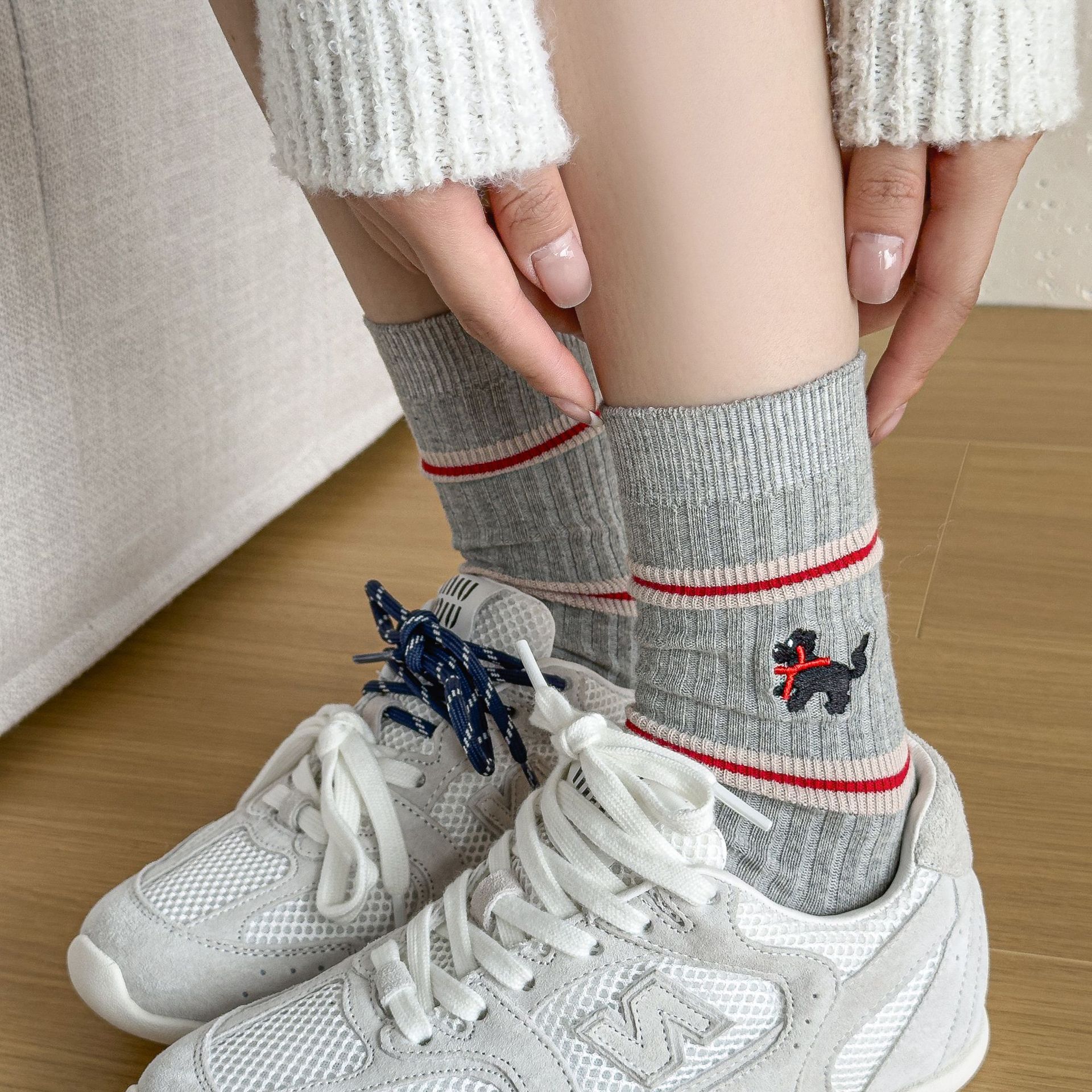 AB면 비대칭 스트라이프 양말 여성용 트렌디 종아리 양말 귀여운 자수 강아지 대학 스타일 인터넷 연예인 종아리 양말스토어 가기