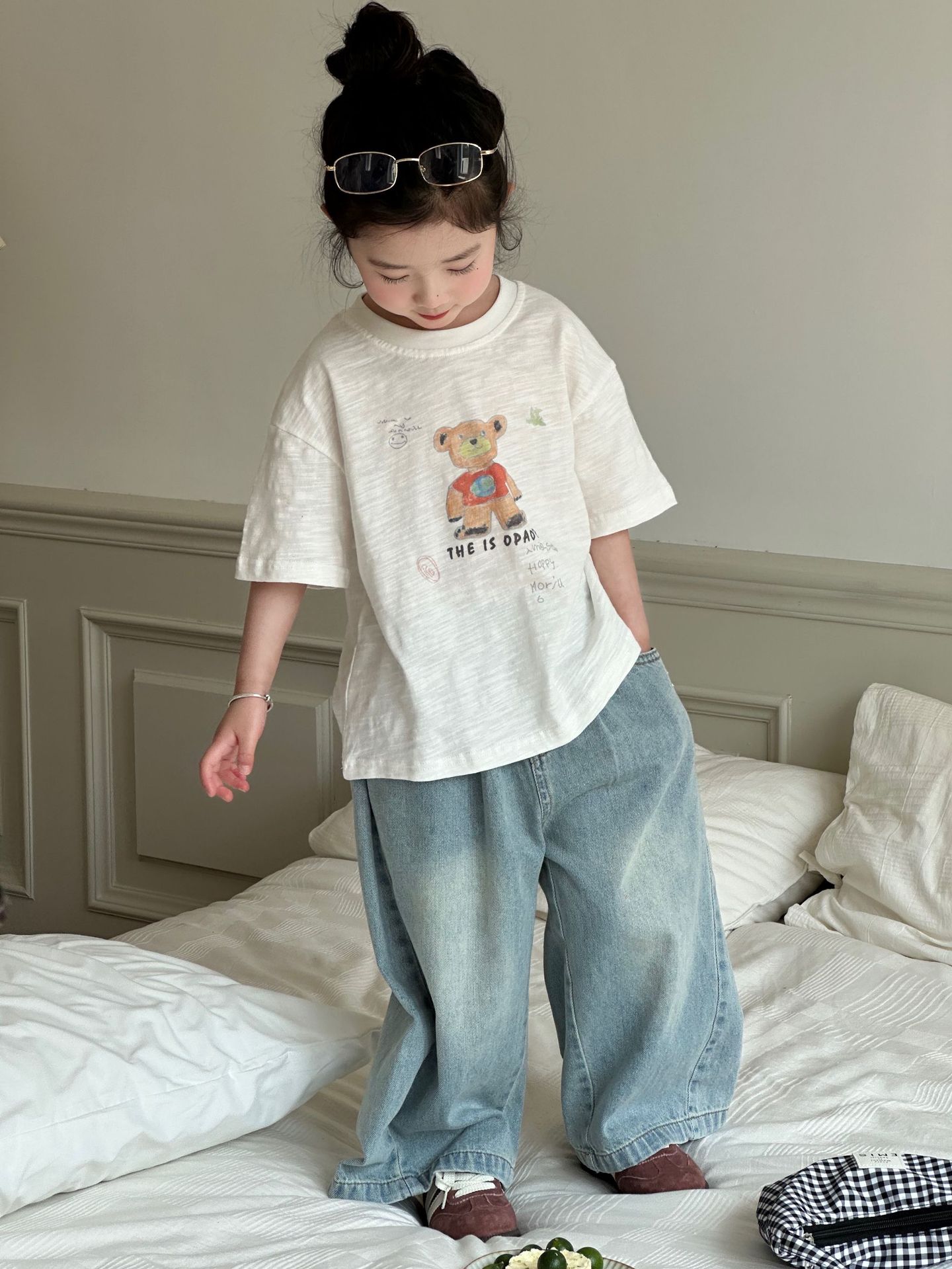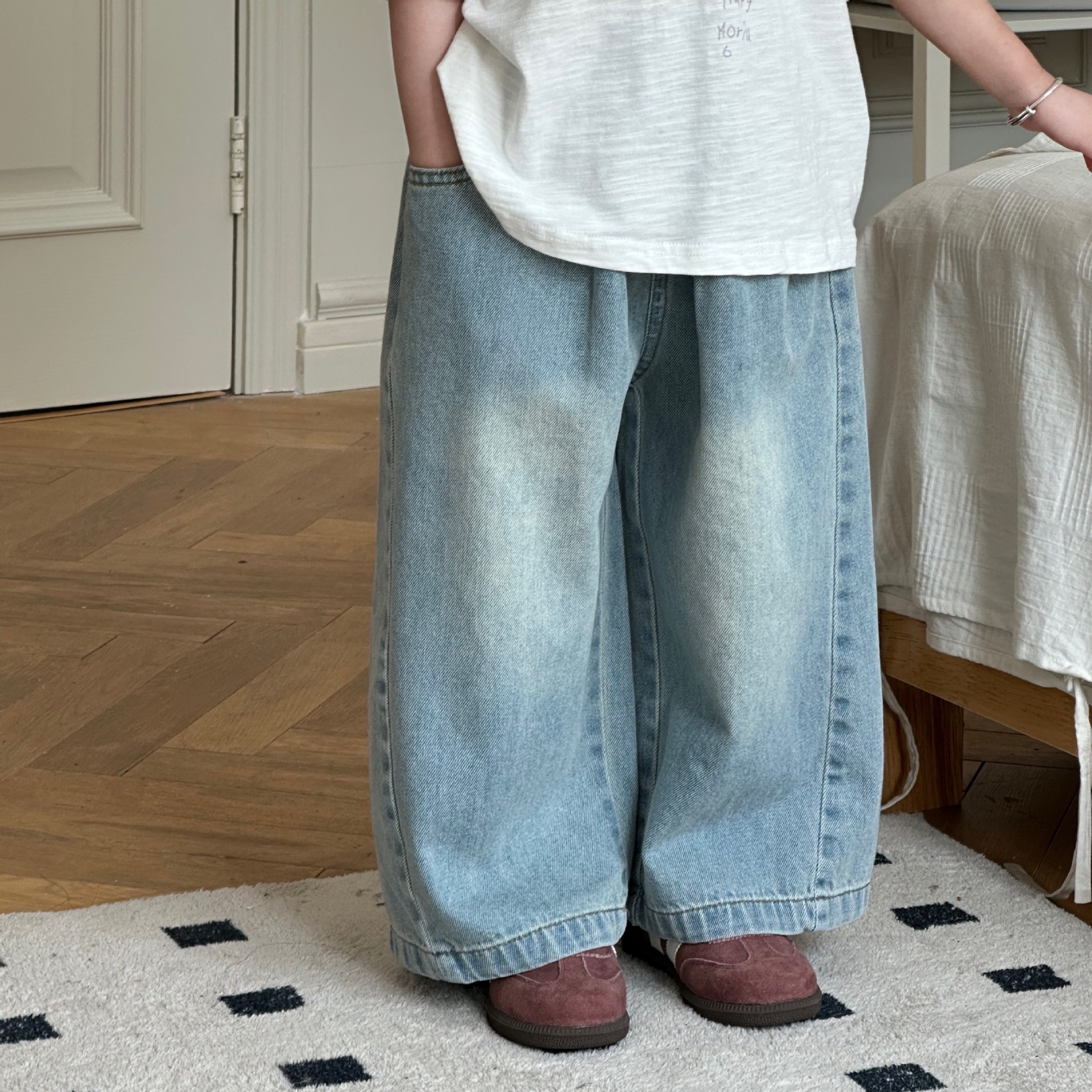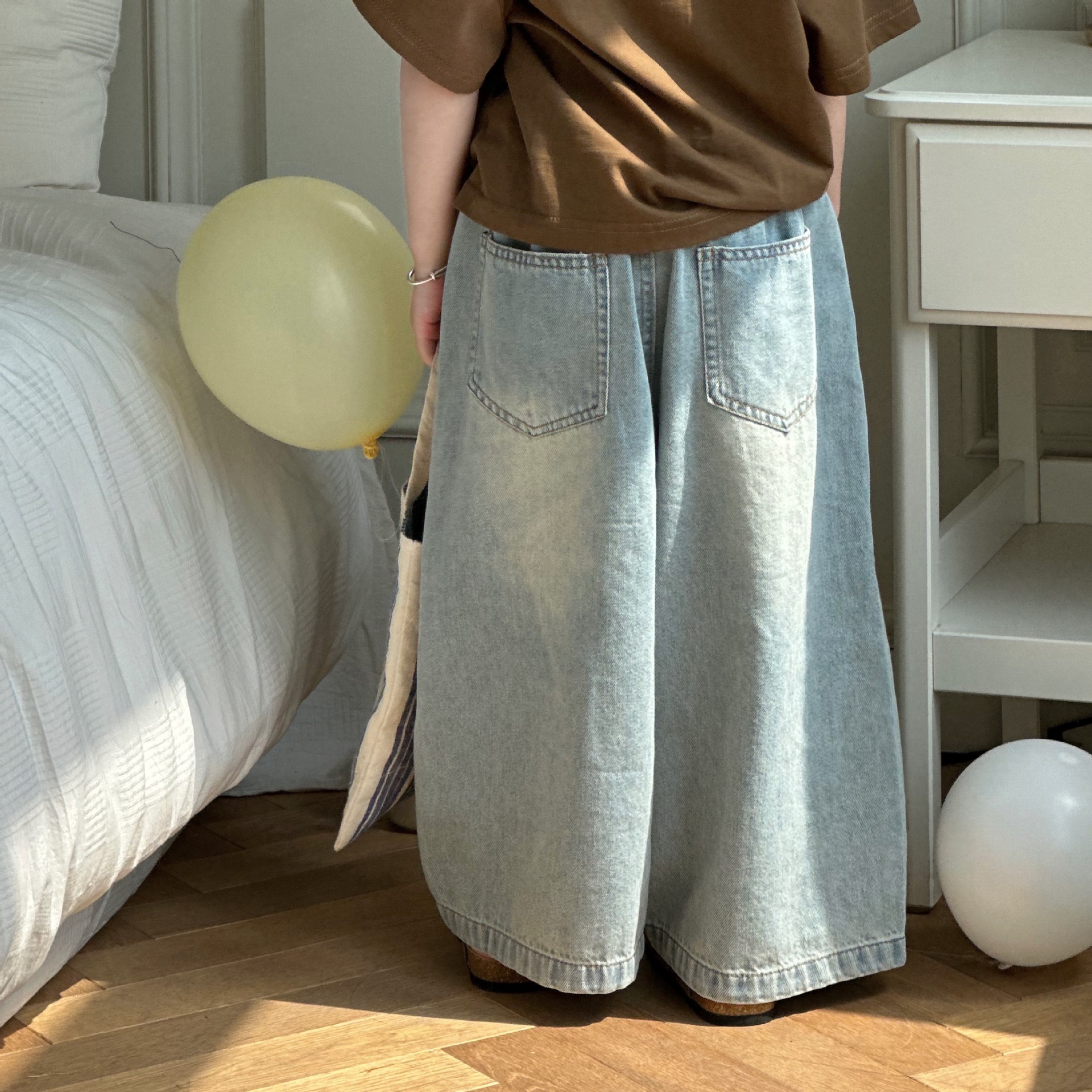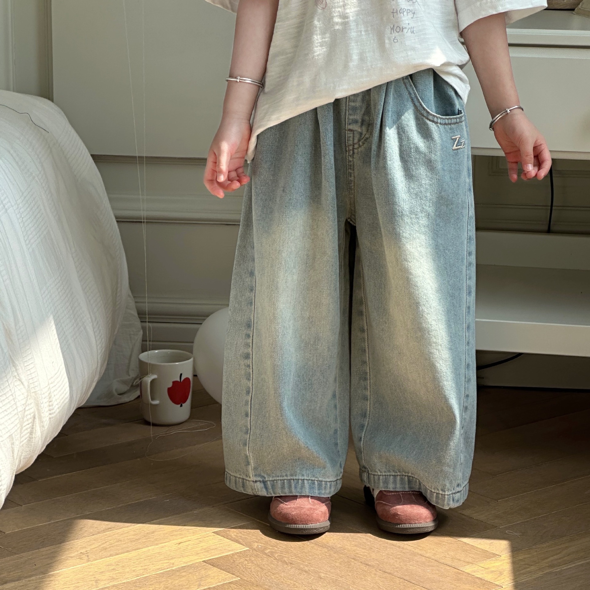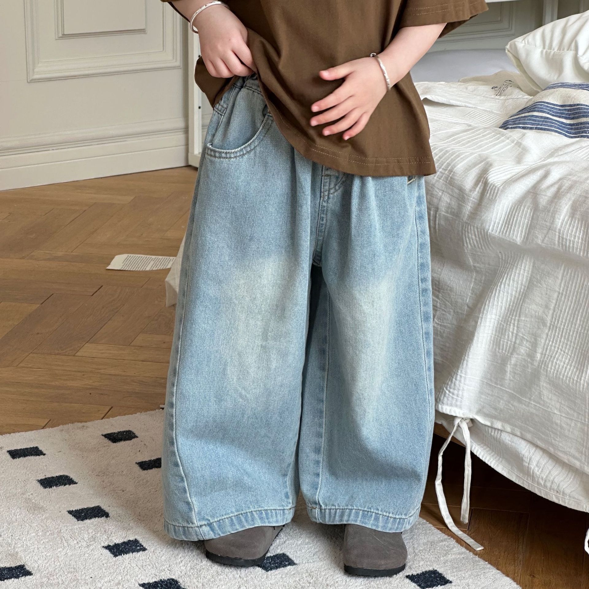 어린이 바지 한국 소녀 오래 된 부드러운 왁스 데님 스트레이트 바지 2024 새로운 아기 넓은 다리 바지스토어 가기