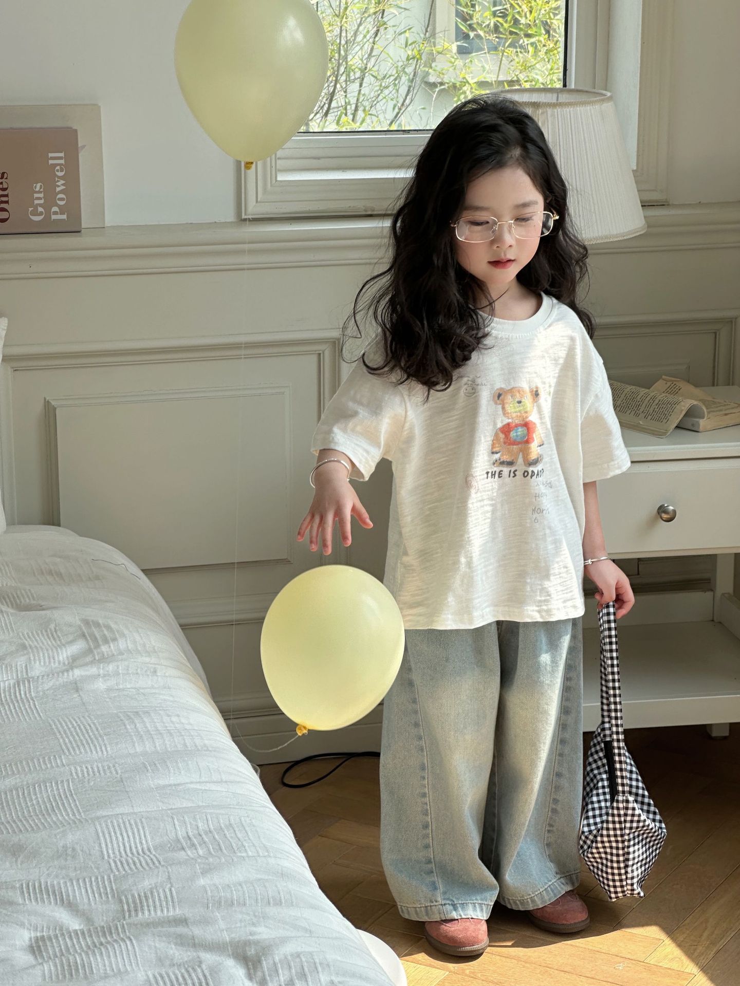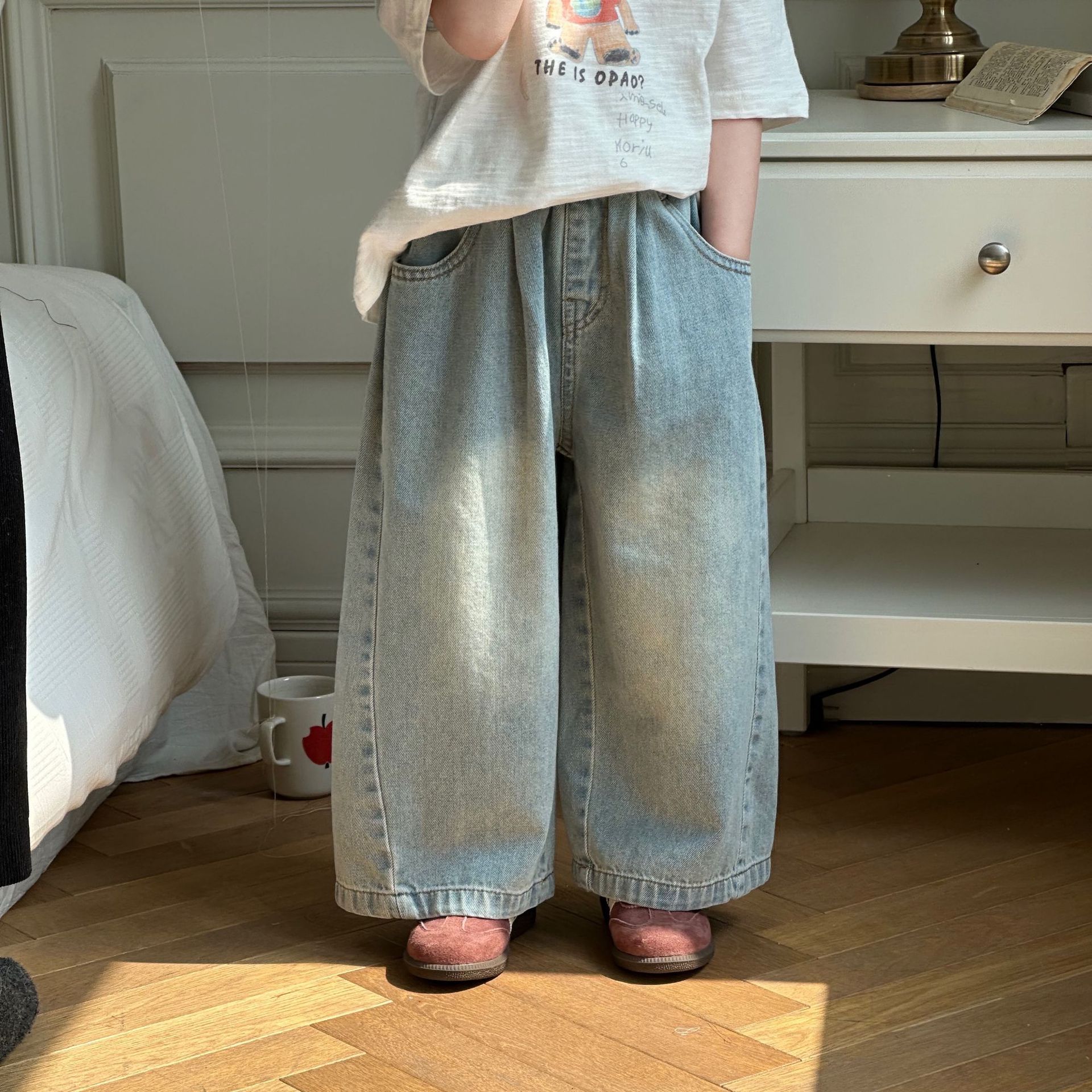 어린이 바지 한국 소녀 오래 된 부드러운 왁스 데님 스트레이트 바지 2024 새로운 아기 넓은 다리 바지
