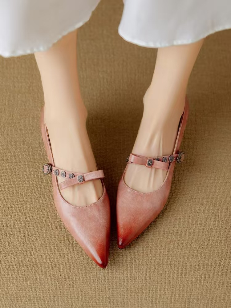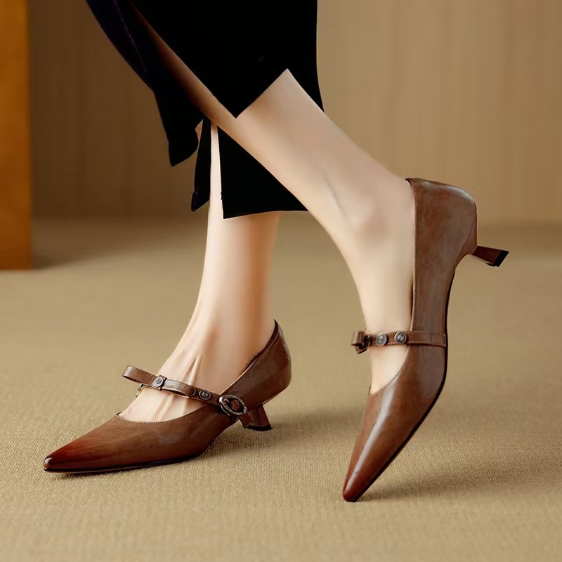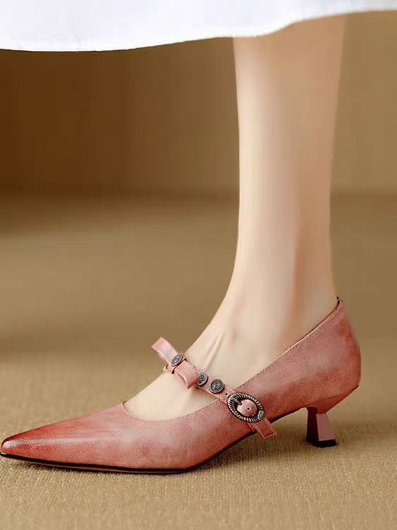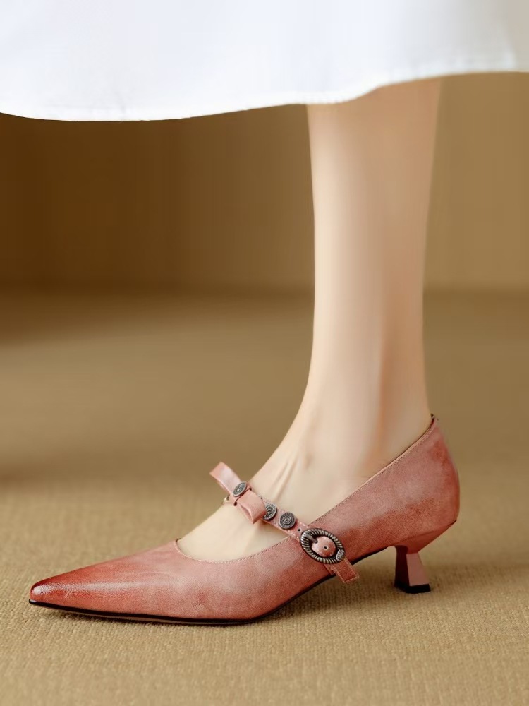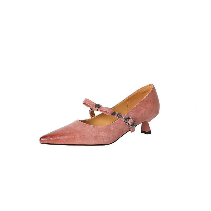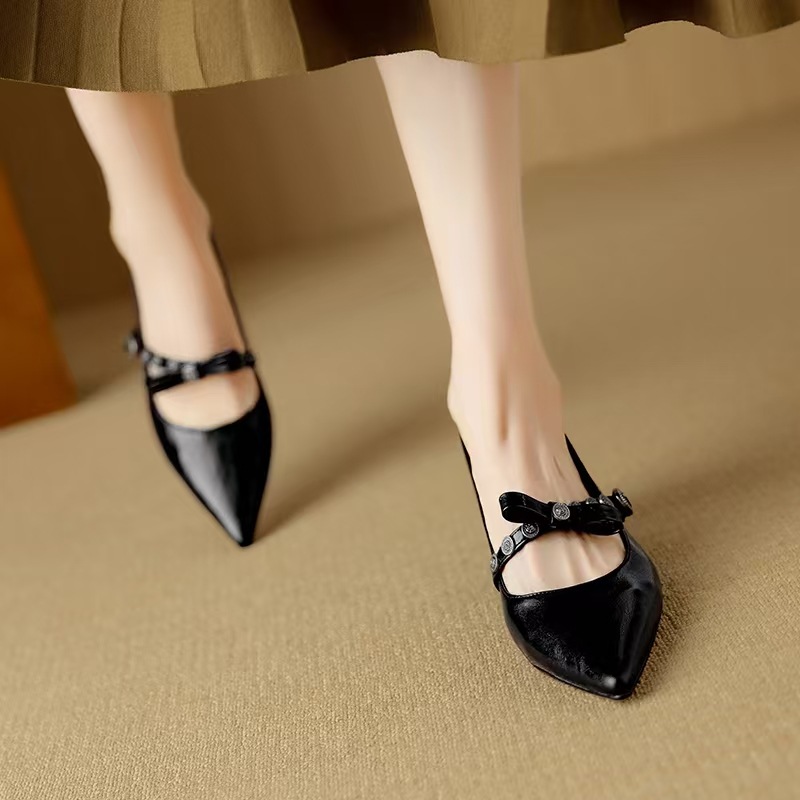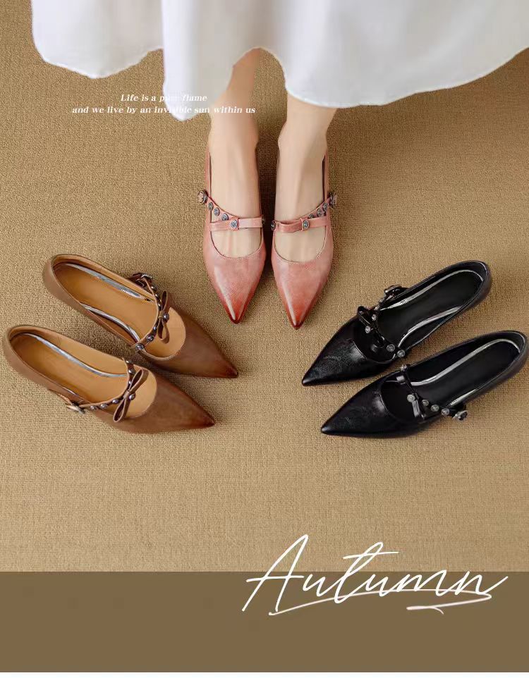 재고 있음 청두 스타일 소가죽 버전 메리제인 프렌치 스타일 여성용 뾰족코 봄 리본 장식 스터드 캣힐 페어리 슈즈
