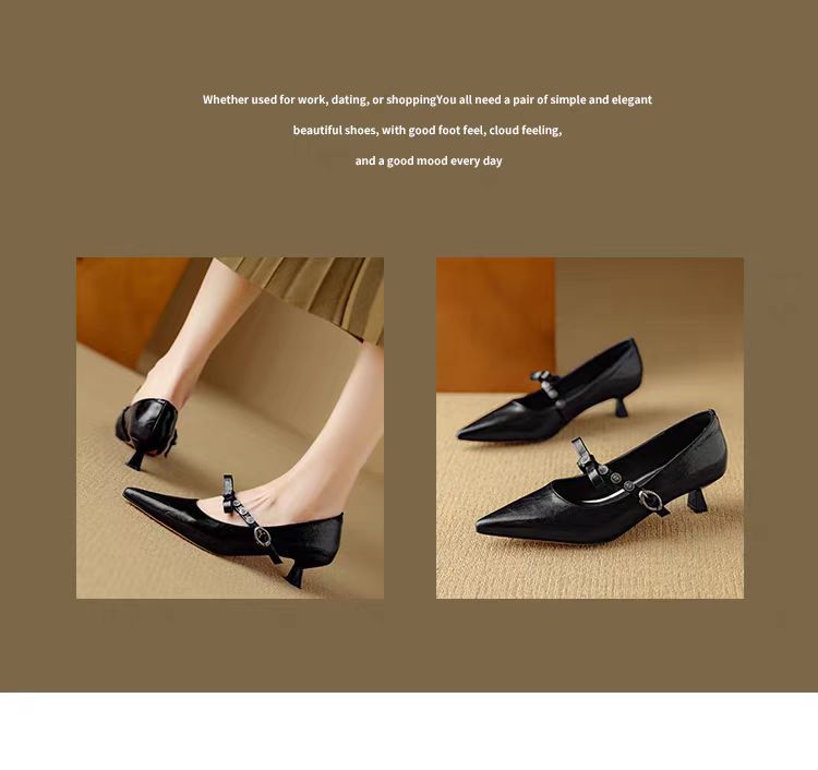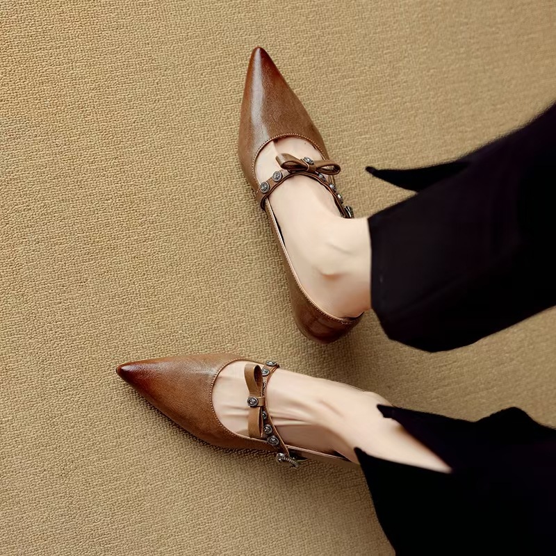 재고 있음 청두 스타일 소가죽 버전 메리제인 프렌치 스타일 여성용 뾰족코 봄 리본 장식 스터드 캣힐 페어리 슈즈스토어 가기