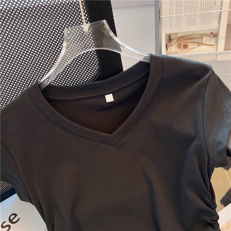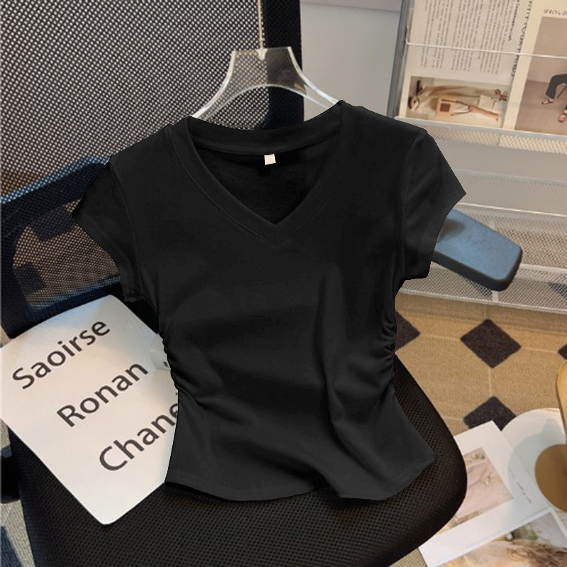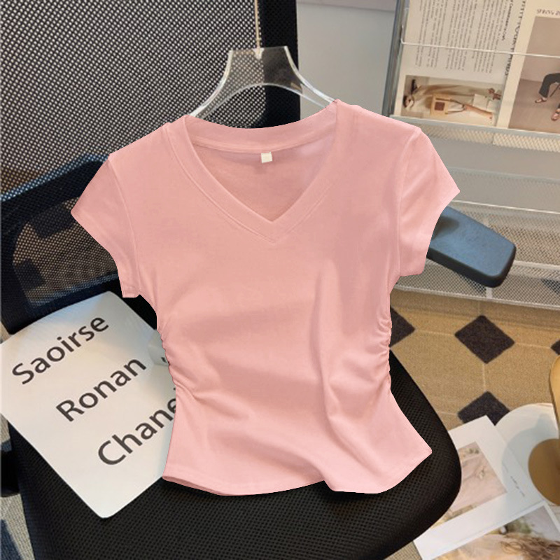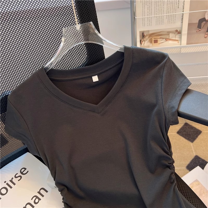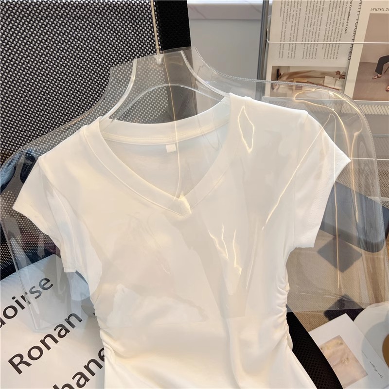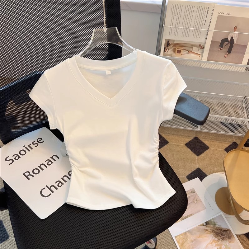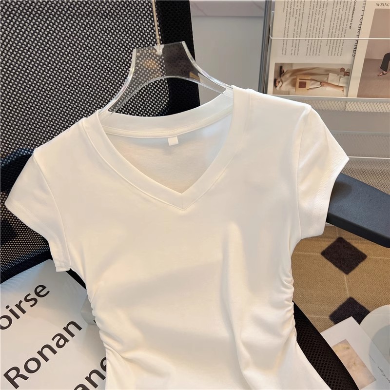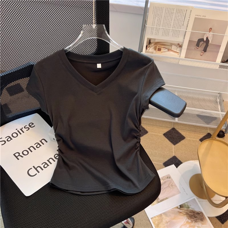 2025 여름 새로운 코튼 V 넥 슬림 핏 반팔 티셔츠 여성용 스파이스 걸스 숄더베이스 셔츠 주름 허리 탑 옷스토어 가기