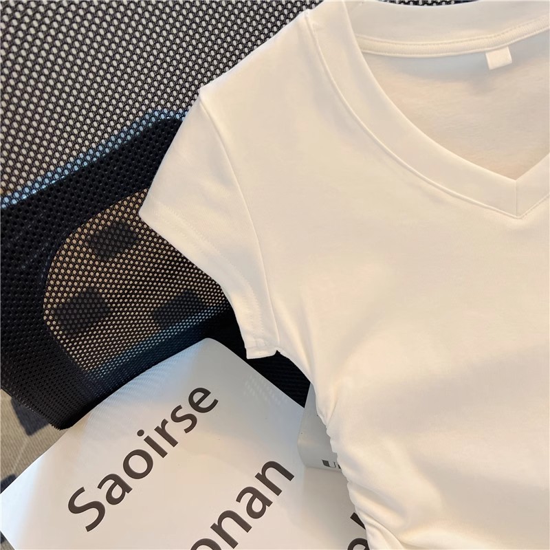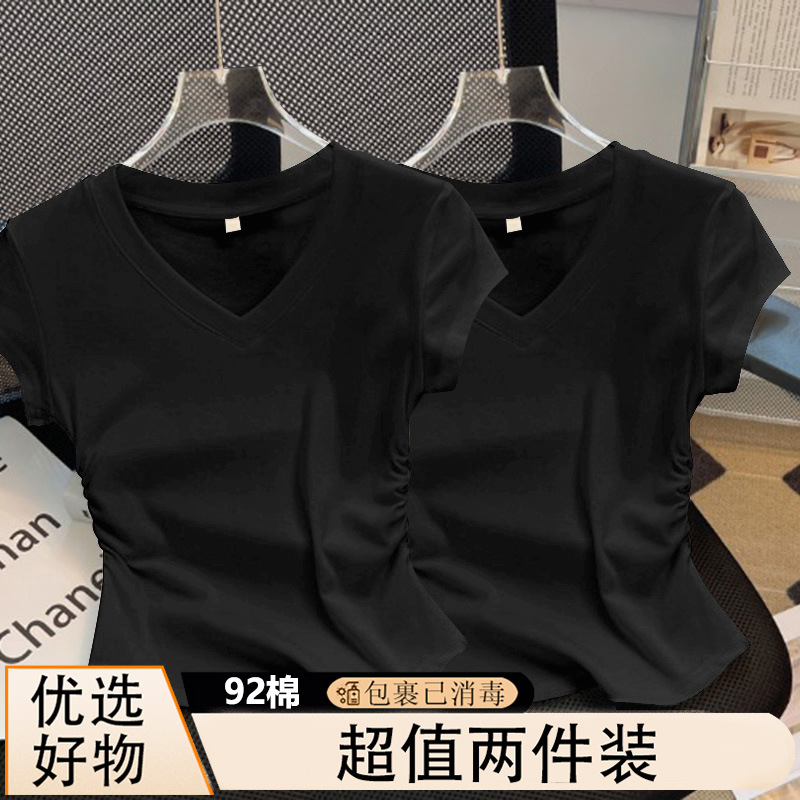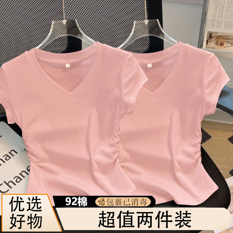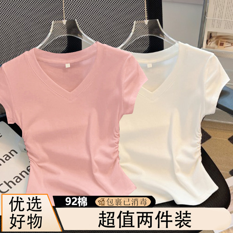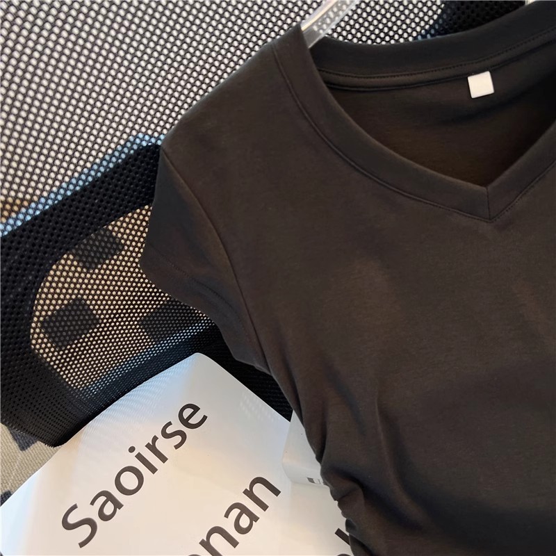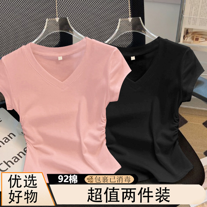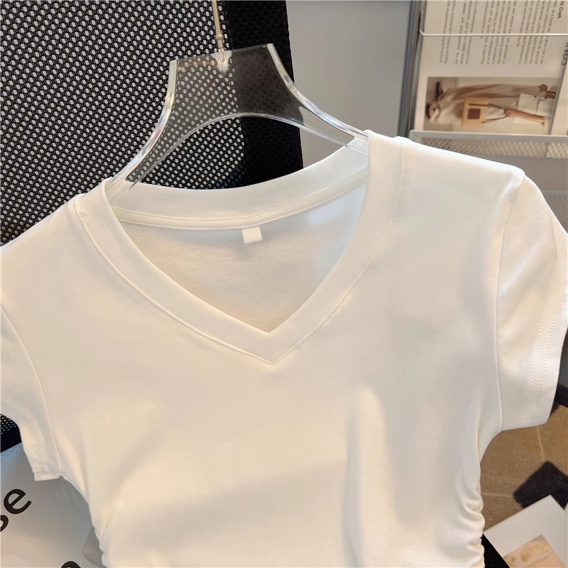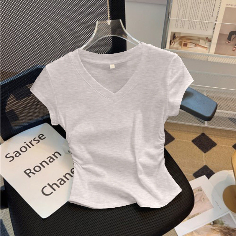 2025 여름 새로운 코튼 V 넥 슬림 핏 반팔 티셔츠 여성용 스파이스 걸스 숄더베이스 셔츠 주름 허리 탑 옷스토어 가기