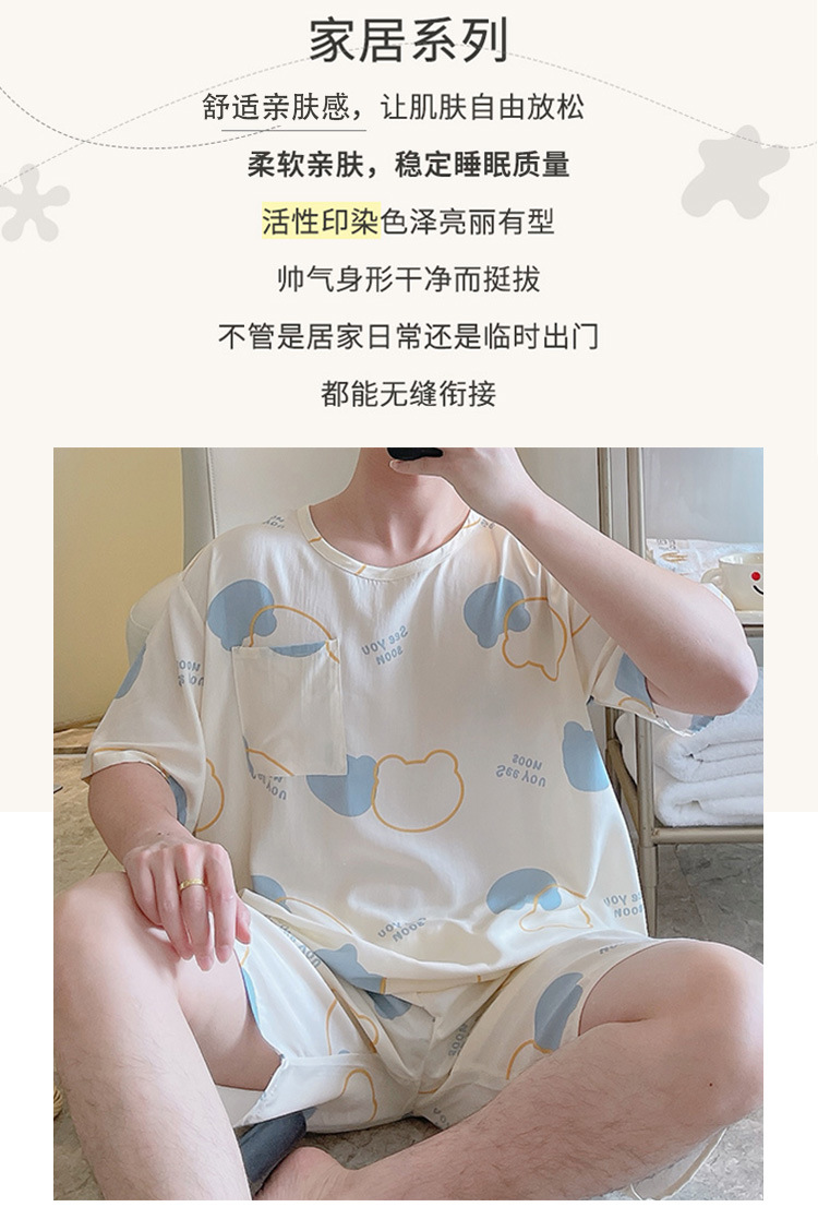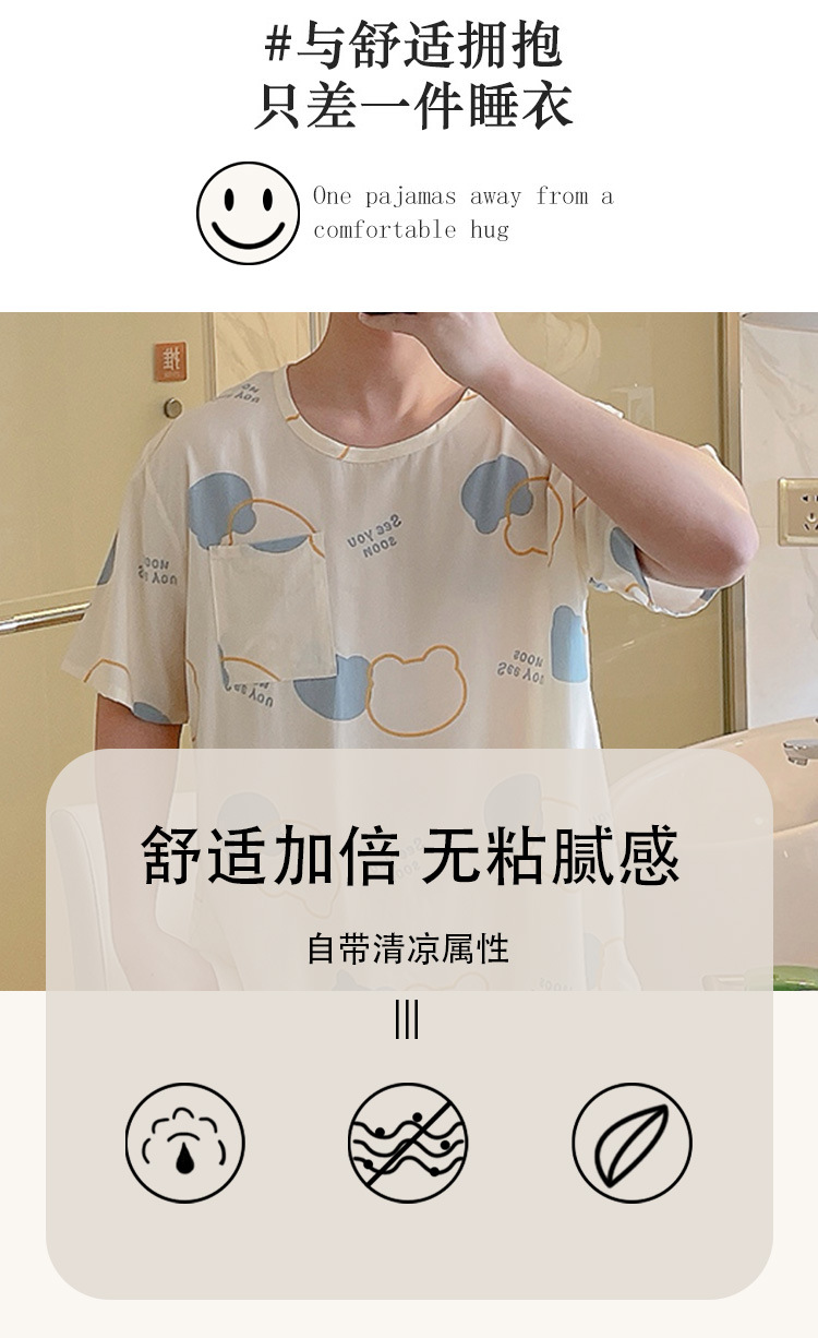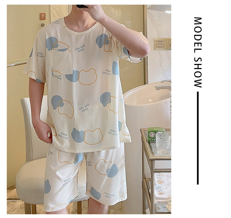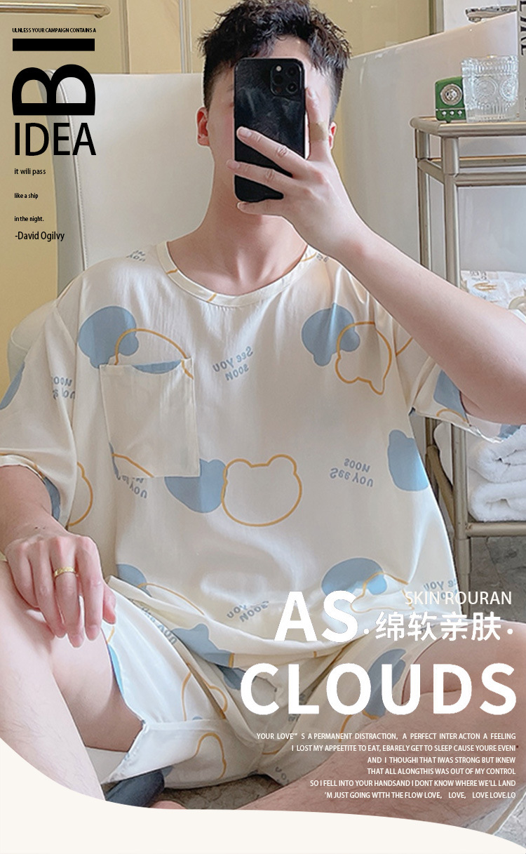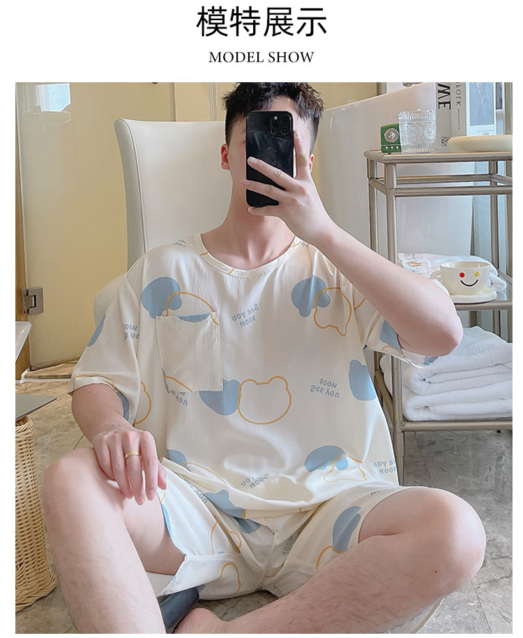 면 실크 파자마 남자 여름 십대 및 고등학생을위한 우아한 반팔 홈 의류 느슨한 플러스 사이즈 만화 얇은 세트스토어 가기