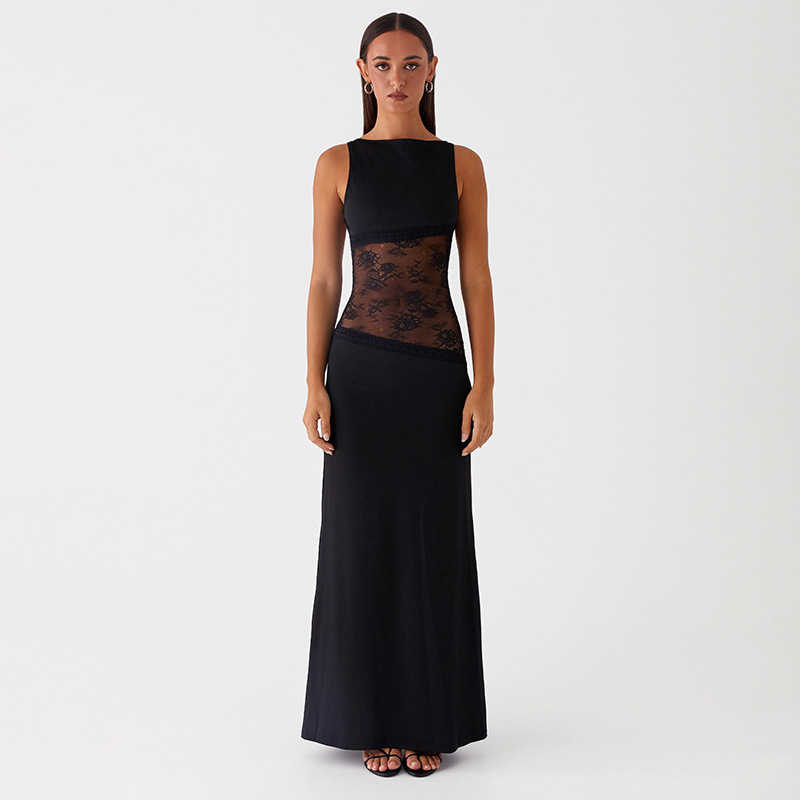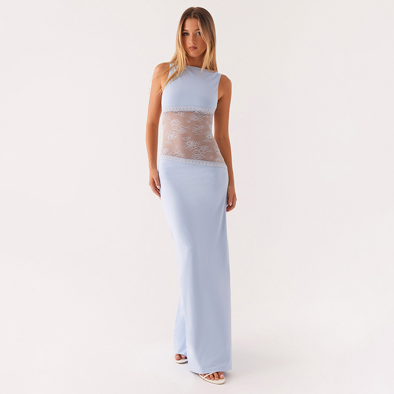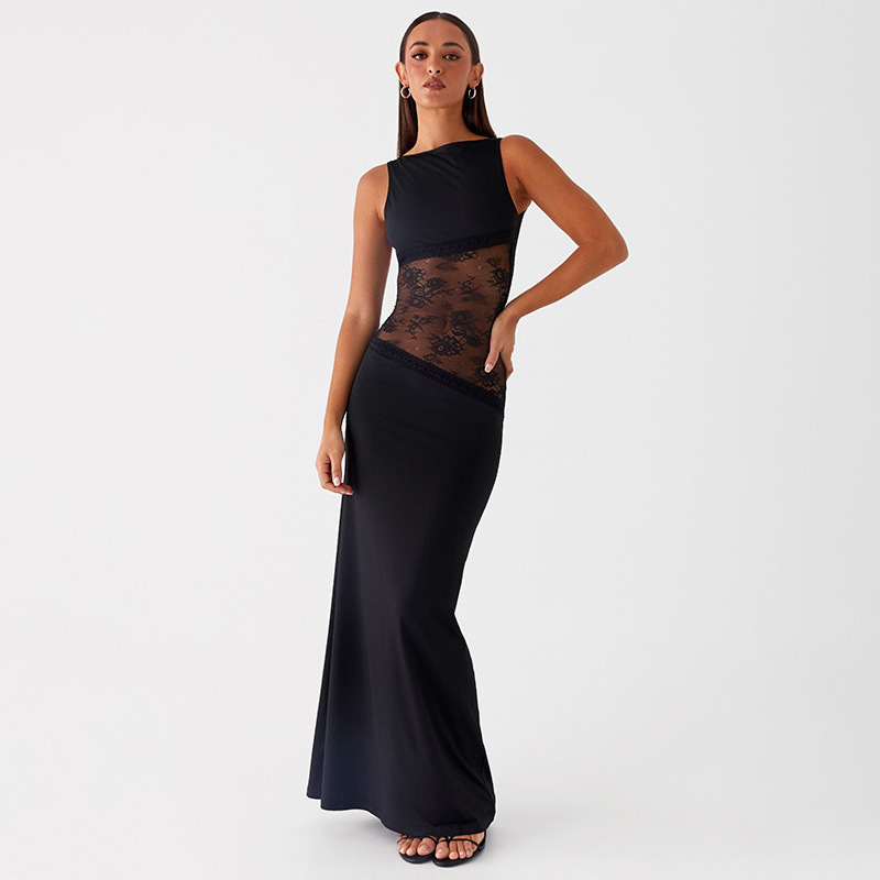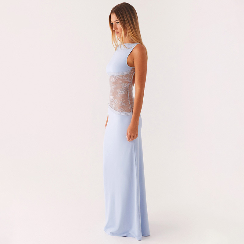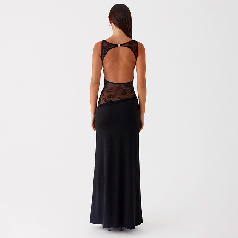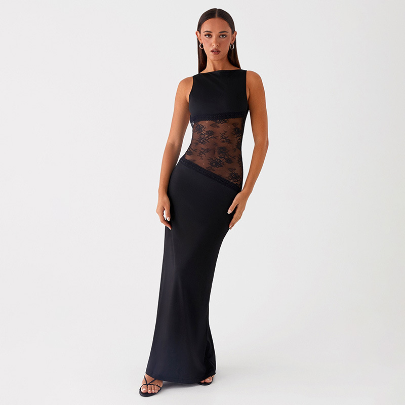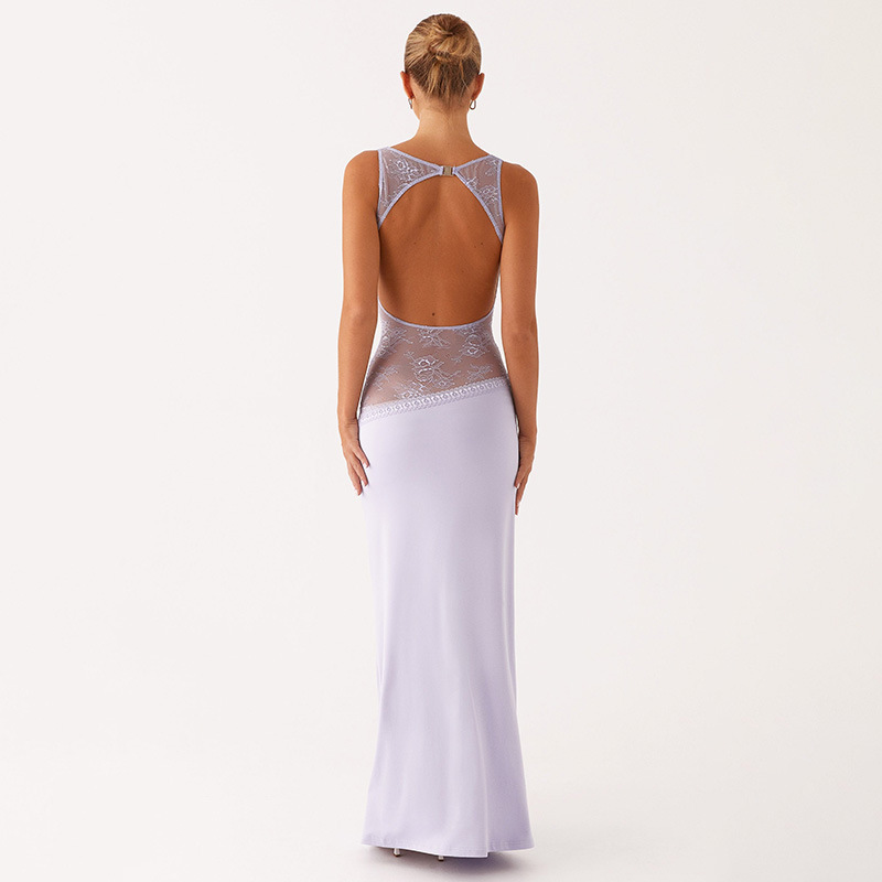 2025 새로운 유럽과 미국의 국경 간 여름 섹시한 슬림 핏 레이스 새틴 바느질 백리스 긴 원피스 슬리밍 원피스 여성스토어 가기