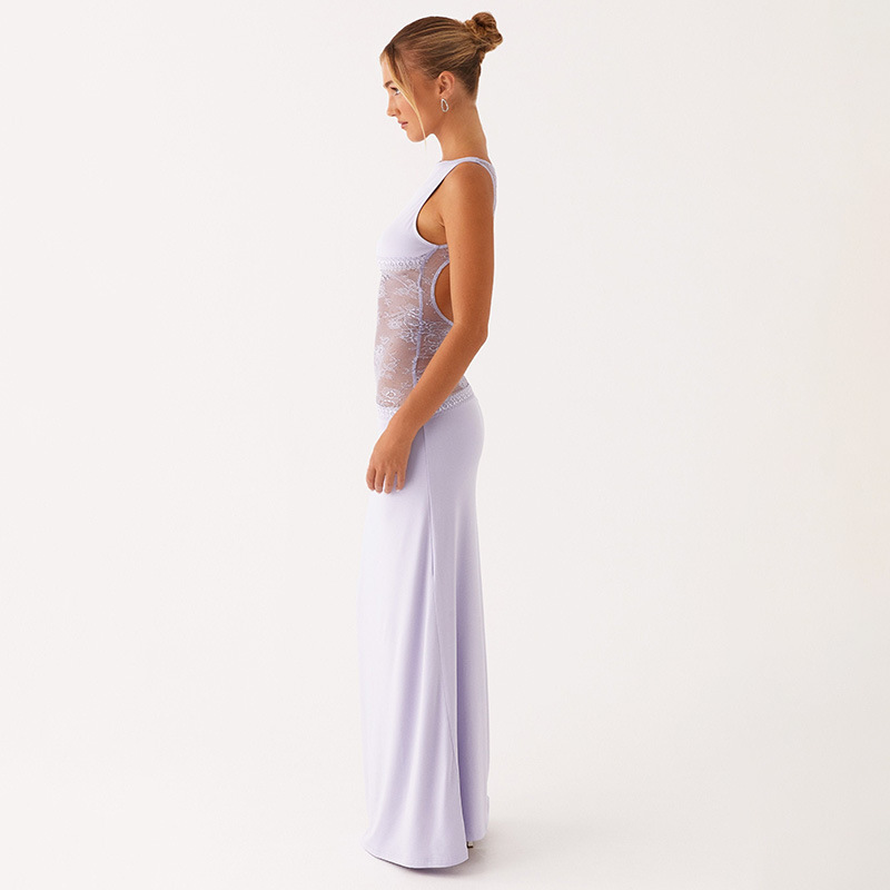2025 새로운 유럽과 미국의 국경 간 여름 섹시한 슬림 핏 레이스 새틴 바느질 백리스 긴 원피스 슬리밍 원피스 여성